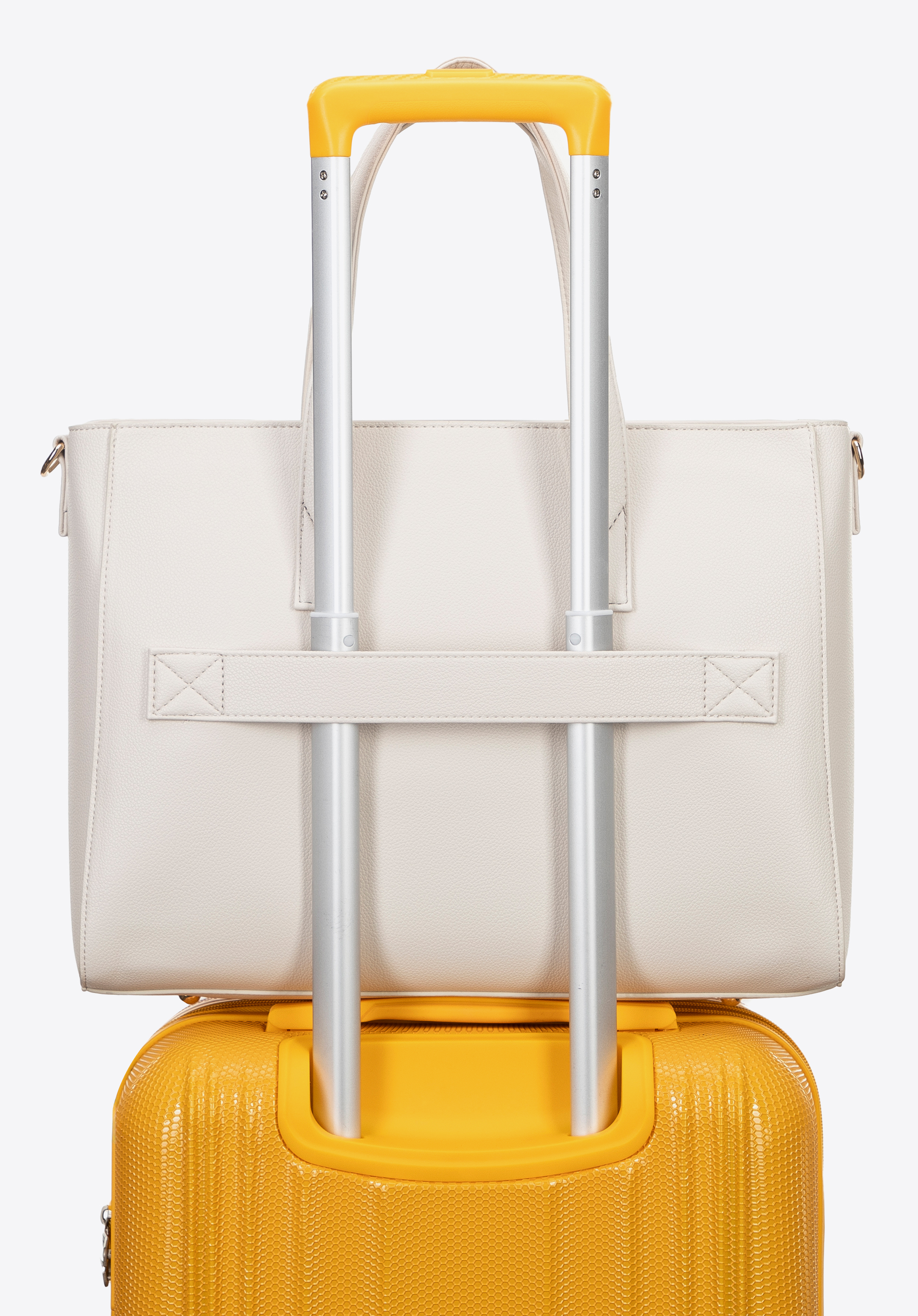 - Csomagtartó pánt a hátoldalon: Könnyen rögzíthető a bőrönd teleszkópos fogantyújához.