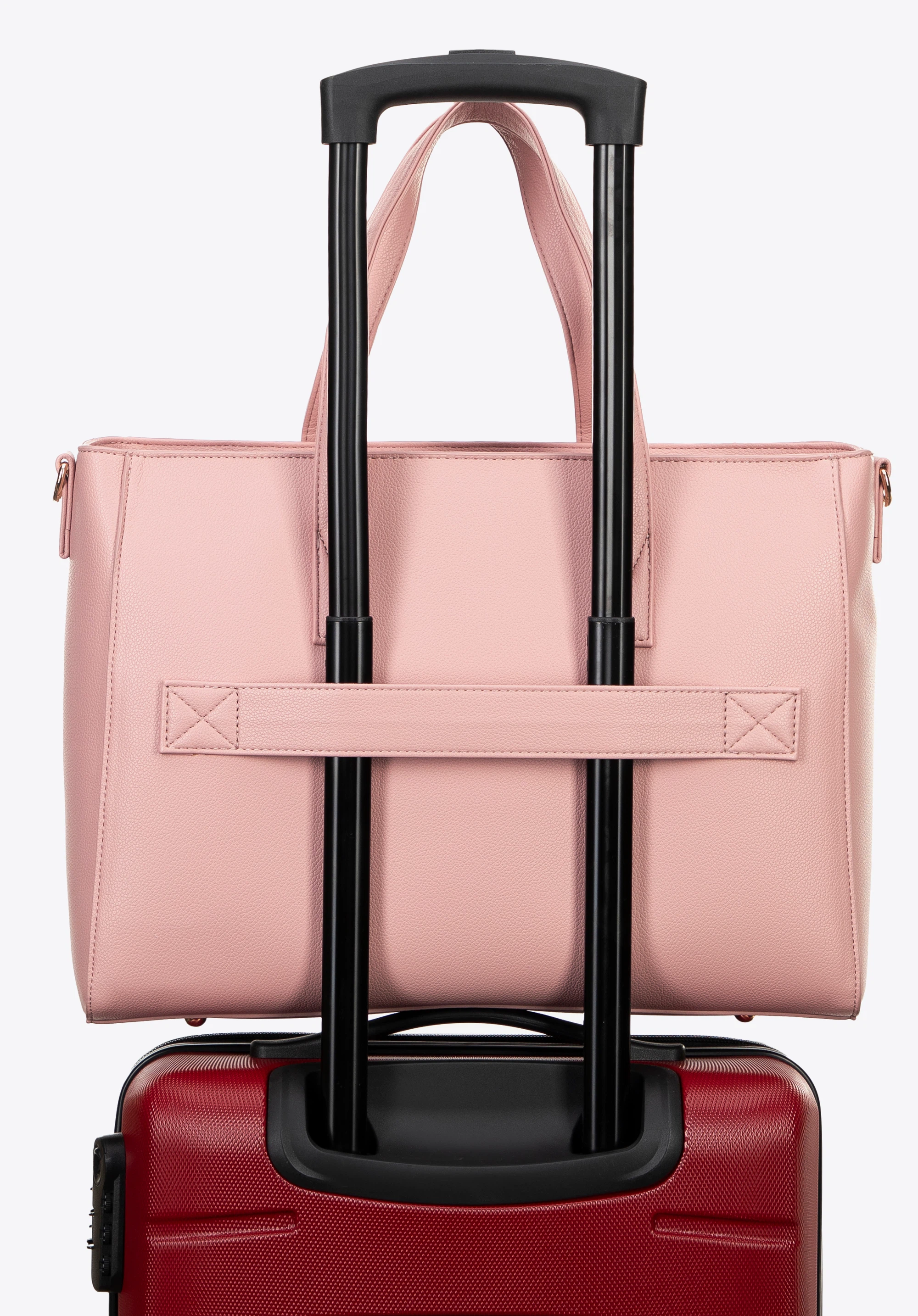 - Csomagtartó pánt a hátoldalon: Könnyen rögzíthető a bőrönd teleszkópos fogantyújához.