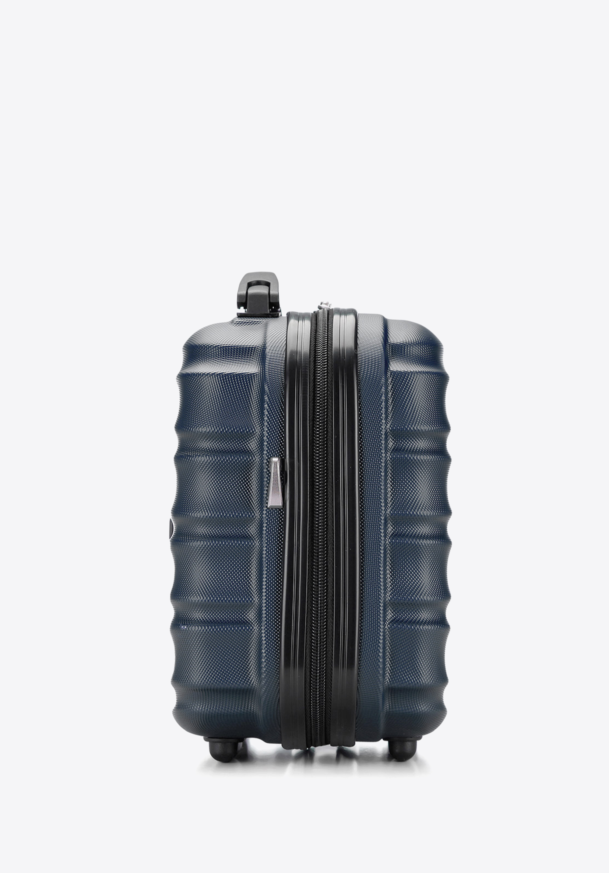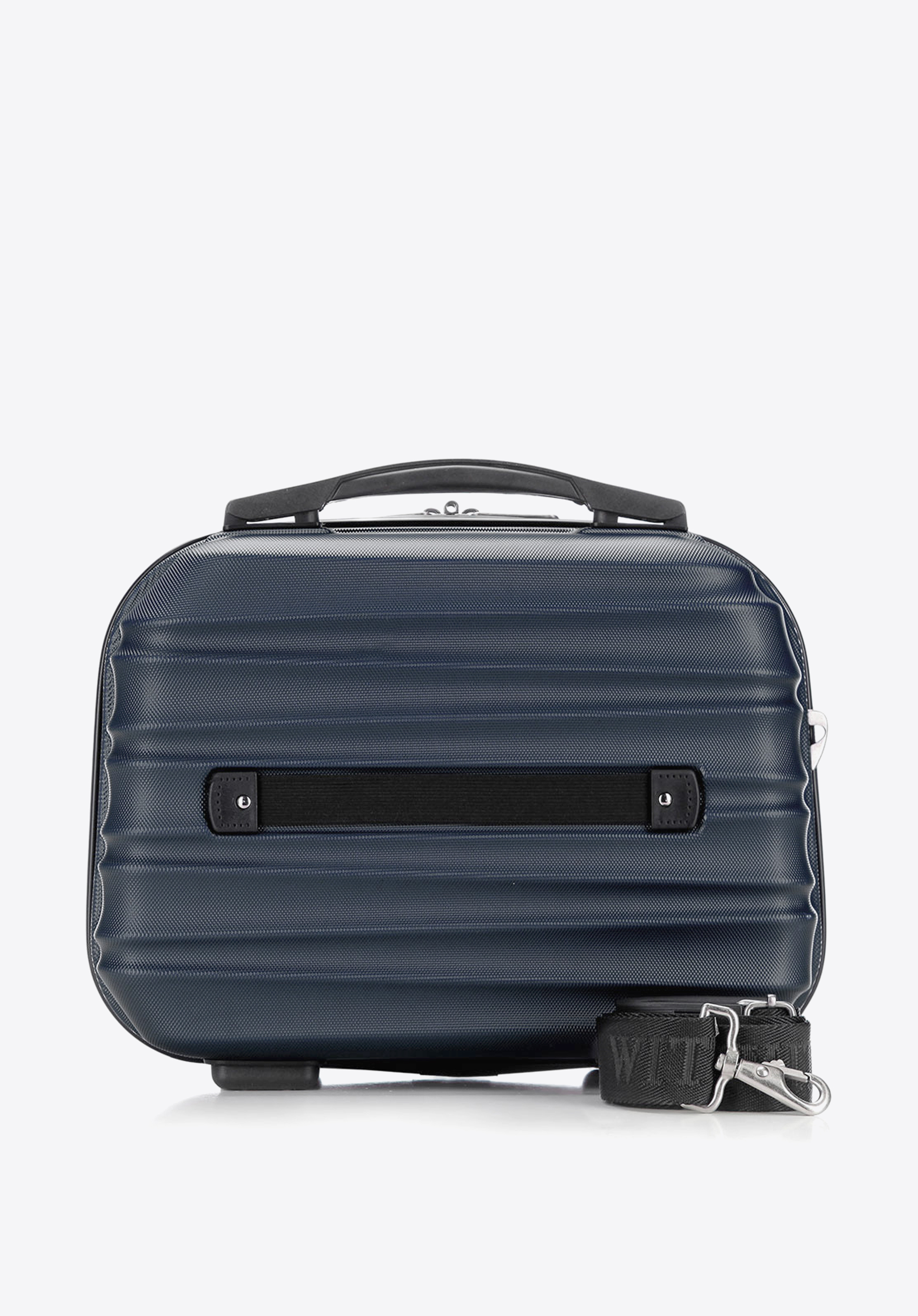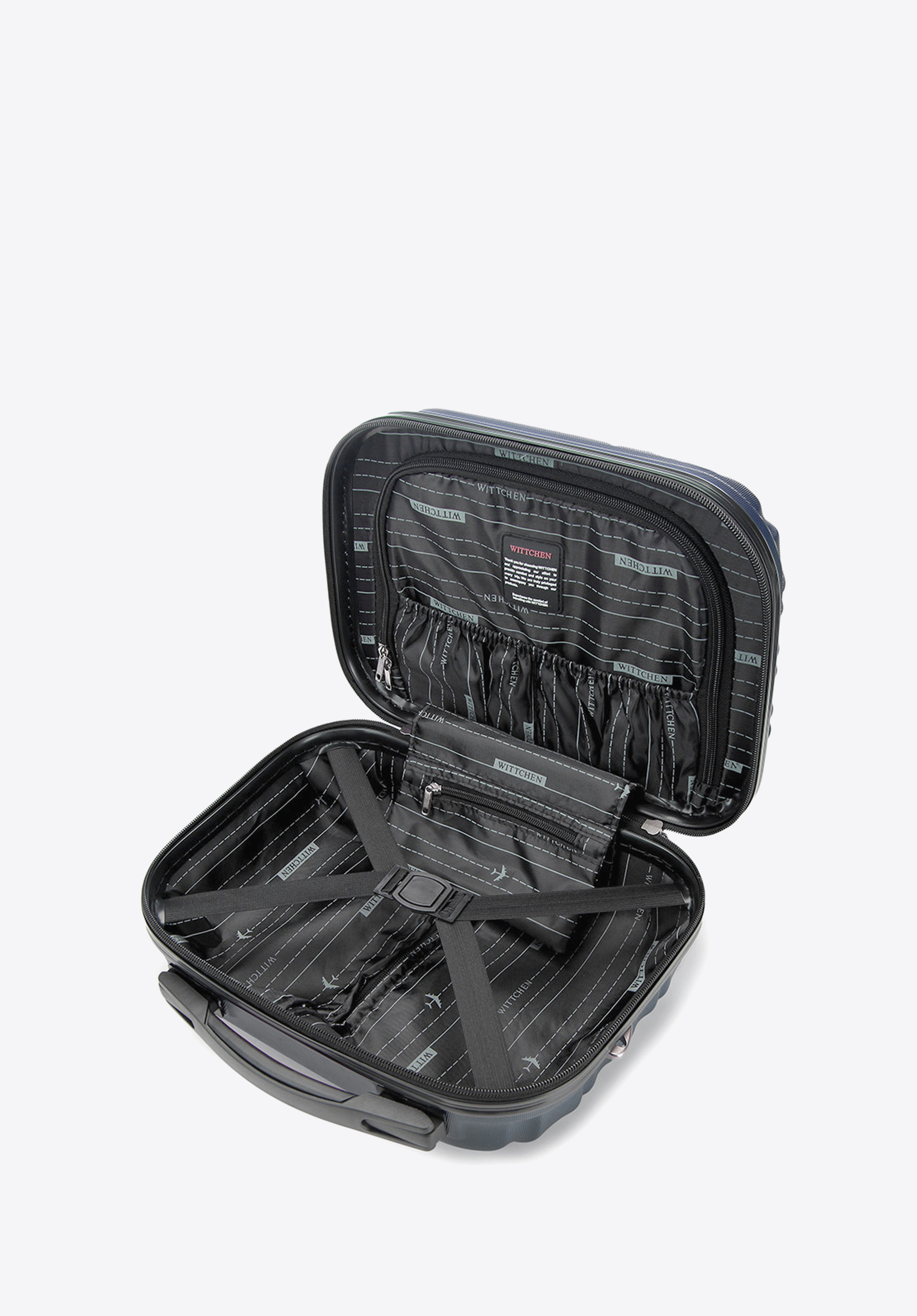 Utazási kozmetikai táska ABS anyagból . A jellegzetes szerkezetű felület karcállóbbá teszi a kozmetikai táskát, ugyanakkor modern kialakítású. Funkcionális modell egy fogantyúval, amely megkönnyíti a kozmetikai táska hordozását, egy levehető, állítható pánttal és egy rugalmas övvel rendelkezik, amely lehetővé teszi a bőrönd fogantyújához való rögzítést.