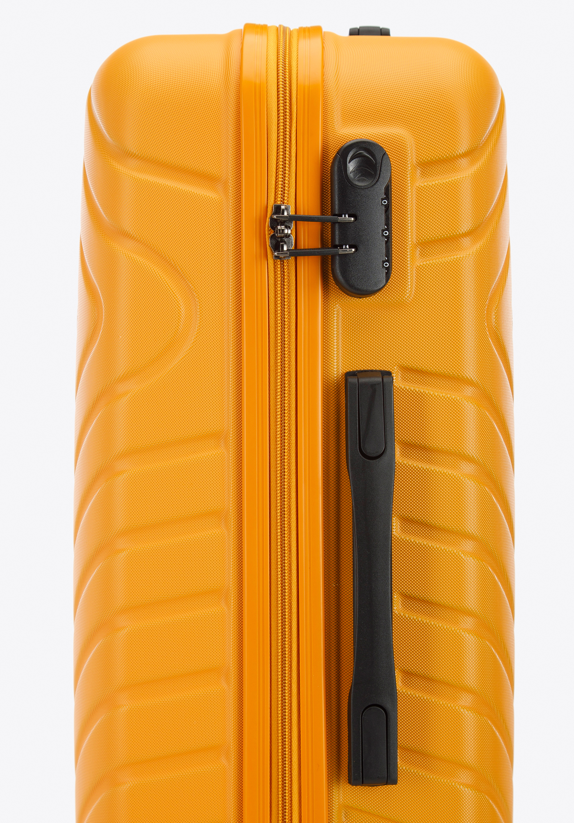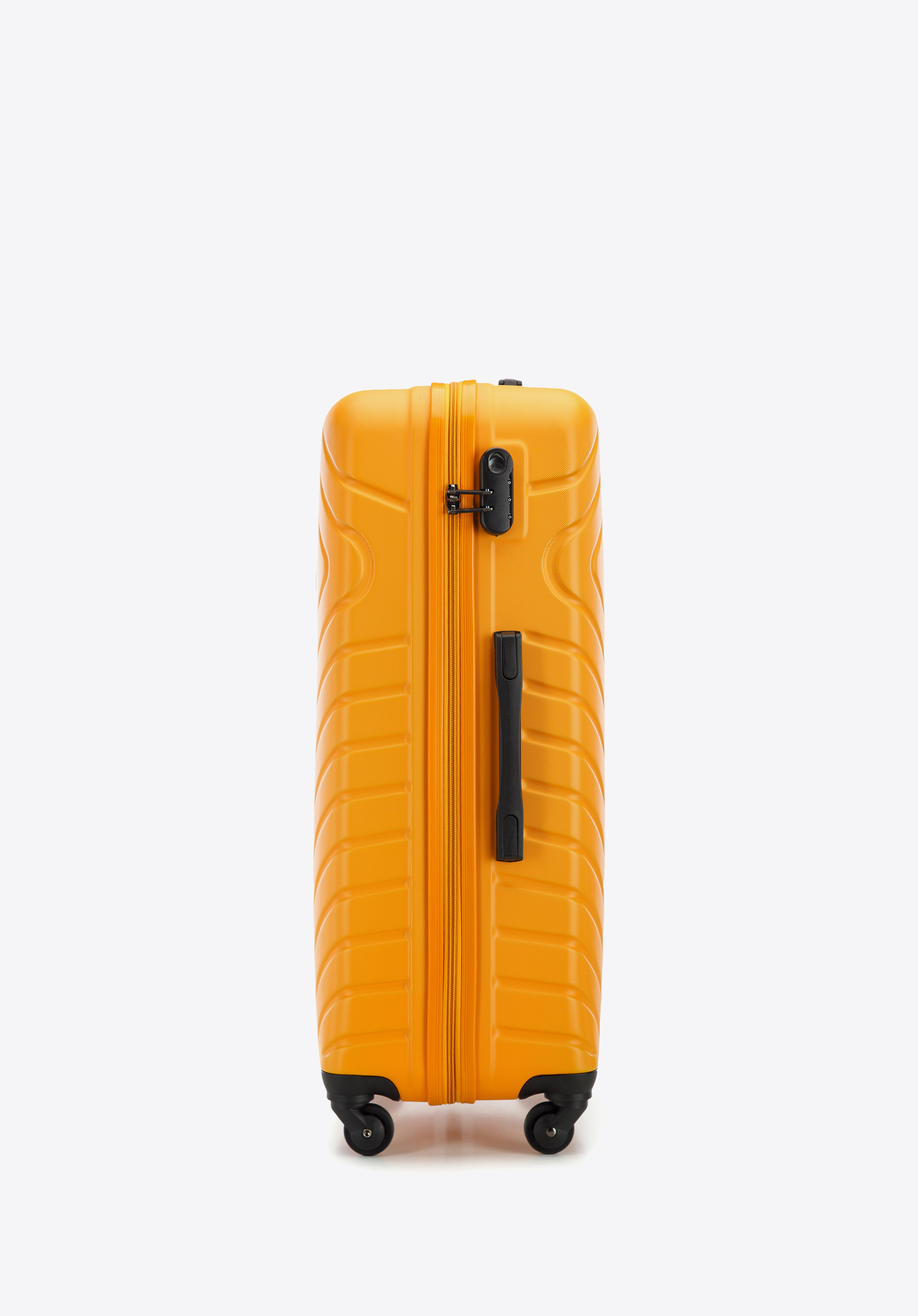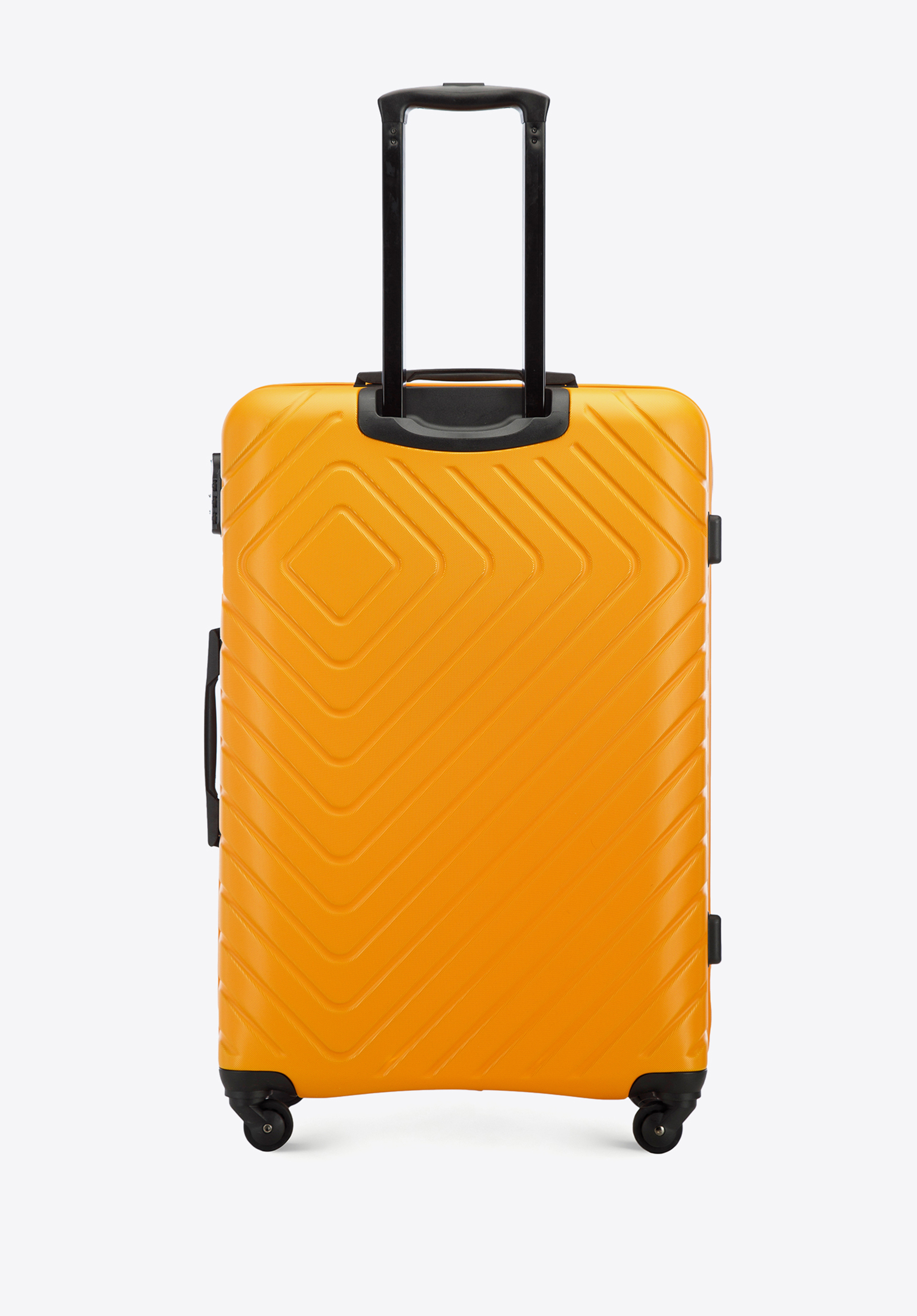 Ez a nagy bőrönd a tökéletes kiegészítő: praktikus és nagyon stílusos. Egyszerű, geometrikus dombornyomással díszített. A teleszkópos fogantyúnak és a négy szimpla keréknek köszönhetően kényelmes lesz haladni vele. Ez a modell érdekes textúrájú ABS-ből készült .Tágas, két részre osztható belsővel rendelkezik, amelybe könnyedén bepakolhat minden szükséges dolgot és rendet tarthat. A geometrikus dombornyomású ABS-ből készült nagy bőrönd sok-sok hosszú nyaraláshoz remek választás.