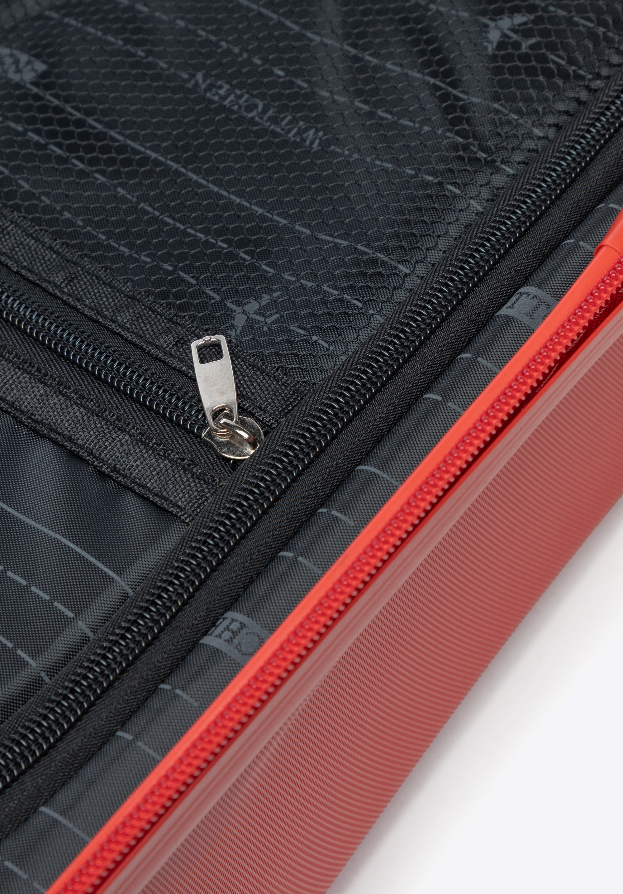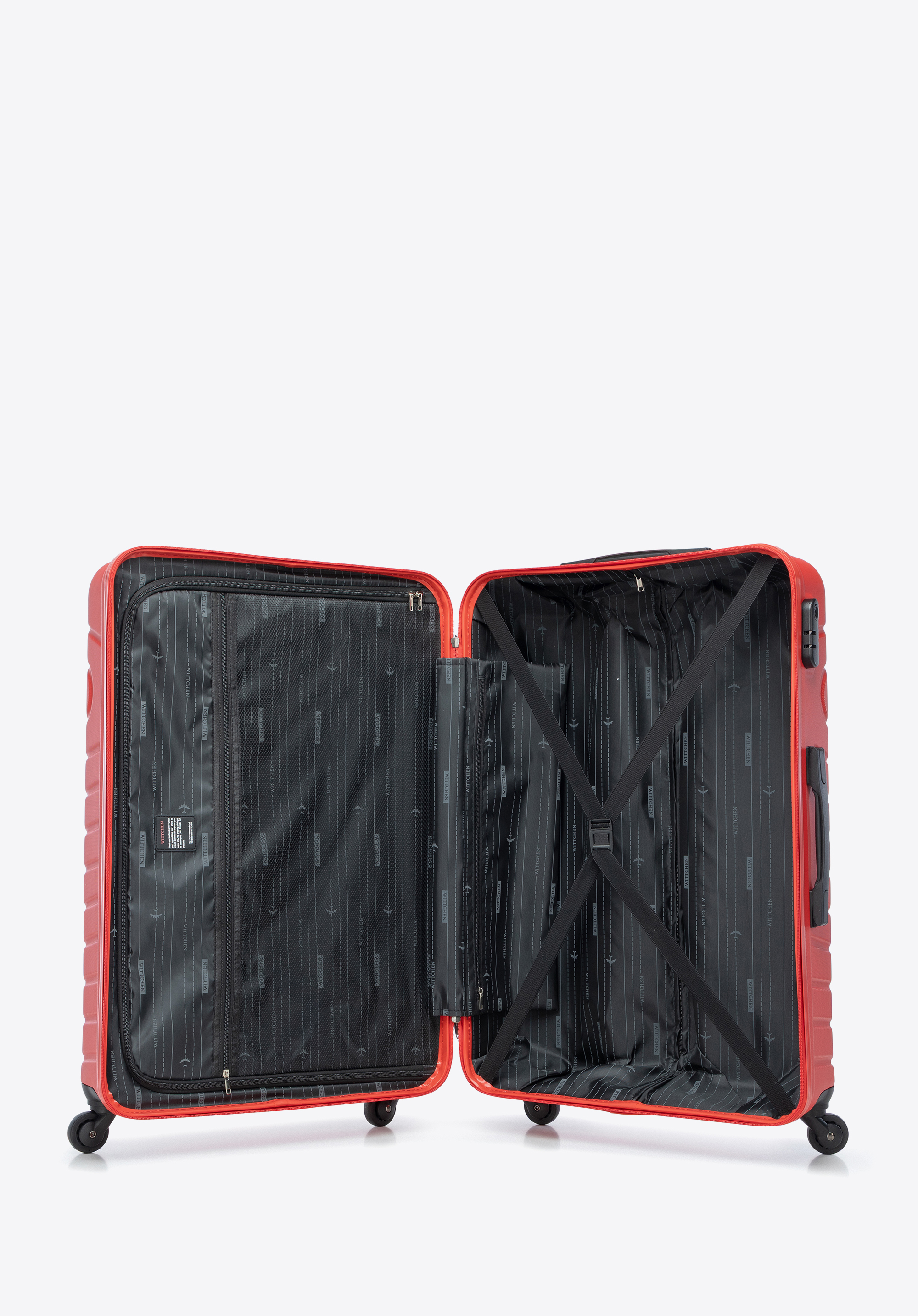 Ez a nagy bőrönd a tökéletes kiegészítő: praktikus és nagyon stílusos. Egyszerű, geometrikus dombornyomással díszített. A teleszkópos fogantyúnak és a négy szimpla keréknek köszönhetően kényelmes lesz haladni vele. Ez a modell érdekes textúrájú ABS-ből készült .Tágas, két részre osztható belsővel rendelkezik, amelybe könnyedén bepakolhat minden szükséges dolgot és rendet tarthat. A geometrikus dombornyomású ABS-ből készült nagy bőrönd sok-sok hosszú nyaraláshoz remek választás.
