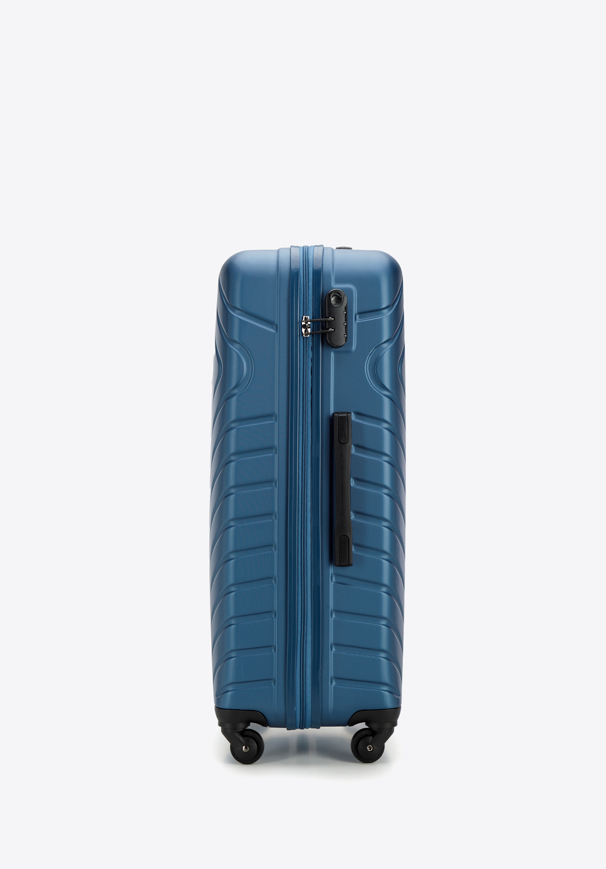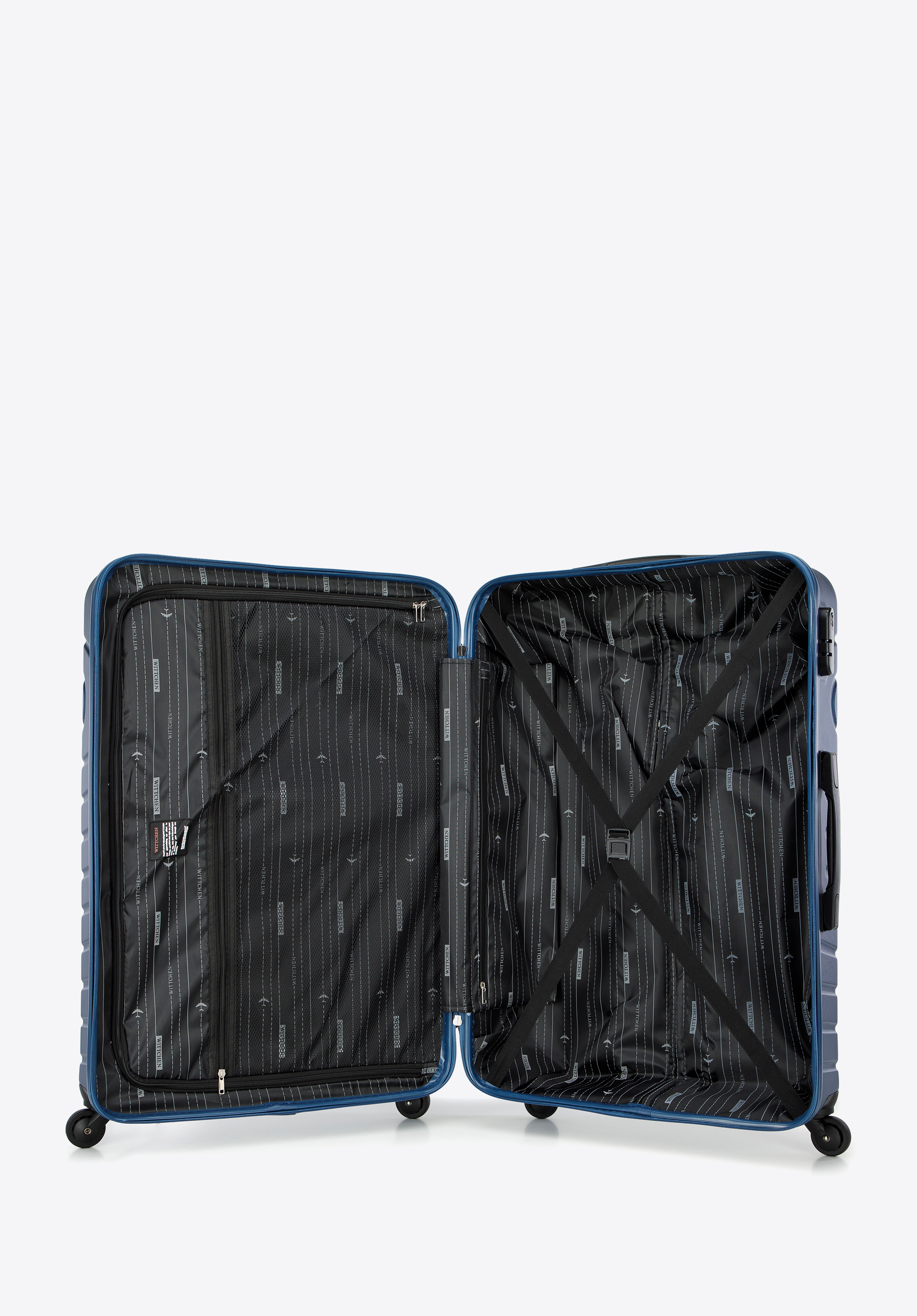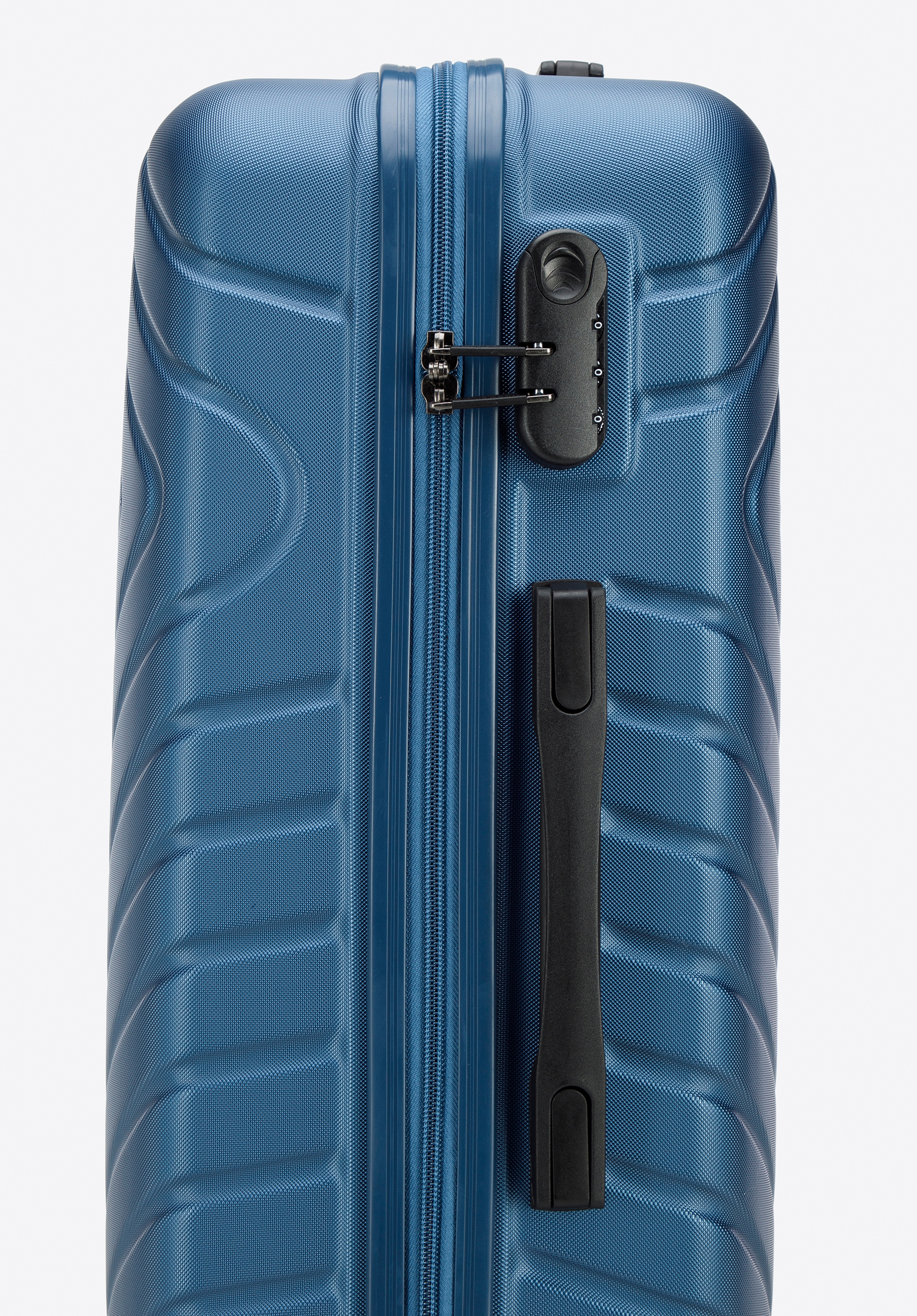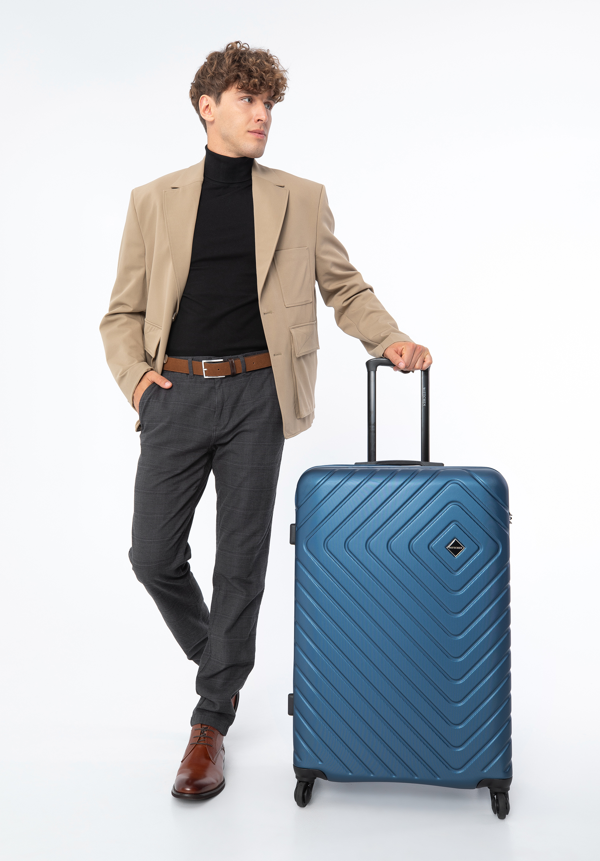 Ez a nagy bőrönd a tökéletes kiegészítő: praktikus és nagyon stílusos. Egyszerű, geometrikus dombornyomással díszített. A teleszkópos fogantyúnak és a négy szimpla keréknek köszönhetően kényelmes lesz haladni vele. Ez a modell érdekes textúrájú ABS-ből készült .Tágas, két részre osztható belsővel rendelkezik, amelybe könnyedén bepakolhat minden szükséges dolgot és rendet tarthat. A geometrikus dombornyomású ABS-ből készült nagy bőrönd sok-sok hosszú nyaraláshoz remek választás.