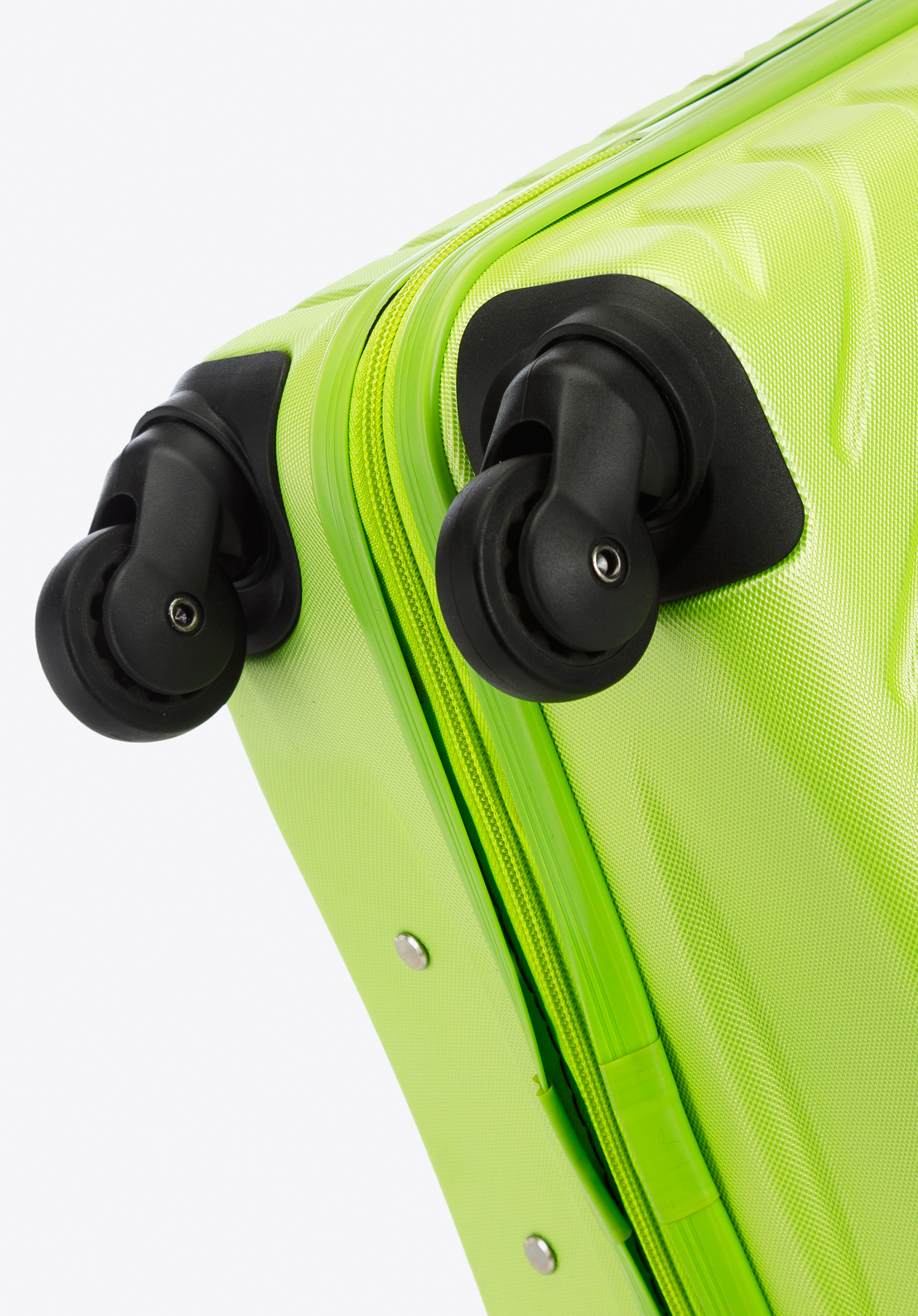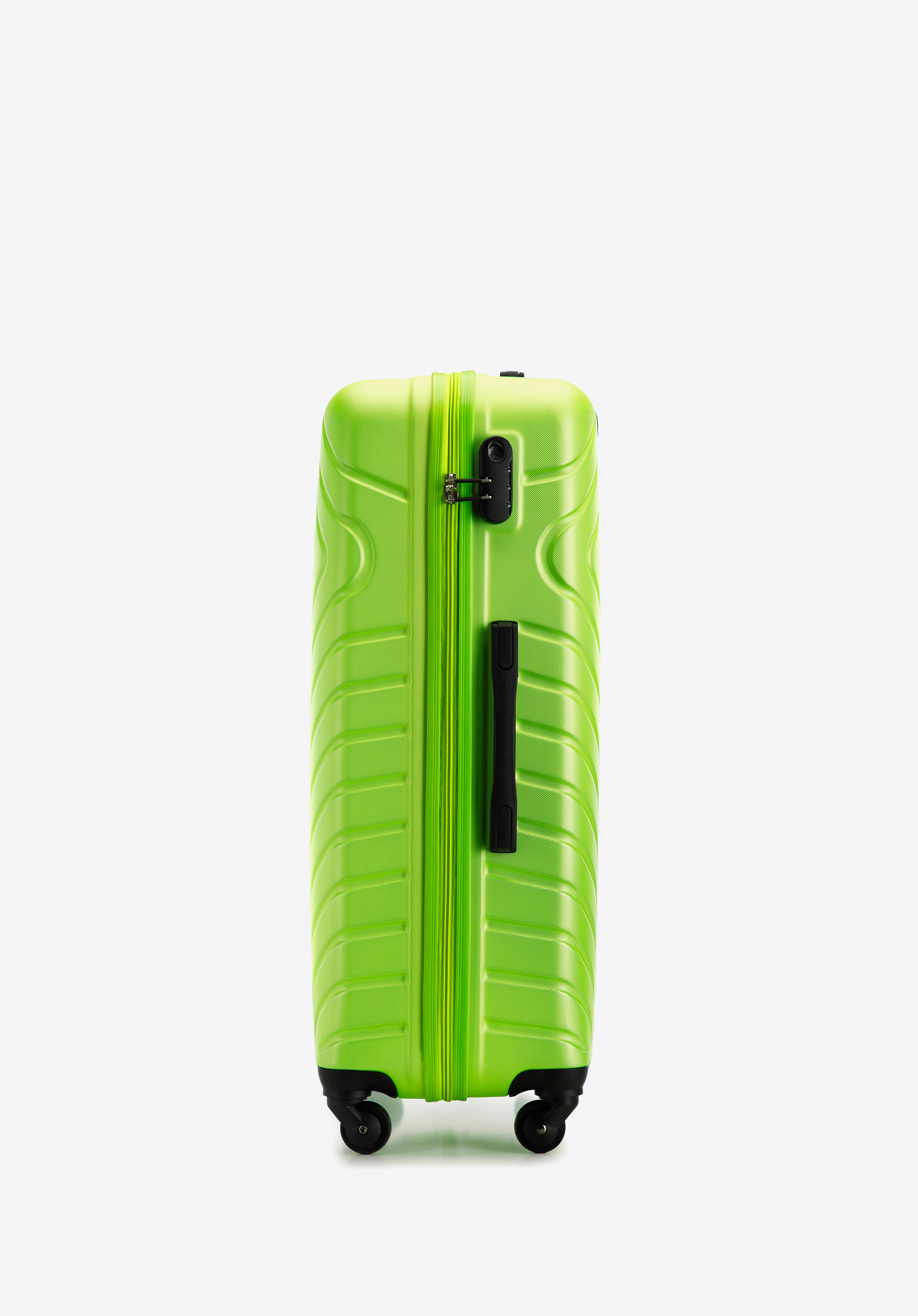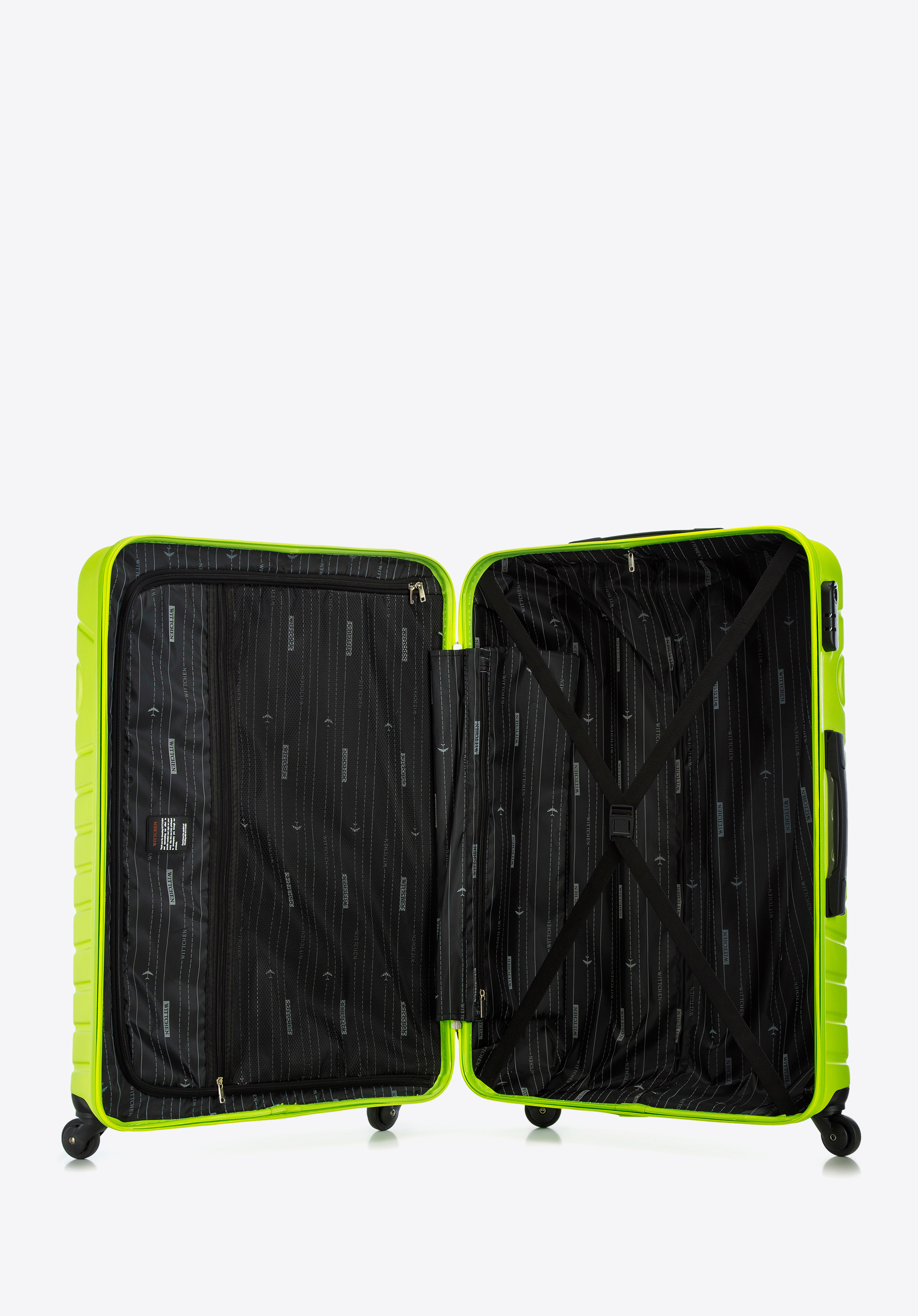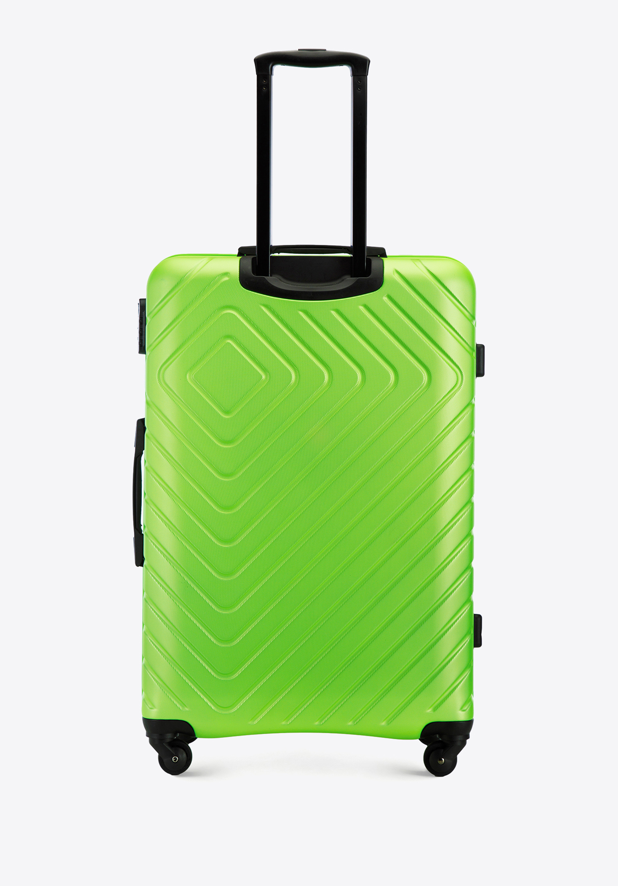 Ez a nagy bőrönd a tökéletes kiegészítő: praktikus és nagyon stílusos. Egyszerű, geometrikus dombornyomással díszített. A teleszkópos fogantyúnak és a négy szimpla keréknek köszönhetően kényelmes lesz haladni vele. Ez a modell érdekes textúrájú ABS-ből készült .Tágas, két részre osztható belsővel rendelkezik, amelybe könnyedén bepakolhat minden szükséges dolgot és rendet tarthat. A geometrikus dombornyomású ABS-ből készült nagy bőrönd sok-sok hosszú nyaraláshoz remek választás.
