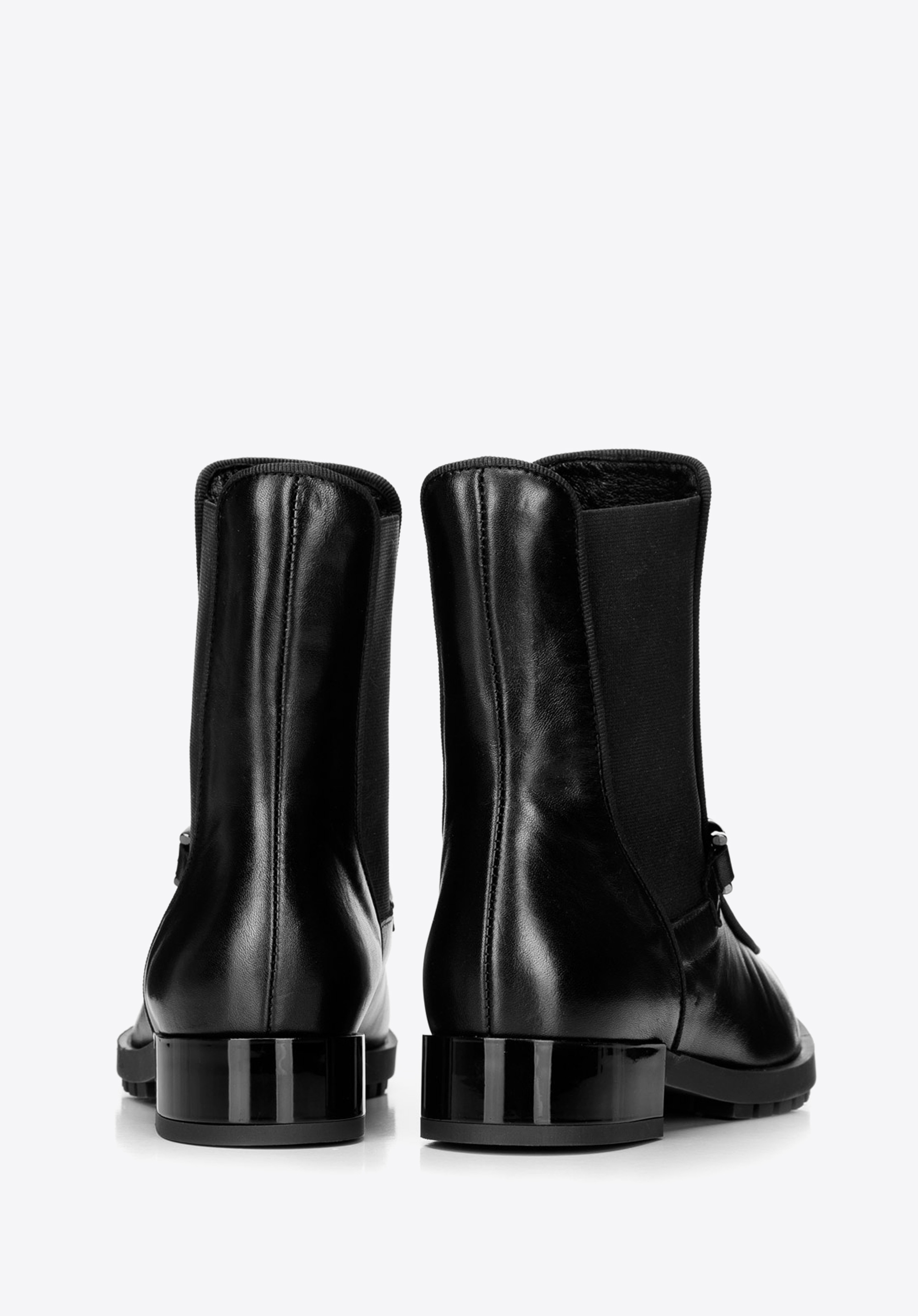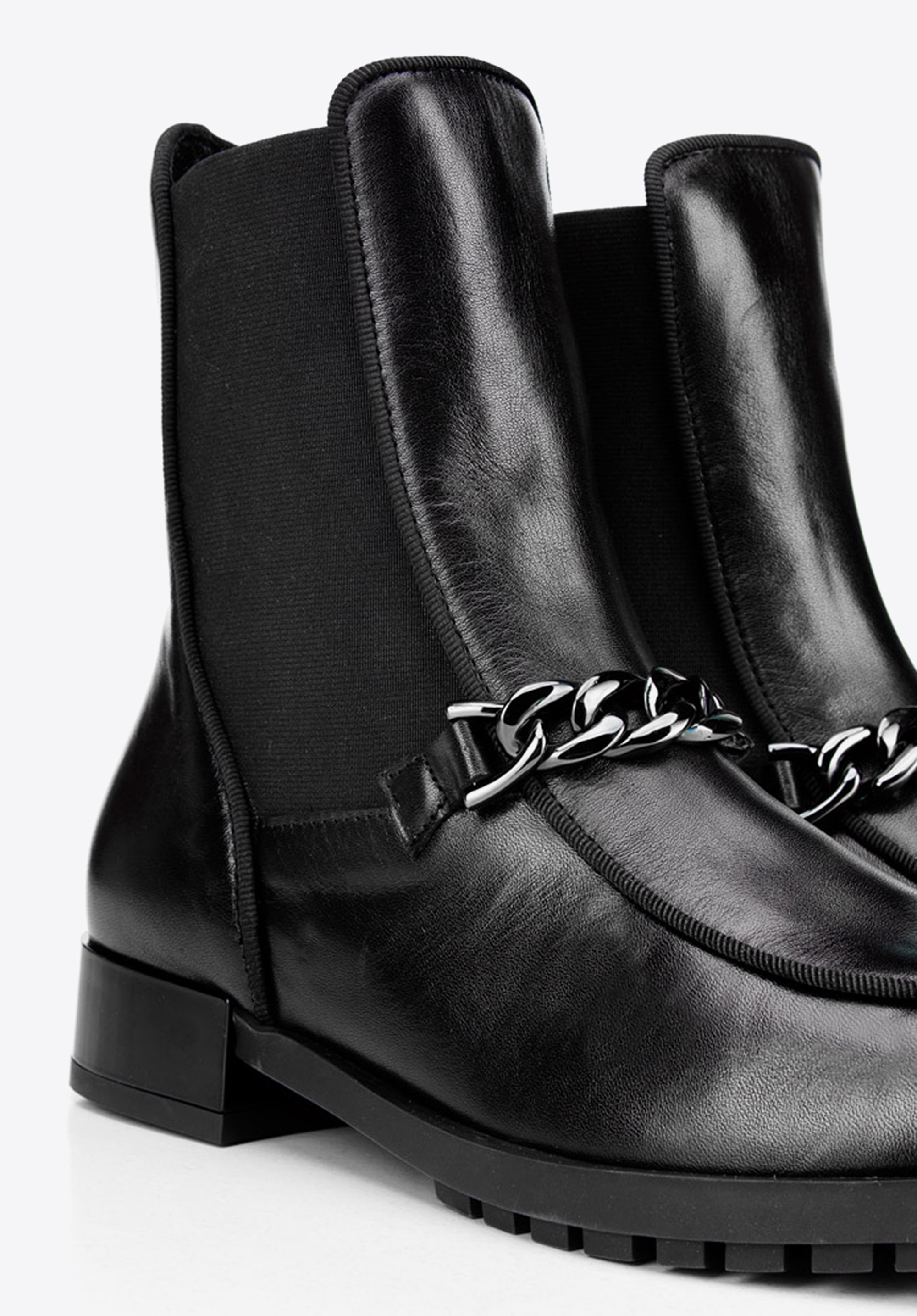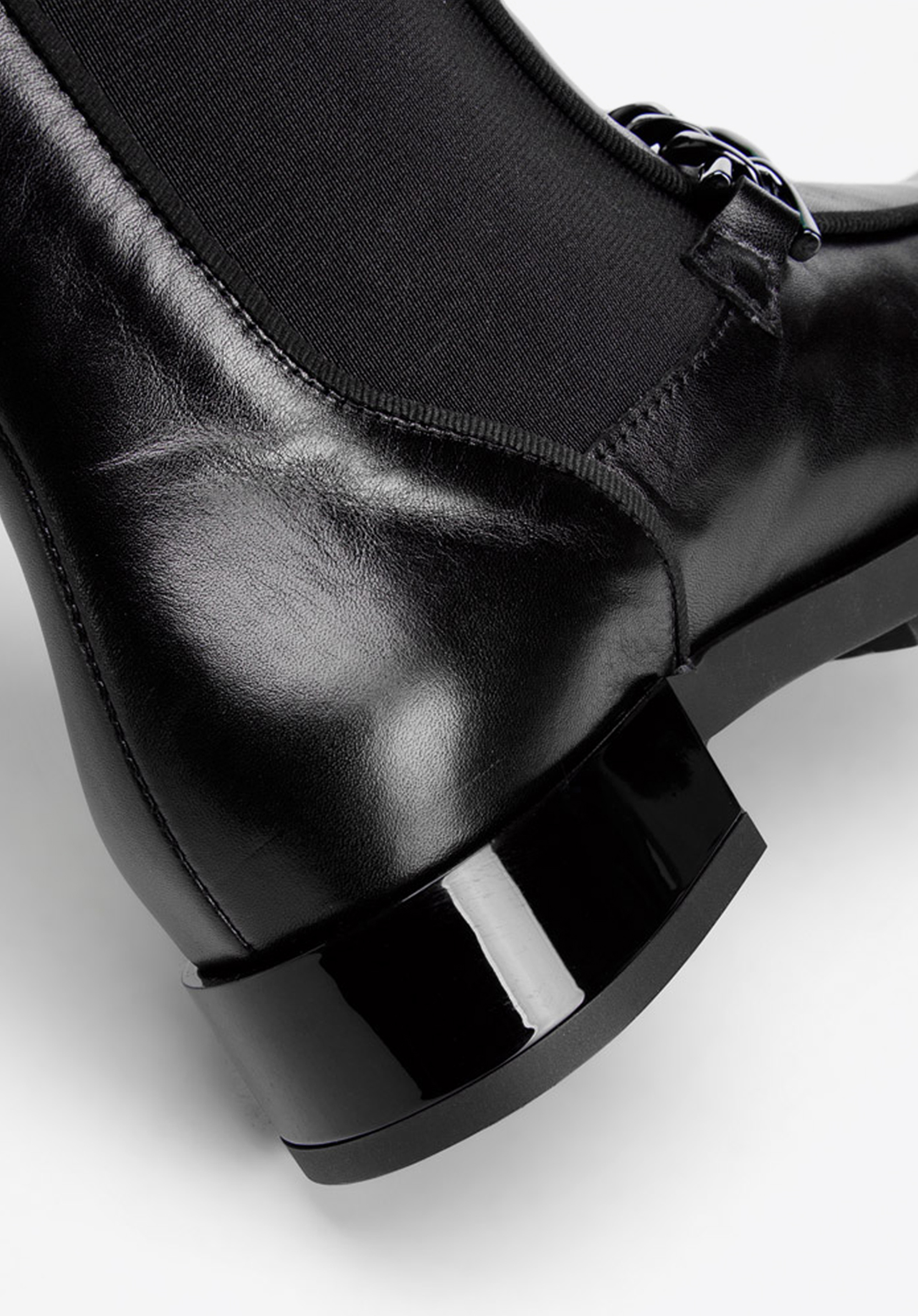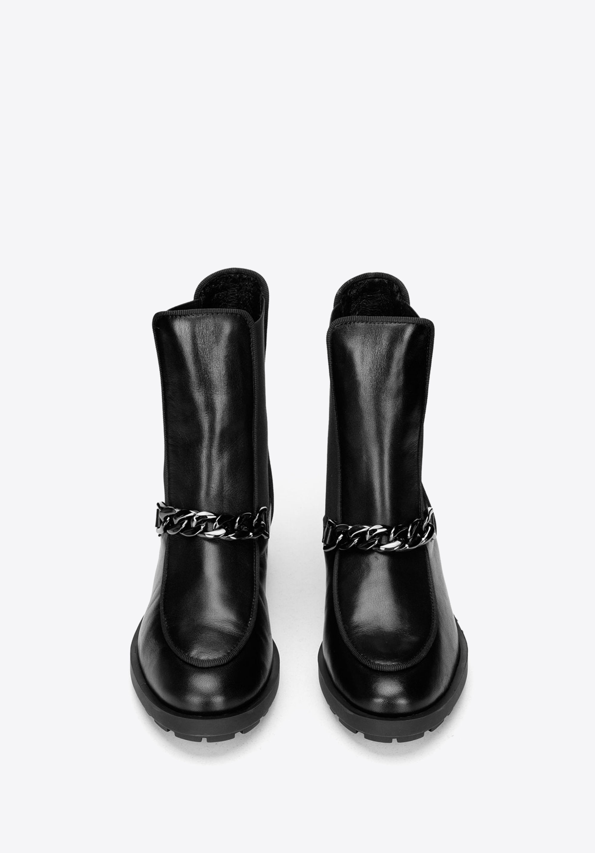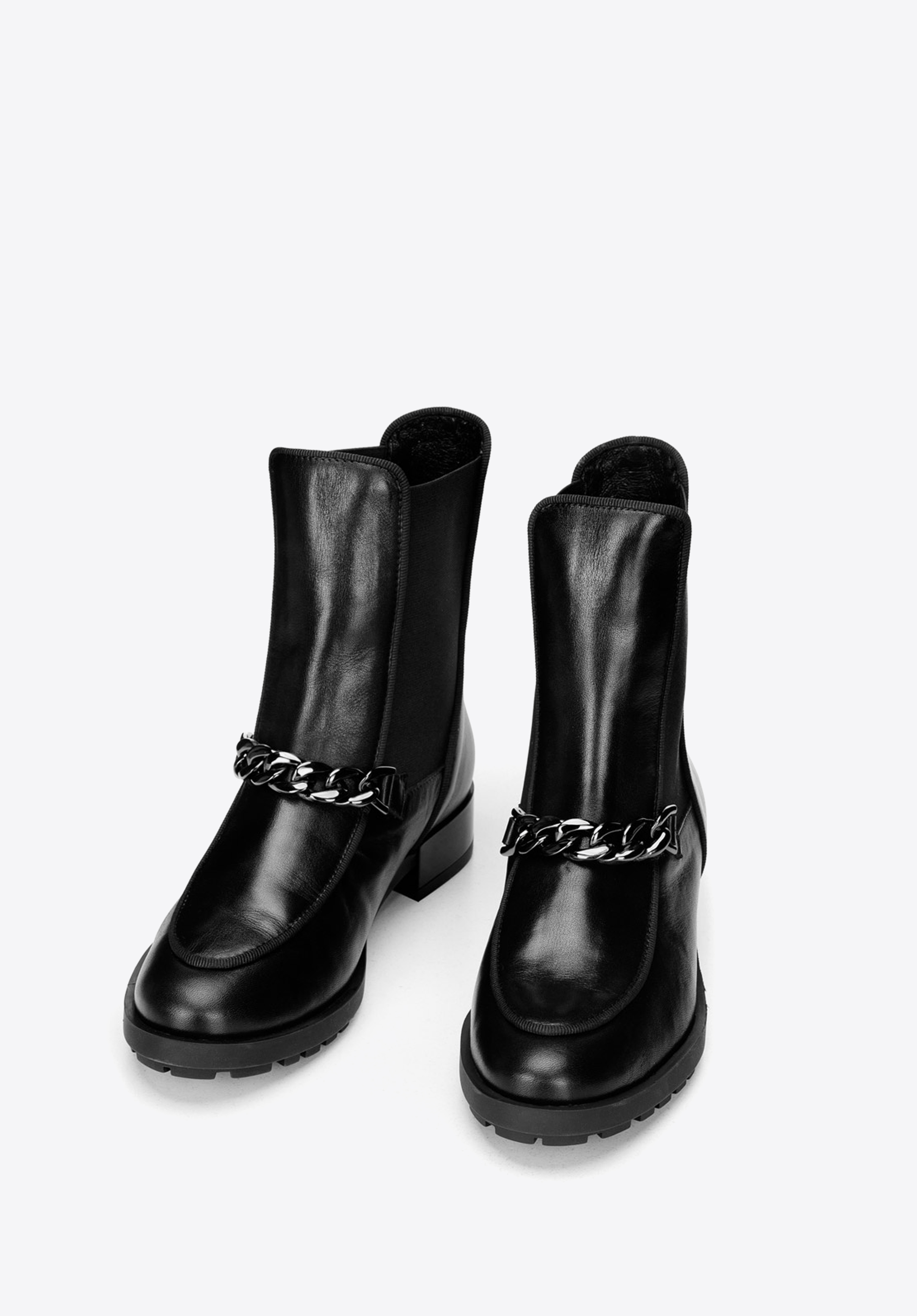 Női bőr csizma gumirozott oldalán és lánccal.