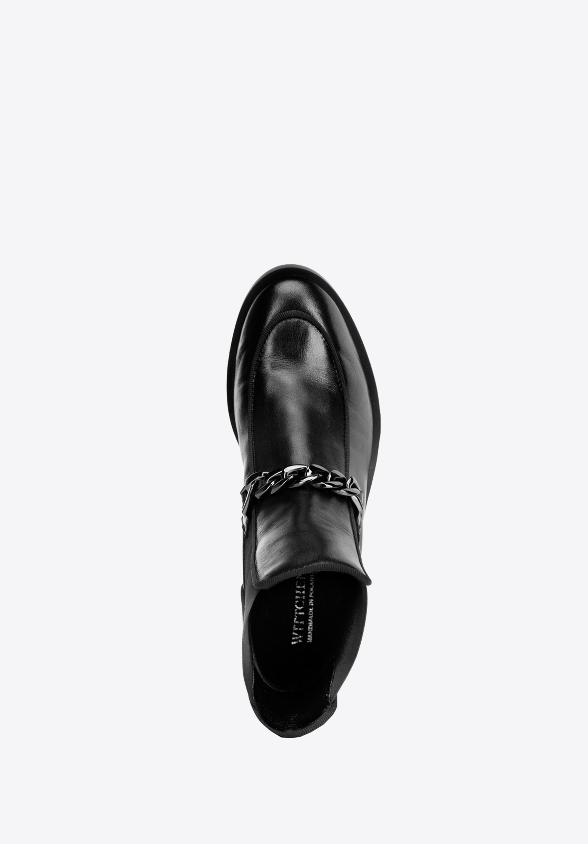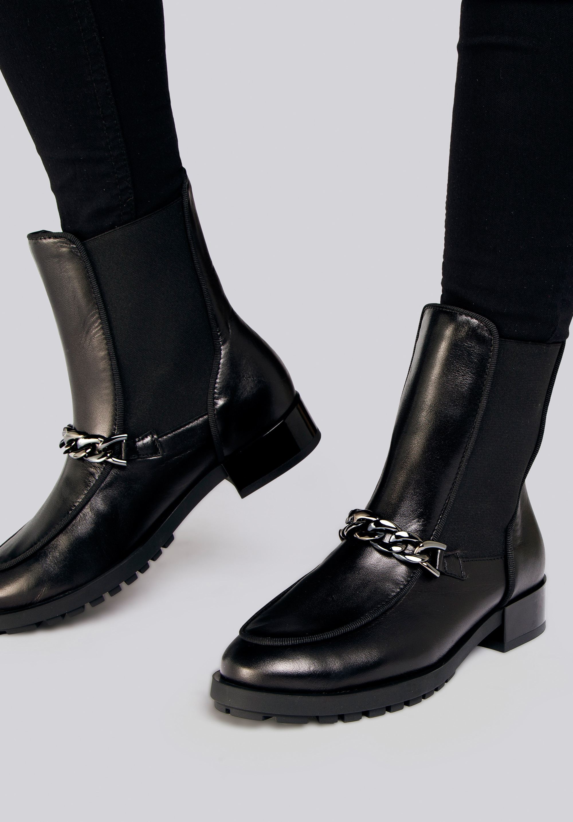 Stílusos, mégis praktikus cipő őszre. Tele vannak divatos elemekkel: finom lánc az elején és elasztikus betétek az oldalán, amelyek nemcsak lenyűgözően néznek ki, hanem könnyen felvehetők is. A cipő elülső részét a mokaszinoktól kölcsönzött félköríves, peremes varrással varrták. A csúszásgátló talp csúszós vagy nedves felületen is bizonyítja értékét. Másrészt a kis lakkozott sarok 3 cm magas, ami a legjobb a lábadnak.