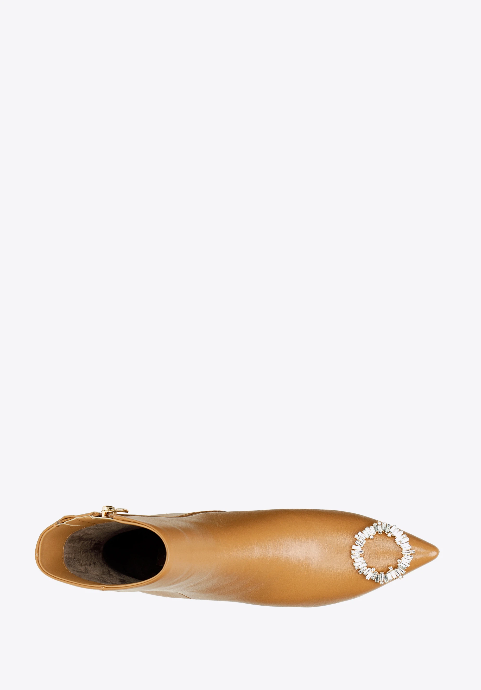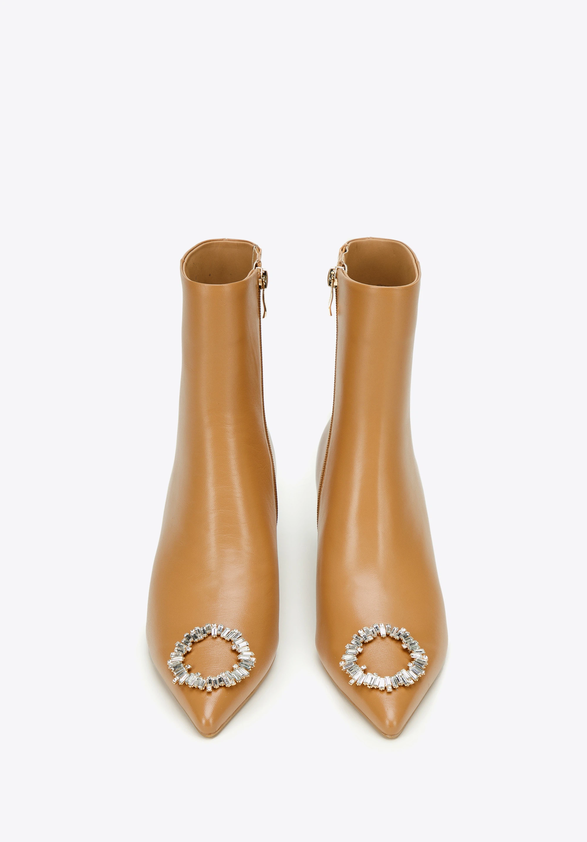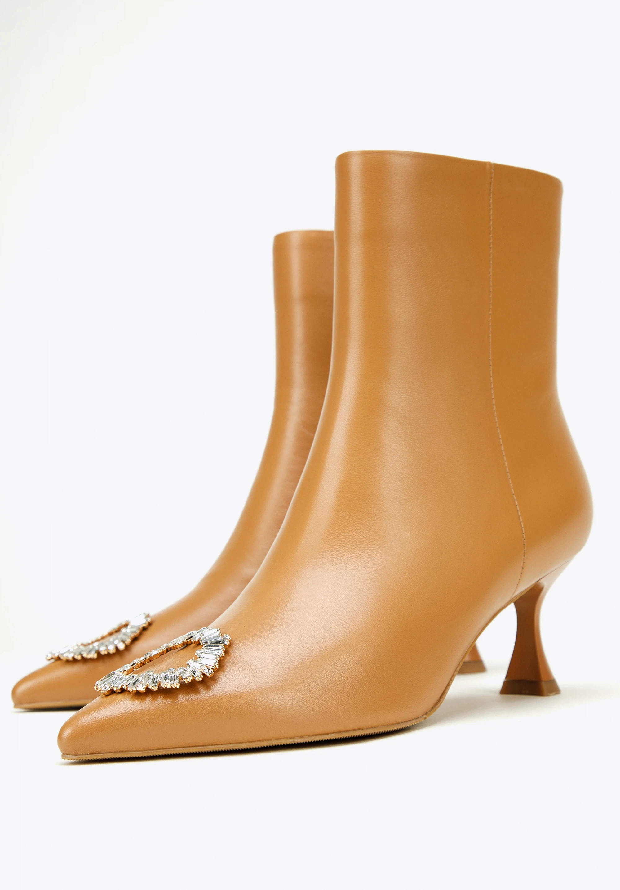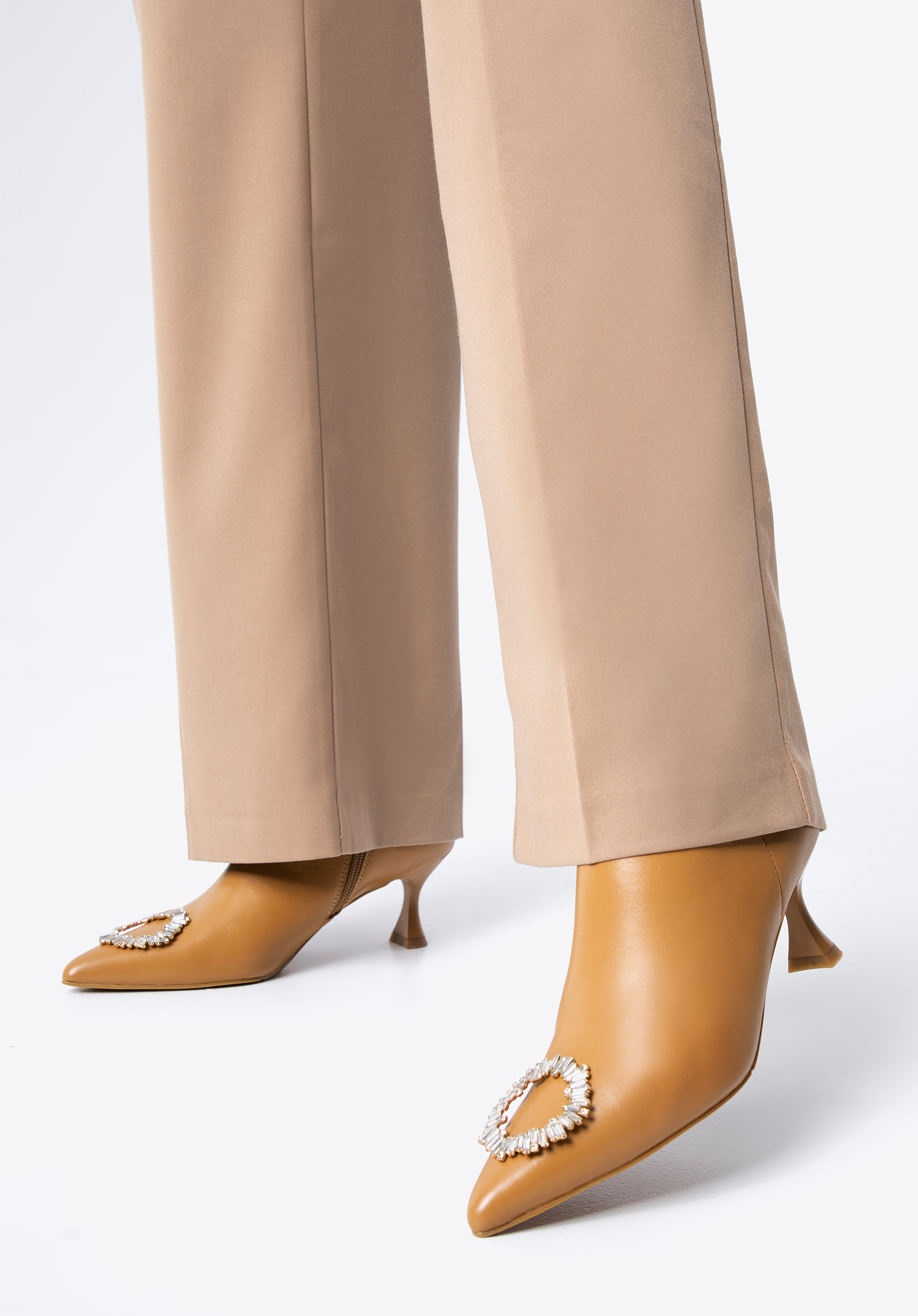 Ezek az egyedi cipők sok figyelmet vonzanak. Az egyszerű, sima, varrás nélküli kialakítást fényes kerek csat díszíti . A csizma kiváló minőségű természetes bőrből készült . A tűsarkú enyhén lefelé ívelt alacsony sarka formás és meglehetősen stabil. A hegyes orr rész karcsúsítja a lábfejed. Adj eleganciát kedvenc fekete ruhádhoz vagy viseld kedvenc nadrágoddal és ingeddel – minden helyzetben stílusosan kiegészíti az öltözéked. A kerek csattal ellátott bőrcsizma egy klasszikus modern csavarral, amely számos alkalomra hasznos lesz.