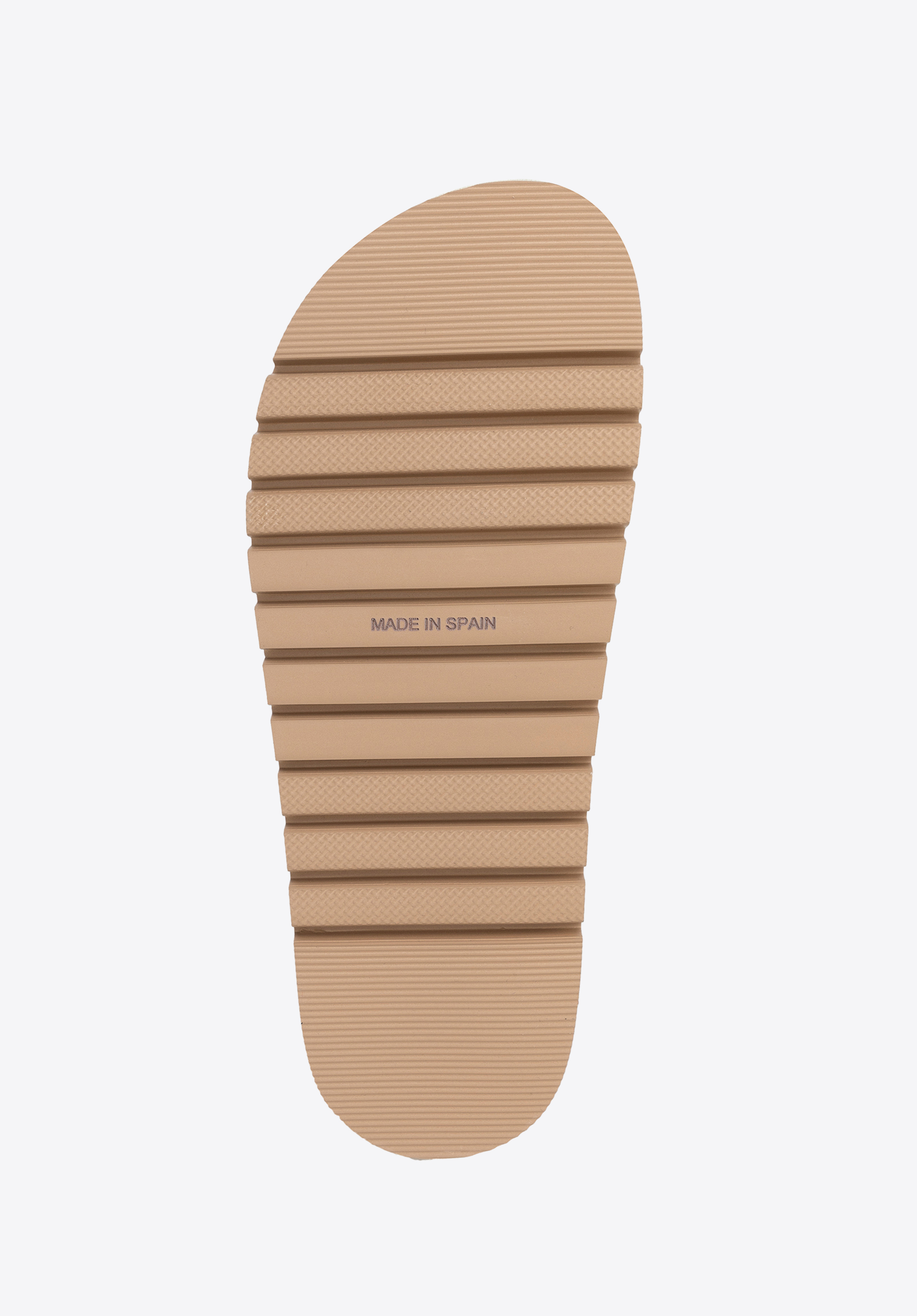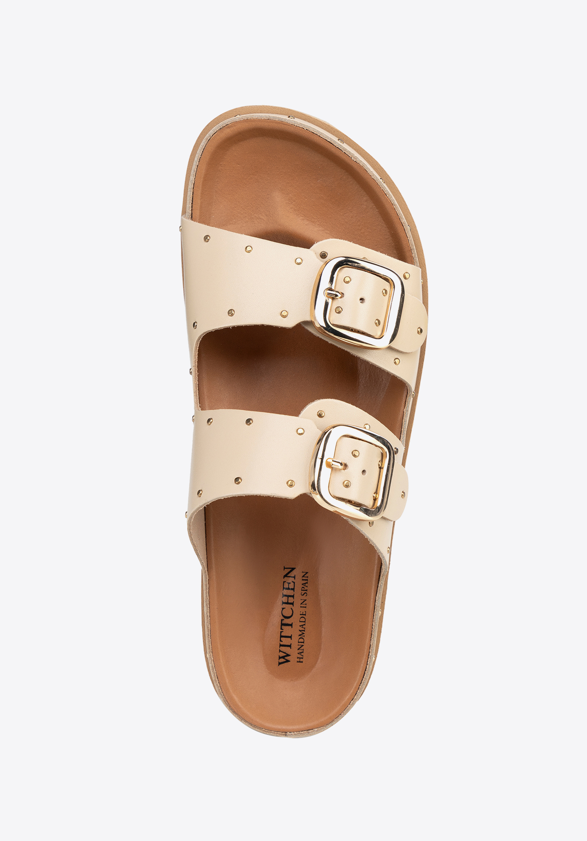 Könnyű, nőies és karakteres – ez a női szandál a tökéletes választás a nyárra. Spanyolországban készült természetes bőrből, és a finom eleganciát a nyugodt nyári hangulattal ötvözik. Egyedi dizájnját két széles, fémes részletekkel díszített pánt emeli ki, amelyek merészséget kölcsönöznek. Az állítható csatok tökéletes illeszkedést biztosítanak, míg a felcsúsztatható konstrukció megkönnyíti a viselést. A lekerekített orr hízelgő sziluettet alkot, a puha bélés és a talpbetét pedig egész napos kényelmet garantál.