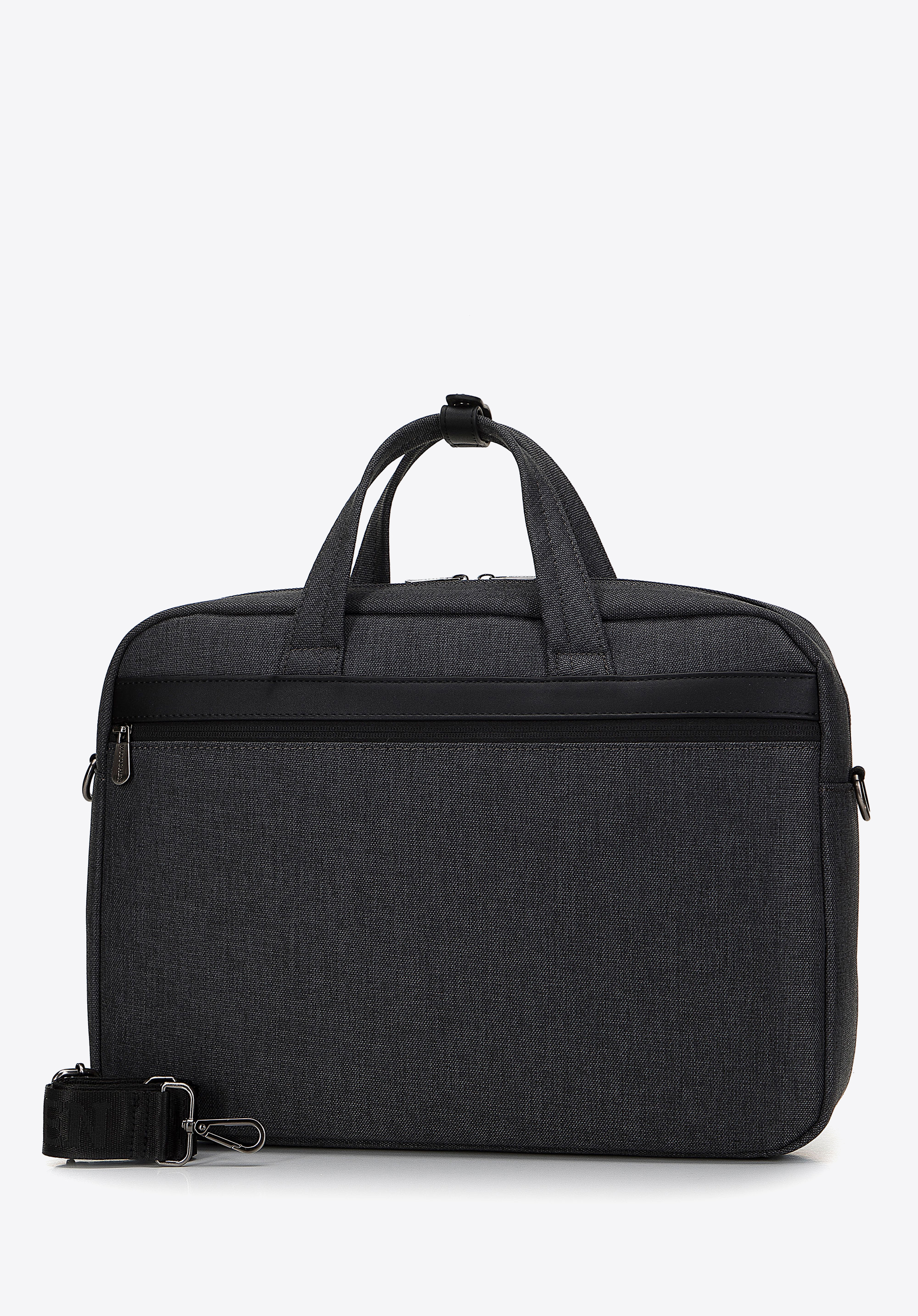 Ez a stílusos és praktikus laptop táska remek választás munkába és az után is. Tartós poliészterből készült, amelyet kiváló minőségű műbőrből készült szegélyek egészítenek ki. Kézben hordhatod, vagy az állítható pántot felcsatolva átvetheted a válladon. Belsejében egy puhán párnázott zseb található egy elektronikus eszköz számára melynek maximális mérete: 37 cm x 27 cm. Ezenkívül A4-es dokumentumok és kisebb elektronikai eszközök is elférnek benne. A testoldali zsebben biztonságosan tárolhatók például a fontos dokumentumok. A férfi laptop táska műbőr díszítéssel egy olyan mindennapi kiegészítő, amely több évszakon át hasznos lesz.