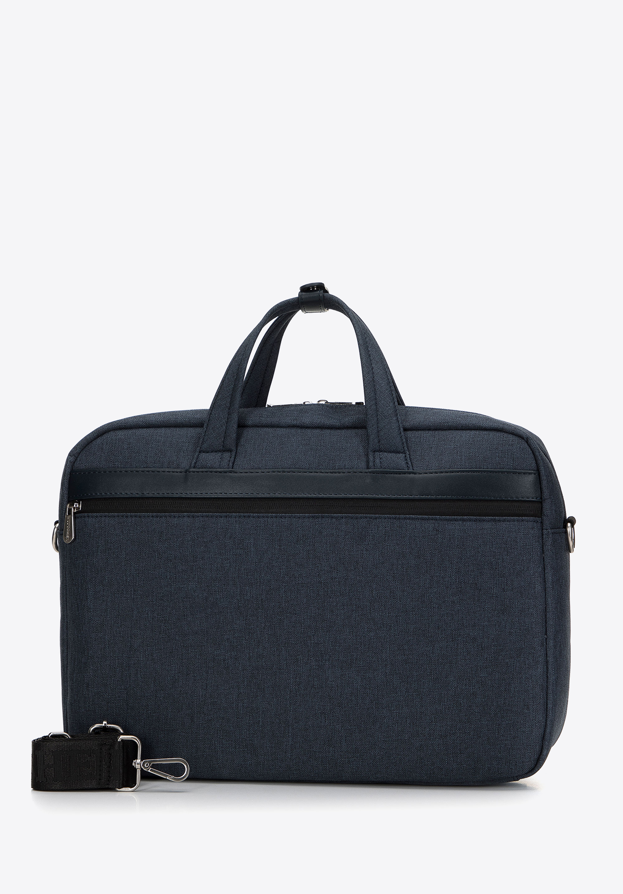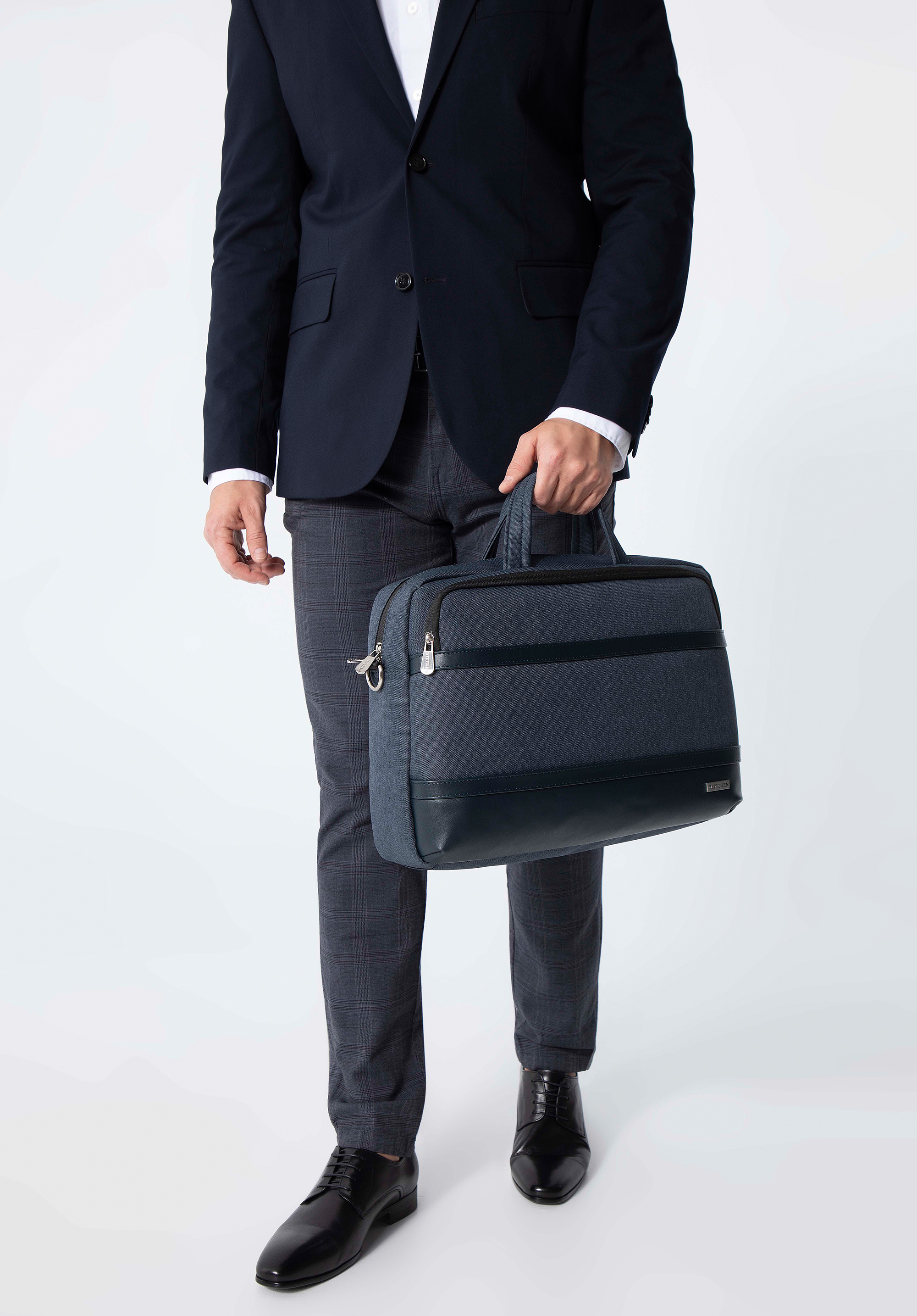 Ez a stílusos és praktikus laptop táska remek választás munkába és az után is. Tartós poliészterből készült, amelyet kiváló minőségű műbőrből készült szegélyek egészítenek ki. Kézben hordhatod, vagy az állítható pántot felcsatolva átvetheted a válladon. Belsejében egy puhán párnázott zseb található egy elektronikus eszköz számára melynek maximális mérete: 37 cm x 27 cm. Ezenkívül A4-es dokumentumok és kisebb elektronikai eszközök is elférnek benne. A testoldali zsebben biztonságosan tárolhatók például a fontos dokumentumok. A férfi laptop táska műbőr díszítéssel egy olyan mindennapi kiegészítő, amely több évszakon át hasznos lesz.