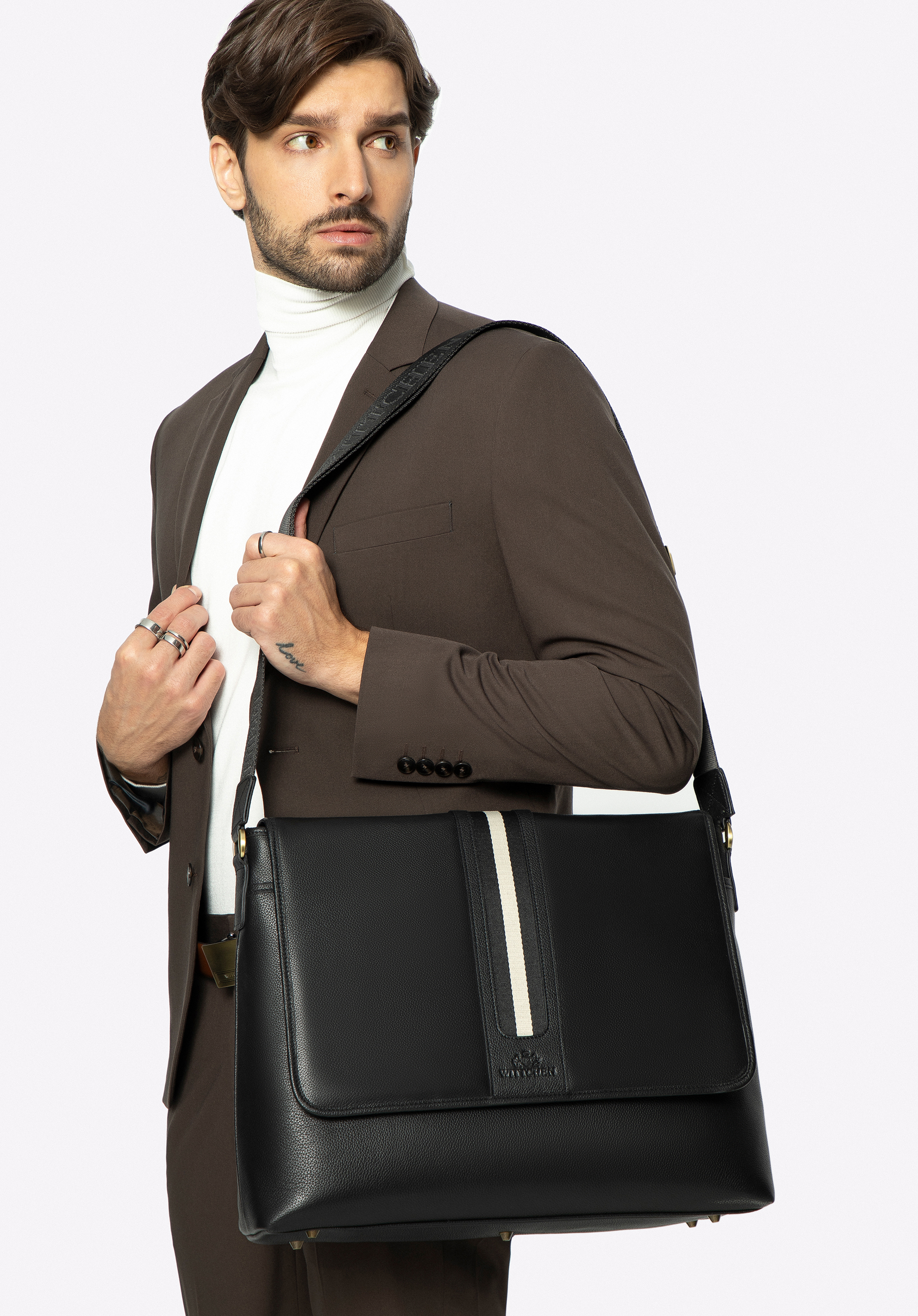 Ez a laptoptáska egy elegáns kiegészítő, melyet minden nap hordhatsz. Ez a kiváló minőségű természetes bőrből készült táska elöl csíkos részlettel rendelkezik a sportos stílus növelése érdekében. A jól áttekinthető belső terű laptoptáskában A4-es méretű dokumentumok, valamint pénztárca, telefon, naptár és néhány egyéb tárgy is elfér. Ezen kívül van benne egy párnázott zseb, amibe egy maximum 25 cm x 36 cm méretű elektronikus eszköz is belefér. A 15,6"-os férfi laptoptáska időtálló kiegészítő, amelyet munkába és munka után is hordhatsz.