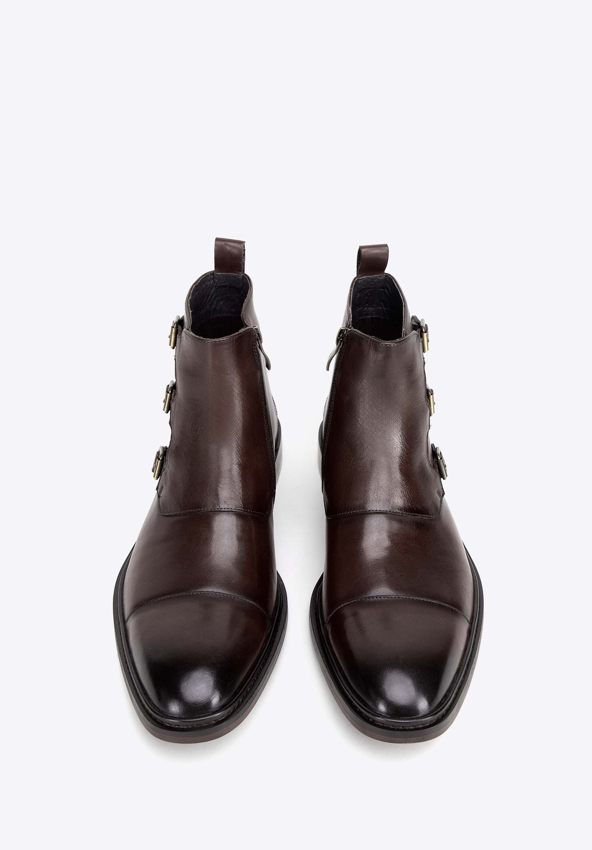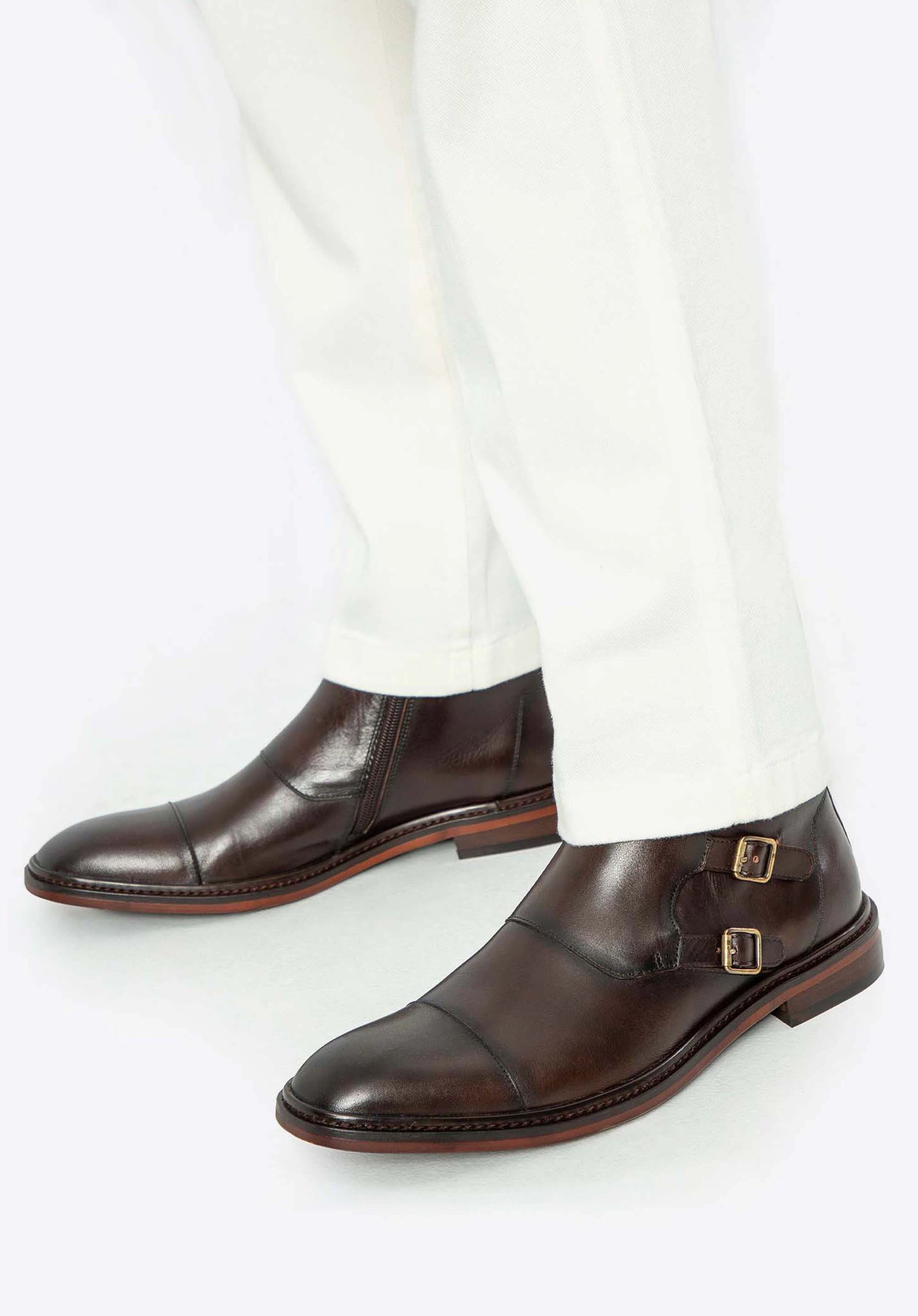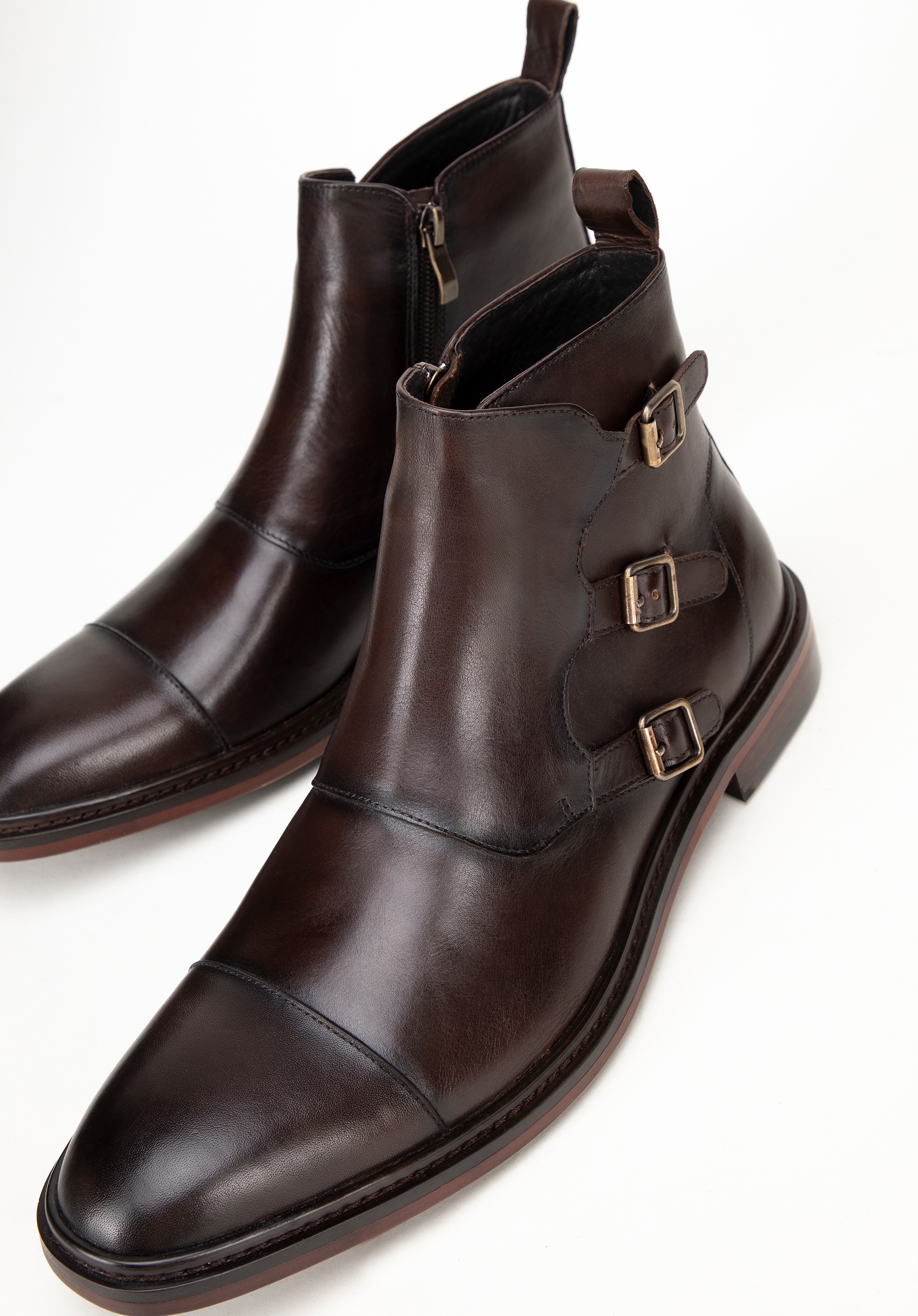 Fedezd fel a tartós stílust és kényelmet természetes bőrből készült férfi csizmáinkkal. Ez az elegáns bokacsizma, amelyet a klasszikus szerzetescipő ihletett, magas felsőrésszel és háromszoros csatos rögzítéssel rendelkezik. A strapabíró talp kiváló tapadást és hosszú élettartamot biztosít, így ezek a csizmák tökéletesek a különböző felületeken való sétához. A csatos rögzítés és a cipzár lehetővé teszi a könnyű viselést és a tökéletes illeszkedést, amely egyszerre kínál kényelmet és funkcionalitást. Ezenkívül az erős lekerekített orr védelmet nyújt, kiemelve e kivételes csizmák esztétikáját és praktikumát.
