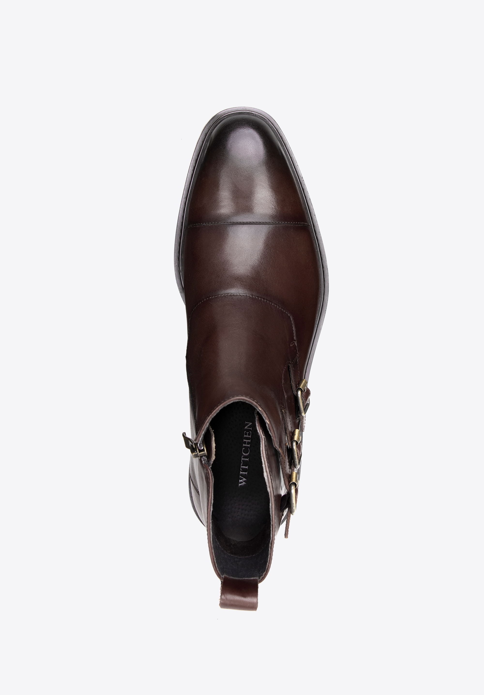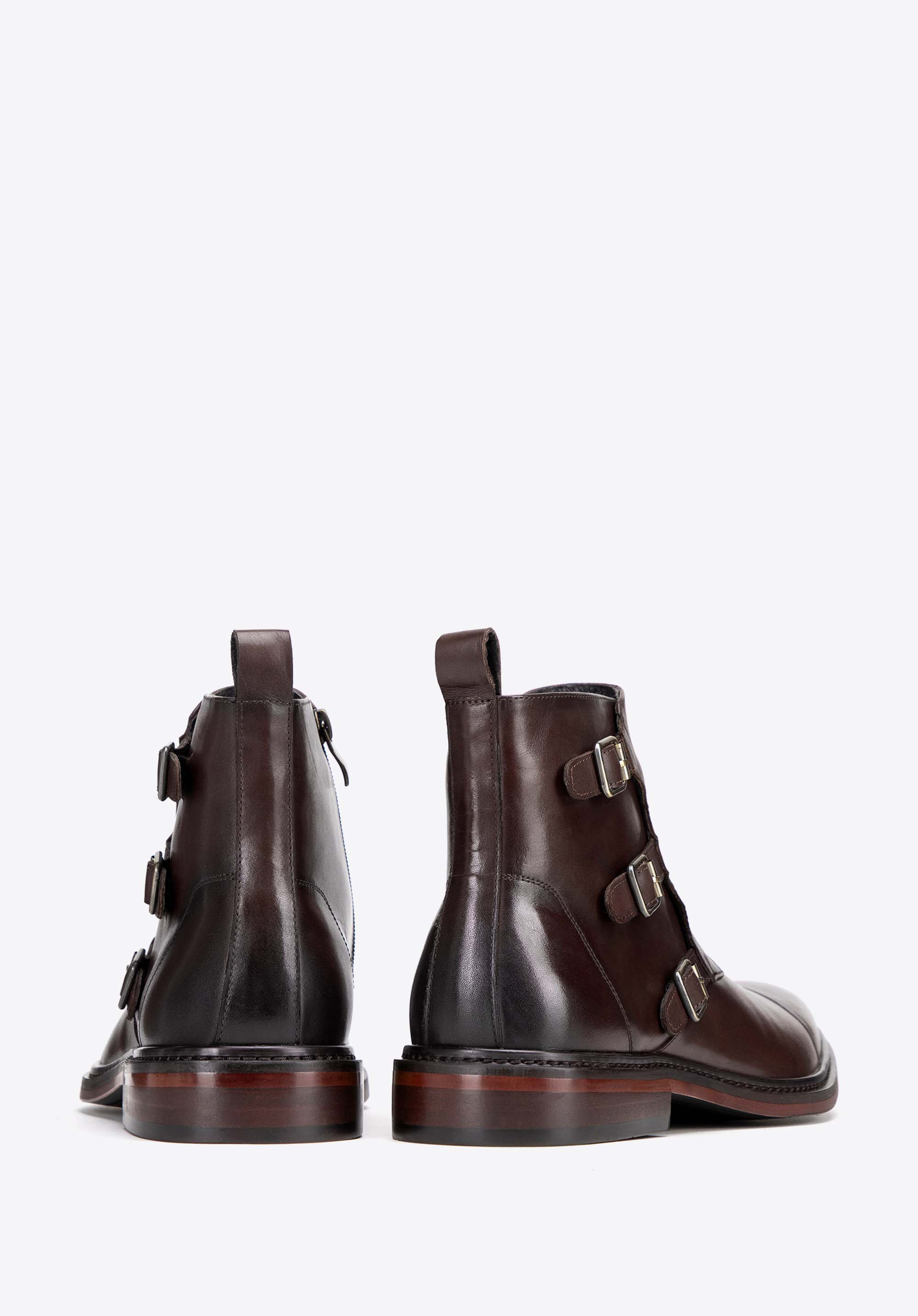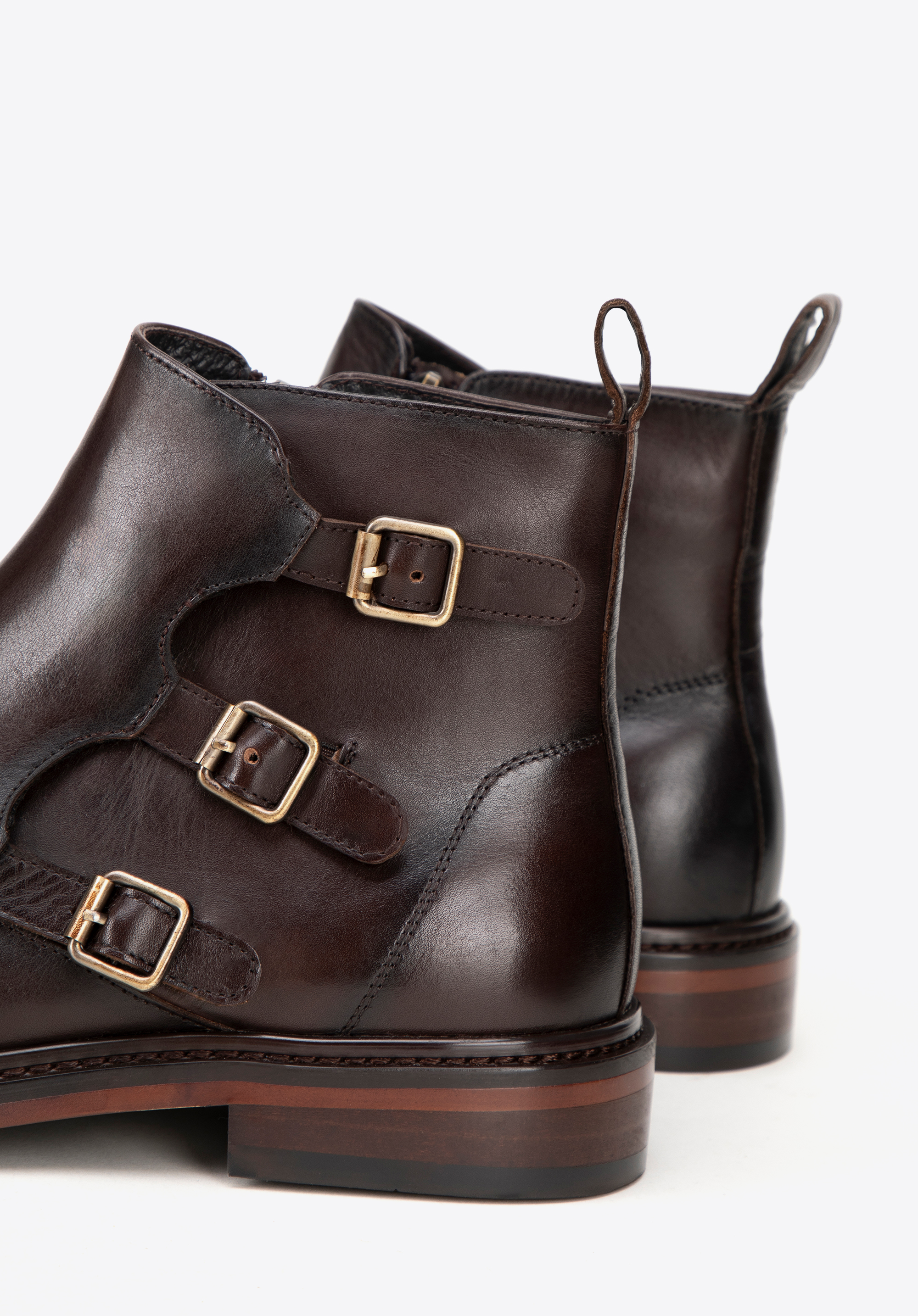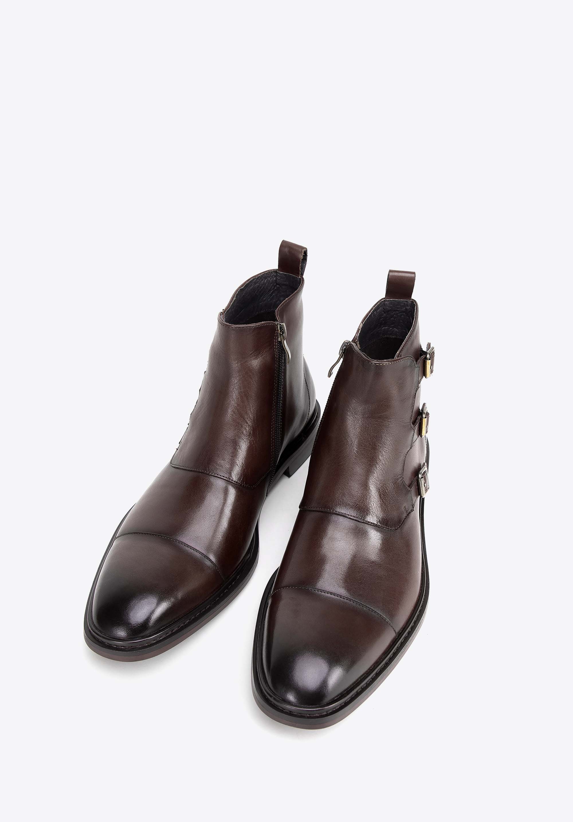 Fedezd fel a tartós stílust és kényelmet természetes bőrből készült férfi csizmáinkkal. Ez az elegáns bokacsizma, amelyet a klasszikus szerzetescipő ihletett, magas felsőrésszel és háromszoros csatos rögzítéssel rendelkezik. A strapabíró talp kiváló tapadást és hosszú élettartamot biztosít, így ezek a csizmák tökéletesek a különböző felületeken való sétához. A csatos rögzítés és a cipzár lehetővé teszi a könnyű viselést és a tökéletes illeszkedést, amely egyszerre kínál kényelmet és funkcionalitást. Ezenkívül az erős lekerekített orr védelmet nyújt, kiemelve e kivételes csizmák esztétikáját és praktikumát.