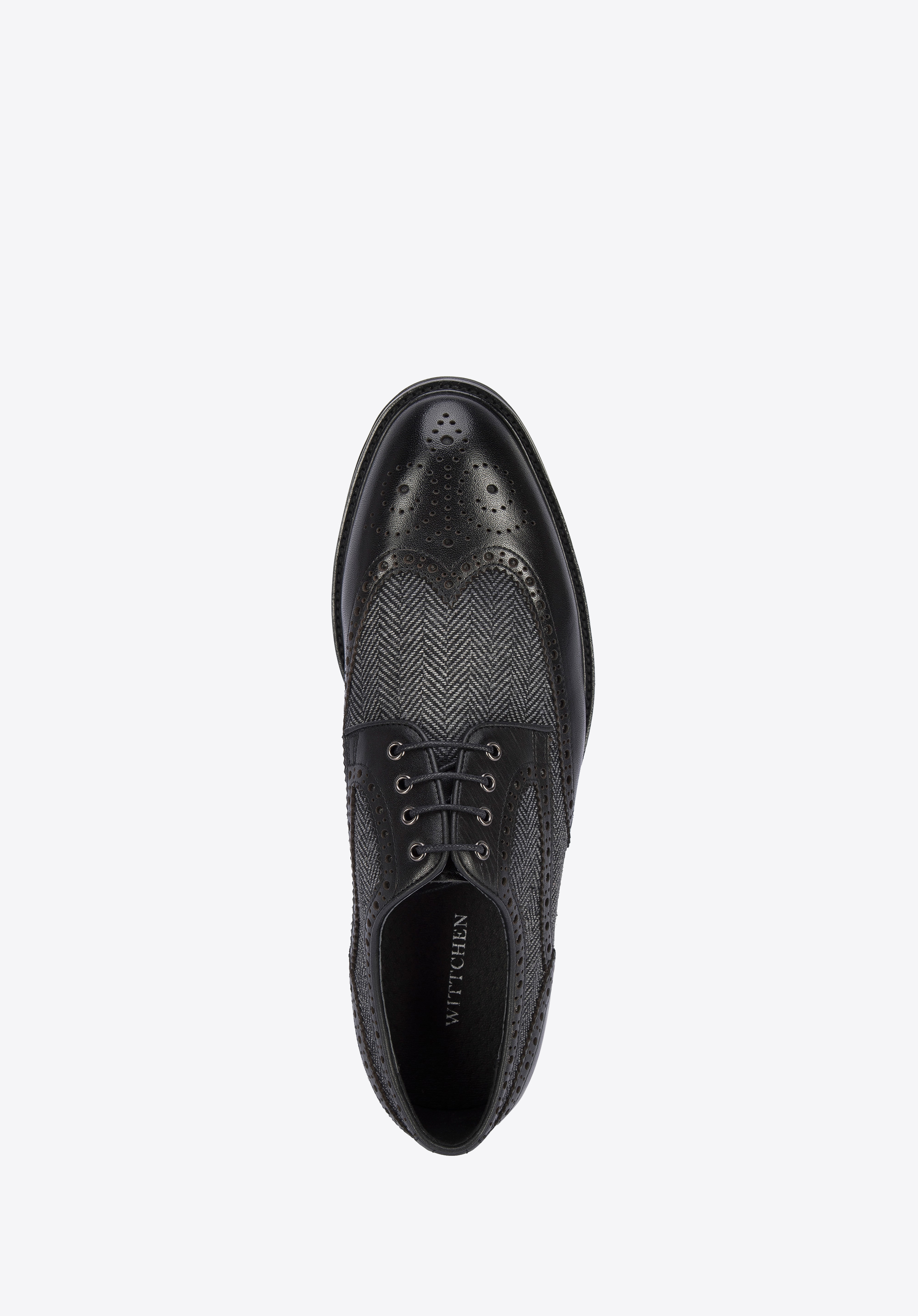 Ezek a brogues stílusú cipők elegáns kiegészítők egyedi kiadásban. A klasszikus dizájnt halszálka mintás szövet teszi változatossá, amely kiváló minőségű természetes bőrrel párosul. Ezen kívül perforációkkal, fogazott szegélyekkel és "W" vágással rendelkezik az orrán. Tökéletesen passzolnak elegáns és hétköznapi ruhákhoz is: például öltönyhöz vagy kordbársony nadrághoz és pulóverhez. Ez a halszálka mintájú férfi bőr brogues cipő időtlen választás minden stílusos férfi számára.