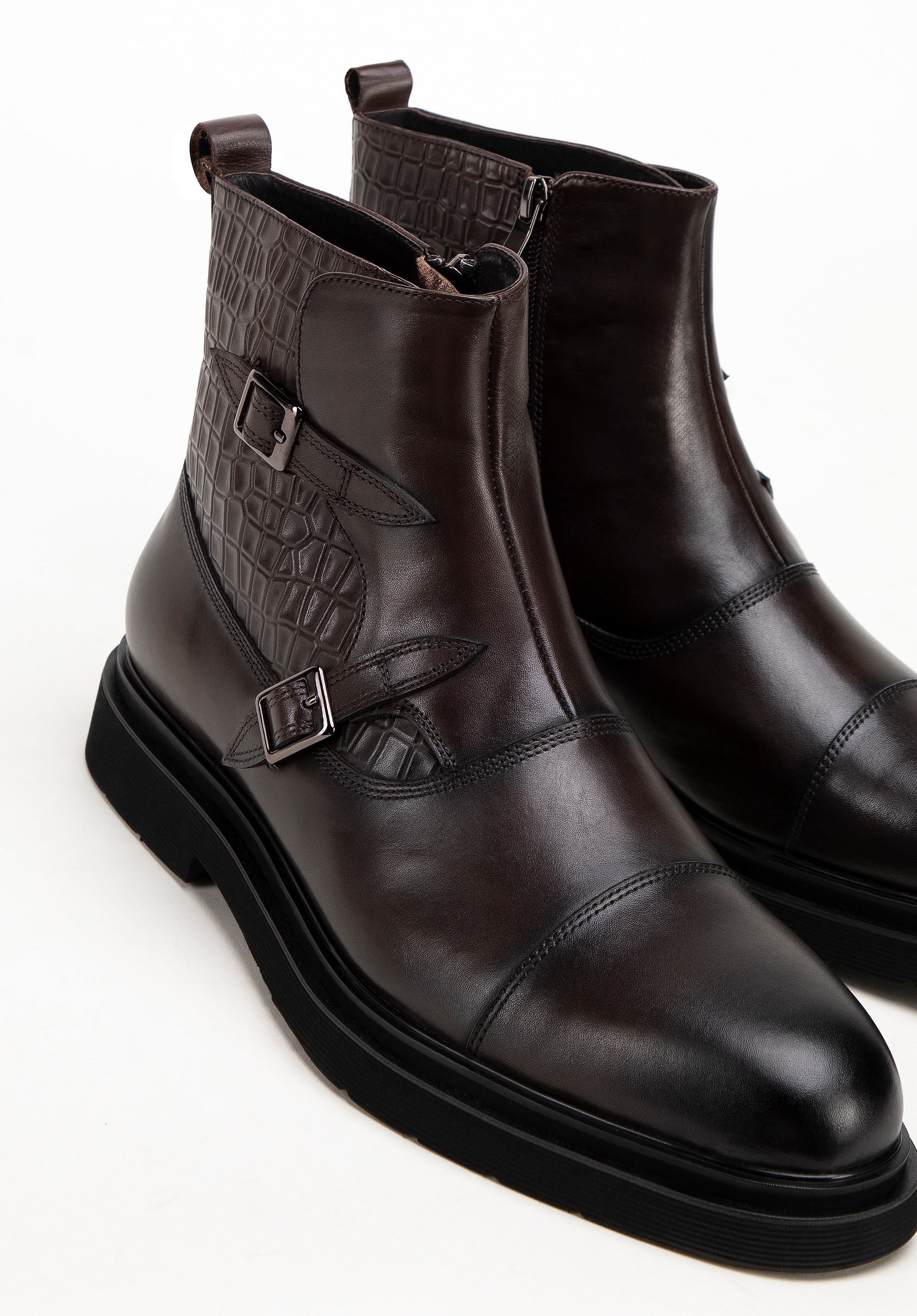 Ez a férfi Chelsea csizma az elegancia és a kényelem megtestesítője, kiváló minőségű természetes bőrből készült, krokodilbőr textúrával díszítve. A puha bőr bélés és a lekerekített orr páratlan kényelmet biztosít egész nap. A lapos sarok és a sarkon lévő tartós gumi gondoskodik a stabilitásról. A praktikus cipzár megkönnyíti a felhelyezésüket, míg a két dekoratív csat és az orr-varrások jellegzetes és kifinomult megjelenést kölcsönöznek a csizmának. A stílus és a funkcionalitás tökéletes kombinációja a modern ember számára.