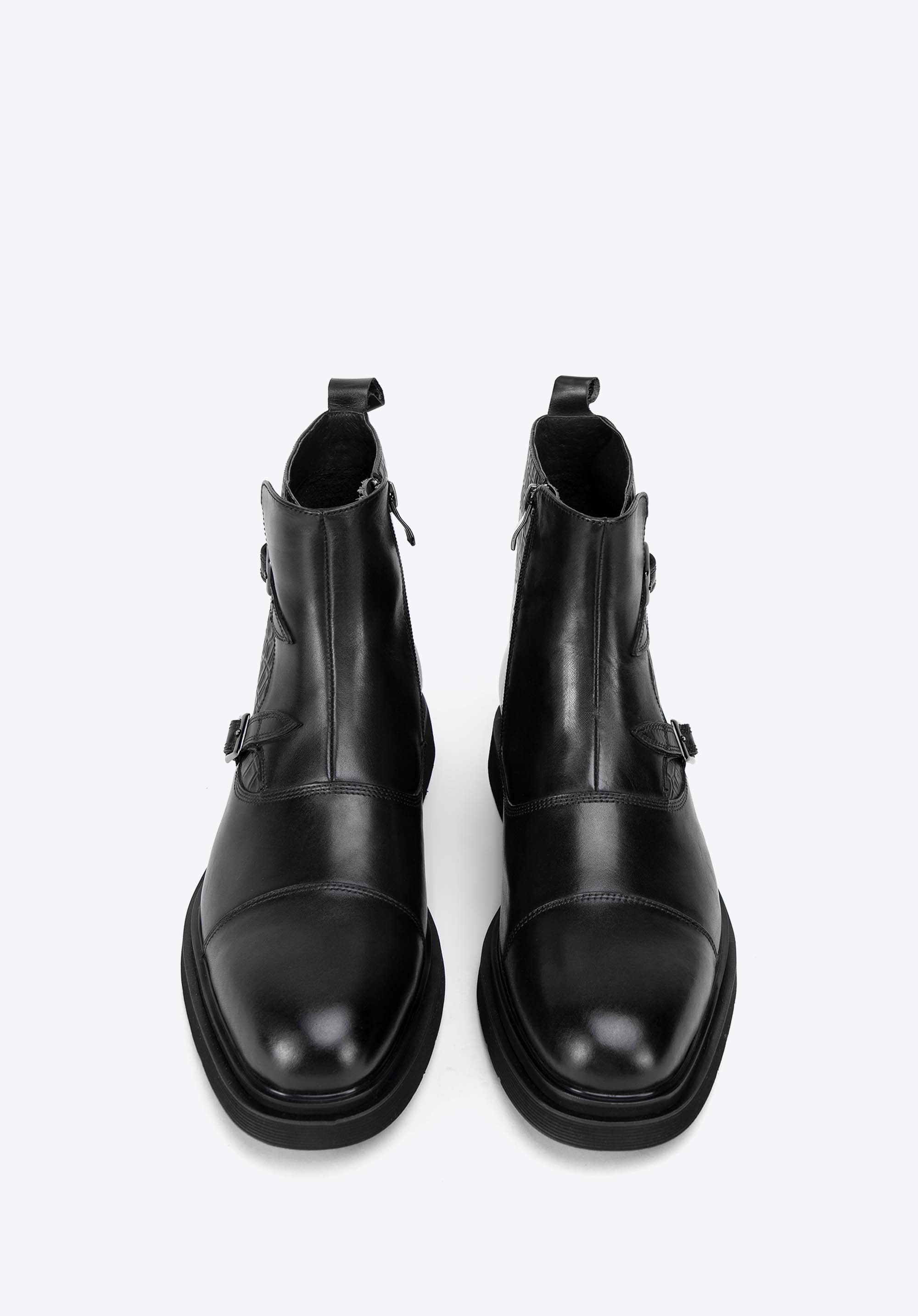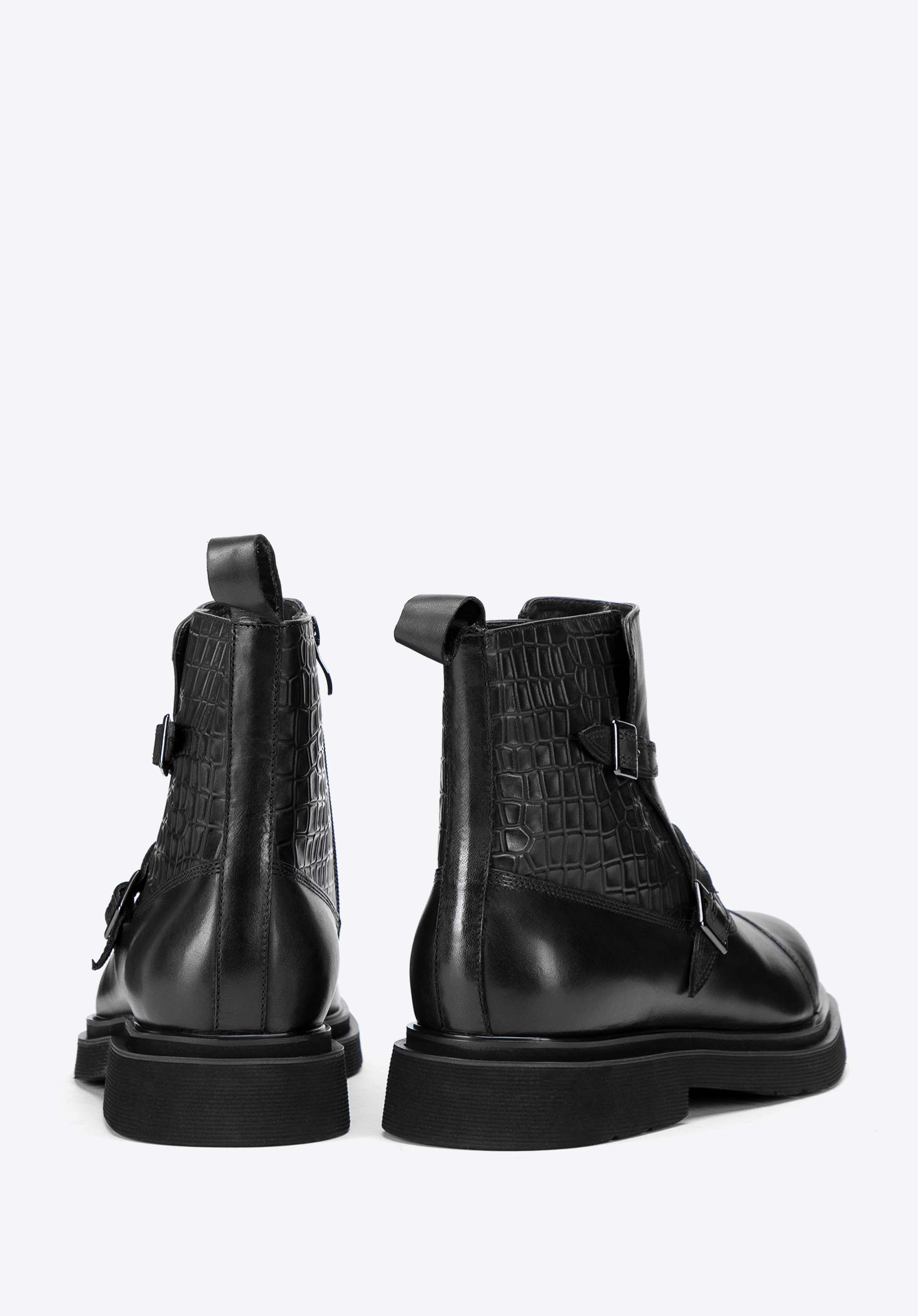 Ez a férfi Chelsea csizma az elegancia és a kényelem megtestesítője, kiváló minőségű természetes bőrből készült, krokodilbőr textúrával díszítve. A puha bőr bélés és a lekerekített orr páratlan kényelmet biztosít egész nap. A lapos sarok és a sarkon lévő tartós gumi gondoskodik a stabilitásról. A praktikus cipzár megkönnyíti a felhelyezésüket, míg a két dekoratív csat és az orr-varrások jellegzetes és kifinomult megjelenést kölcsönöznek a csizmának. A stílus és a funkcionalitás tökéletes kombinációja a modern ember számára.