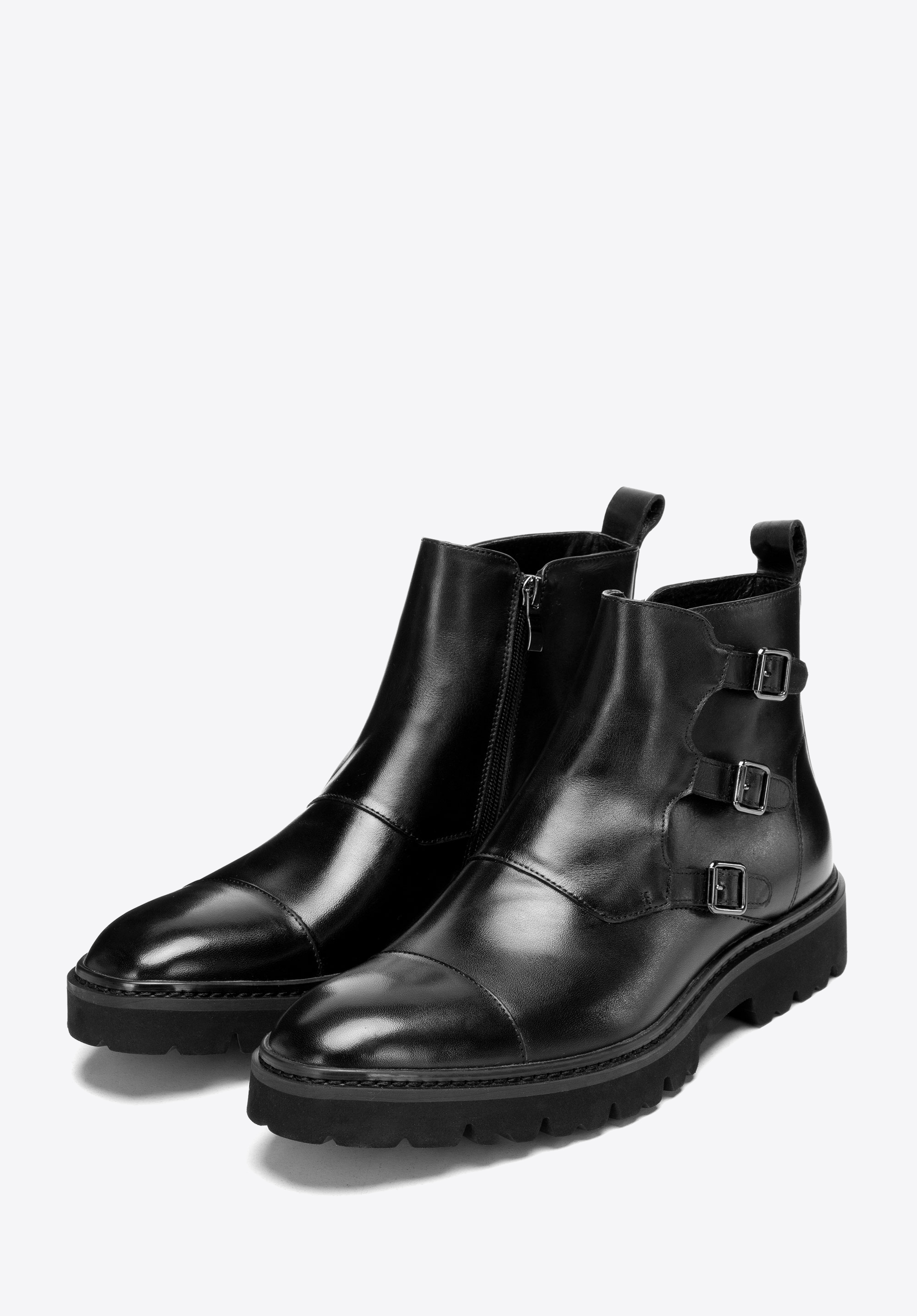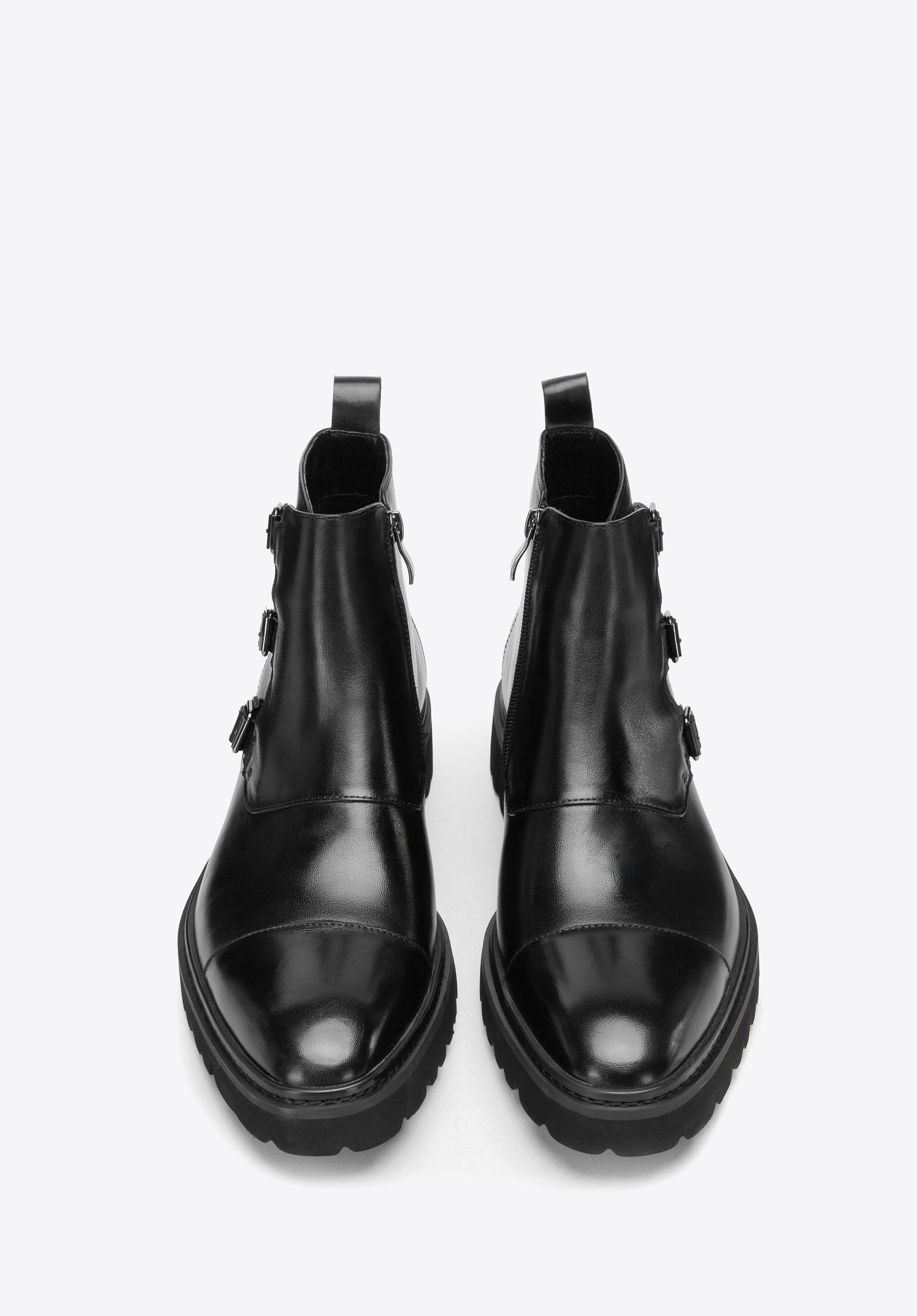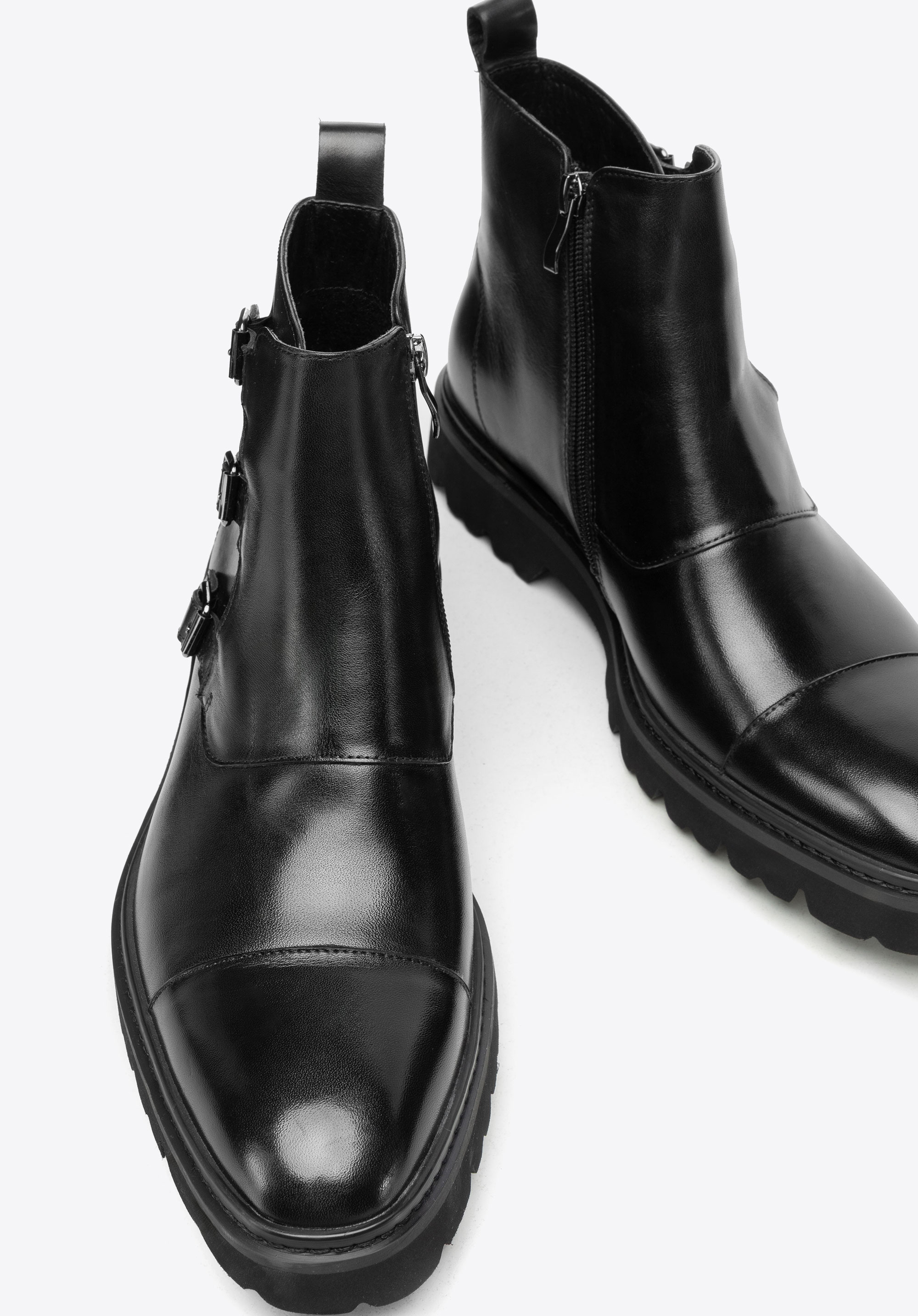 Válassz időtlen eleganciát egy csipetnyi modern stílussal. Ezek a természetes bőrből készült férfi csizmák ötvözik a tartósságot, a kényelmet és a kifinomult dizájnt. A mandulavágású orr nemcsak a letisztult sziluettet hangsúlyozza, hanem védi a lábujjakat is, miközben a teljes konstrukció tartós kényelmet biztosít – tökéletes mind a nyüzsgő városi élethez, mind a megerőltetőbb körülményekhez. A praktikus cipzárral ellátott, elegáns felsőrész megkönnyíti a fel- és levételt, miközben bármilyen megjelenéshez egyedi megjelenést kölcsönöz.
