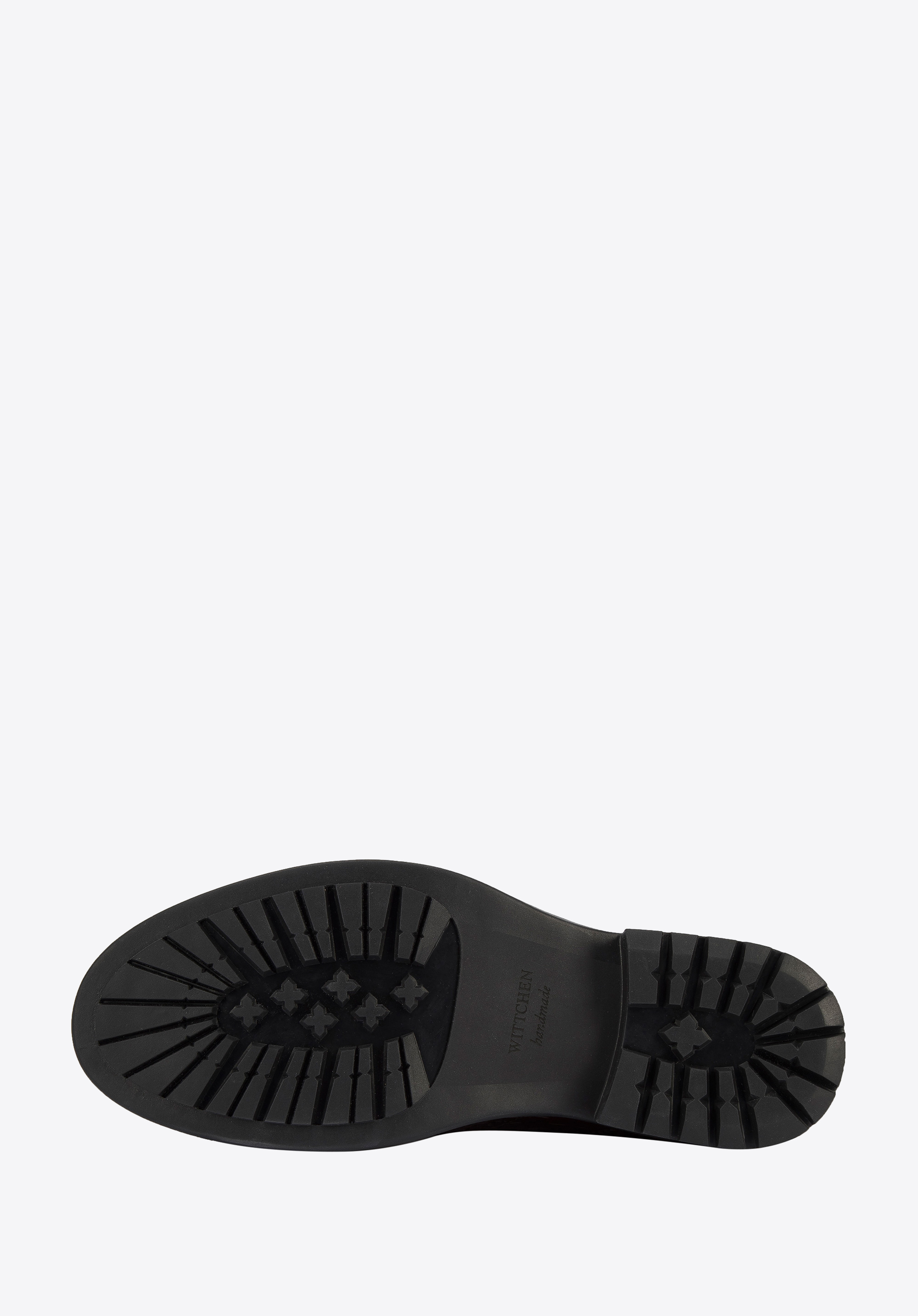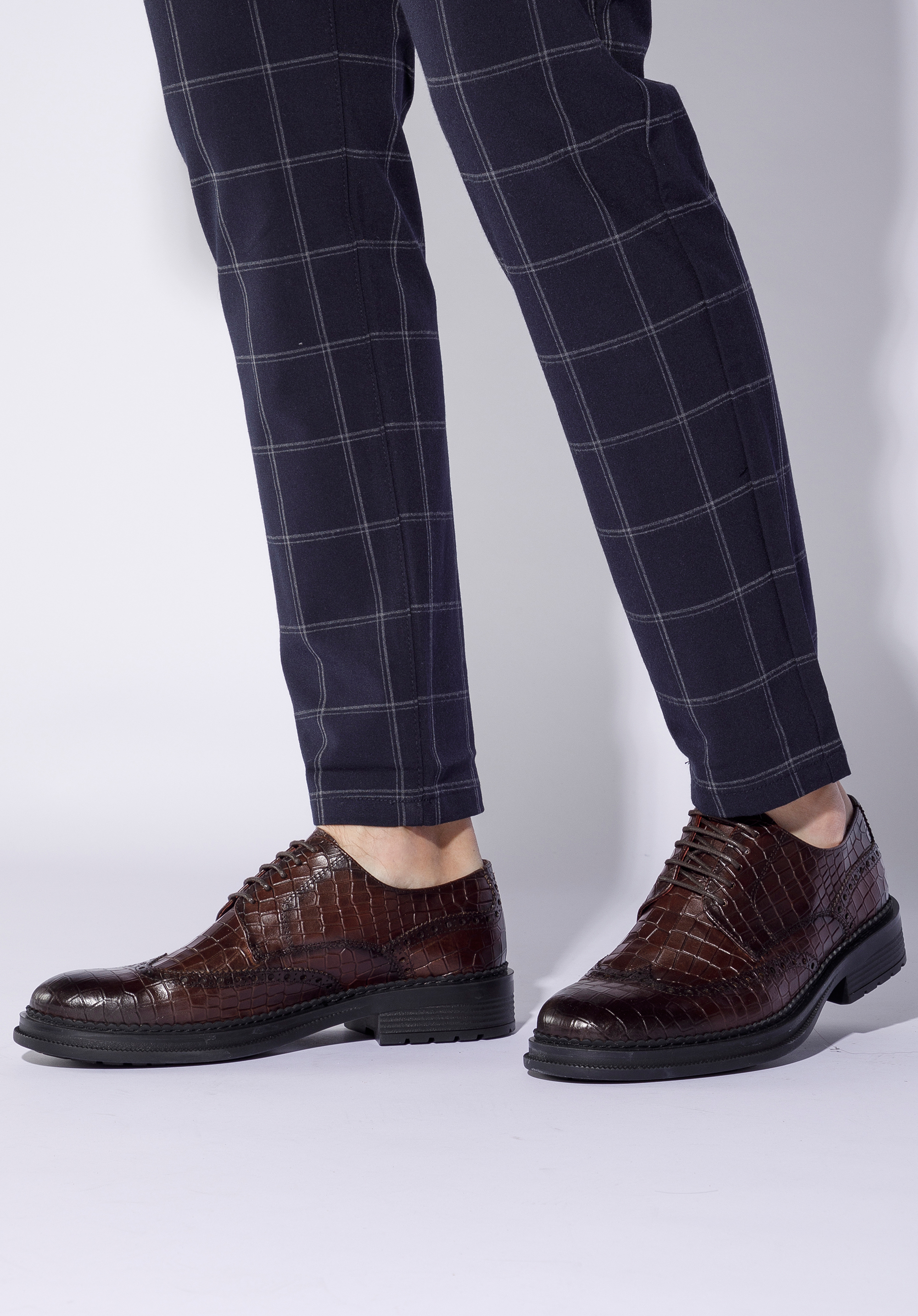 Ez az egyedi férfi cipő remek kiegészítő egy modern férfi számára. Kiváló minőségű, croco textúrájú természetes bőrből készült, aminek köszönhetően minden stílust változatossá tesz. Az orrán és az oldalain található díszítések stílusosan egészítik ki a modellt. Vastag talpuk néhány centiméterrel növeli a magasságot, és csúszásmentes kidolgozásának köszönhetően biztosítja a stabilitást különféle időjárási körülmények között. Ez a modell jól fog passzolni farmernadrág és ing kombinációjához, a chino nadrág kabáttal pedig új karaktert kap. Ez a krokodilbőr textúrájú férfi bőr cipő nagyszerű választás azoknak a férfiaknak, akik szeretnek kitűnni a tömegből.