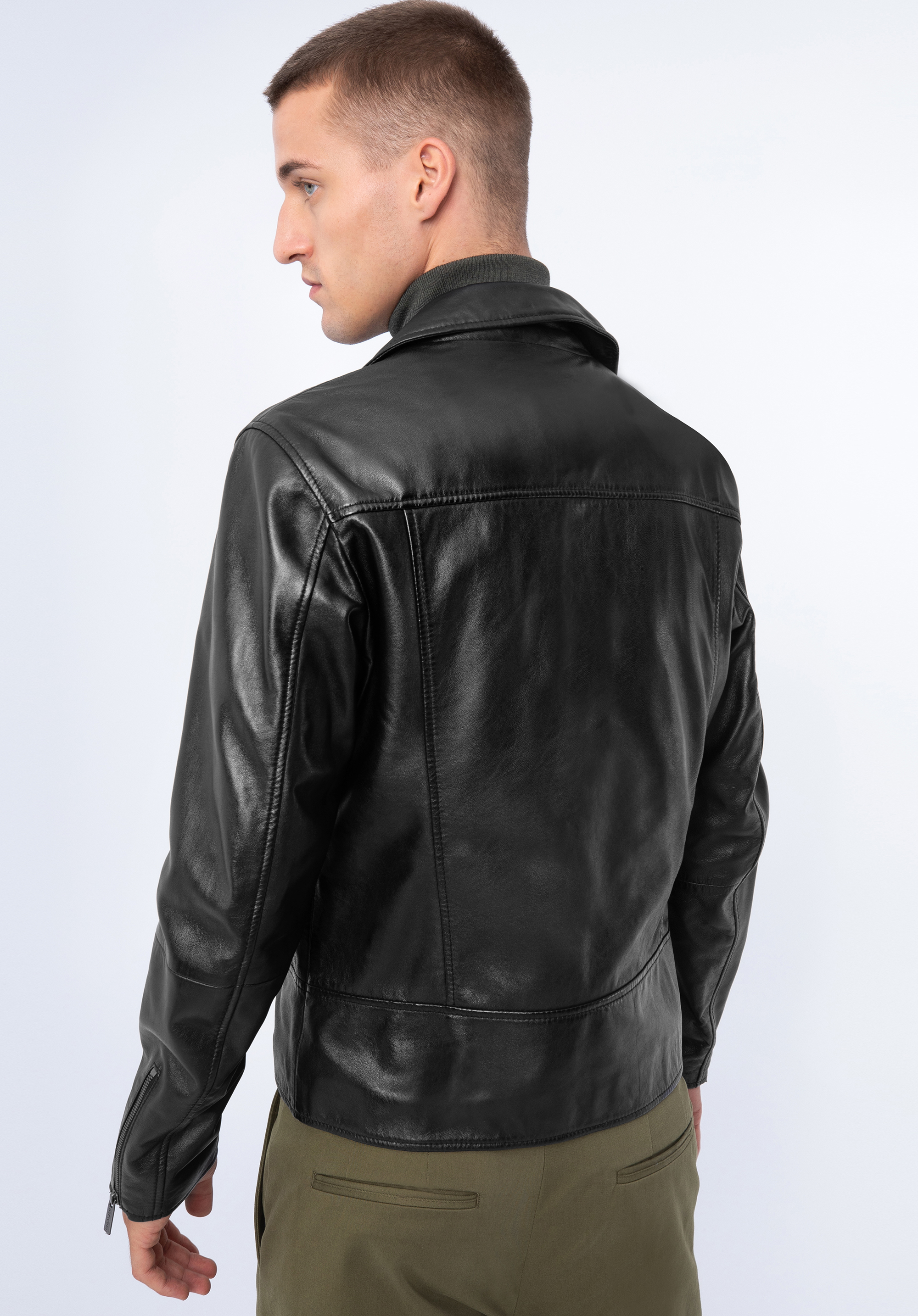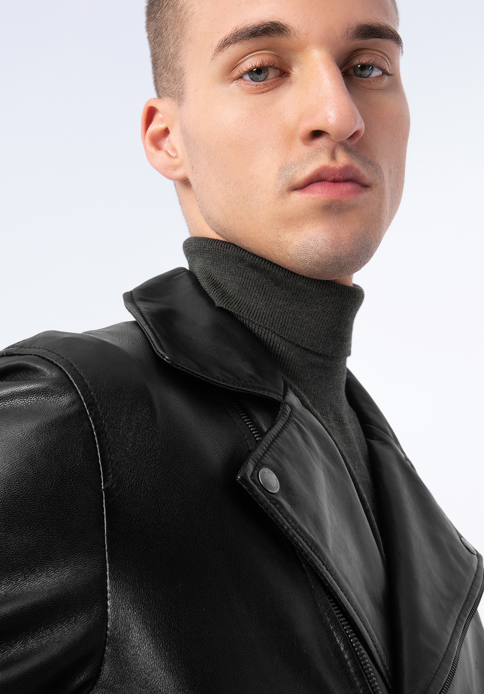 A férfi bőr motoros kabát divatos, és kötelező kiegészítője a ruhatáradnak. Időtlen dizájn lehajtható gallérral, aszimmetrikus cipzárral és csillogó szegecsekkel egy kis rock''n''roll hangulatot kölcsönöz viseletednek. A puha báránybőrből készült kabát varrásrészletekkel és cipzáras ujjakkal készült. Ez a motoros kabát pont az, amire szükséged van, hogy valami extra ízt adj kedvenc ruháidhoz. A klasszikus férfi dzseki tökéletes mindennapi használatra tavasztól őszig.