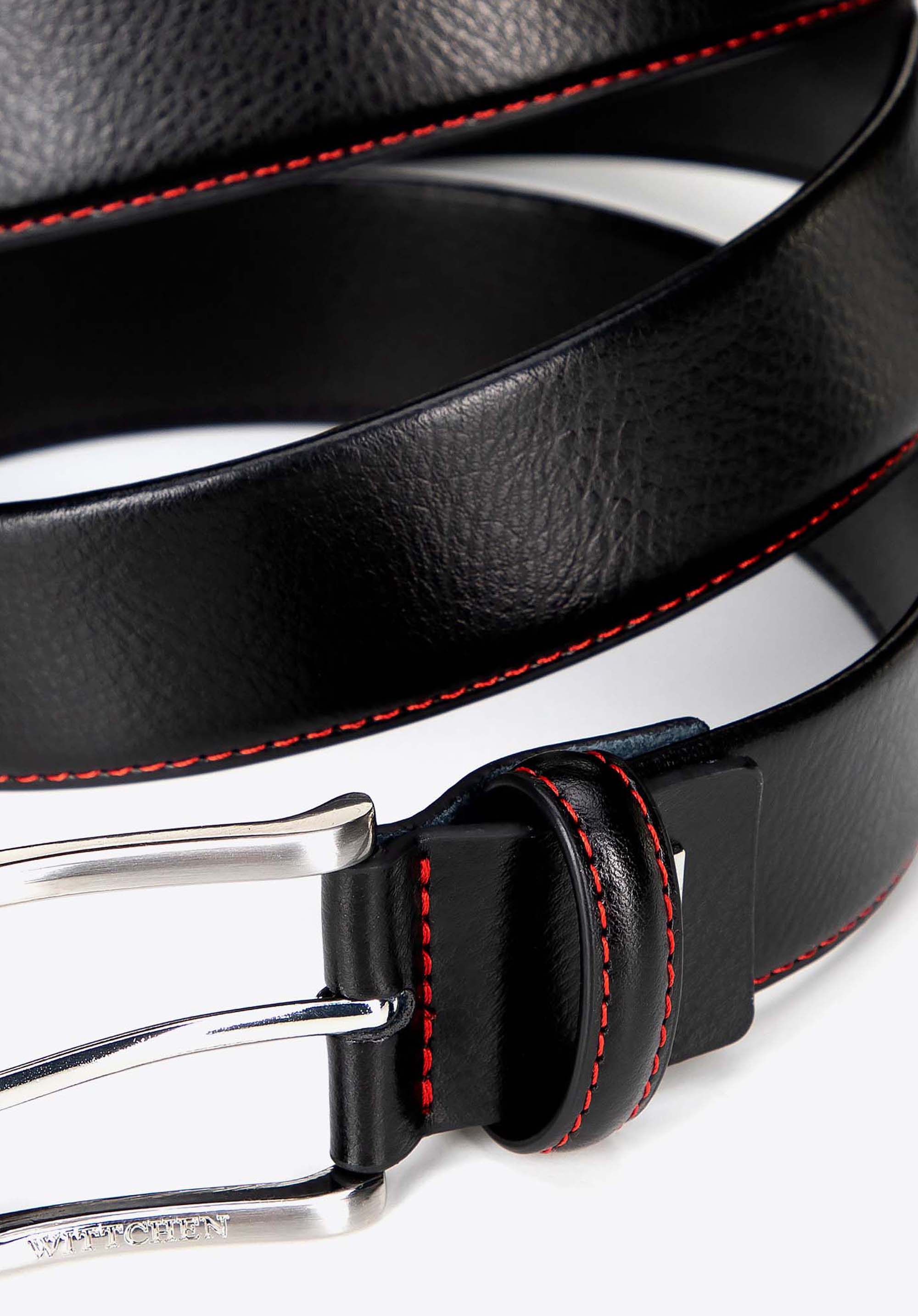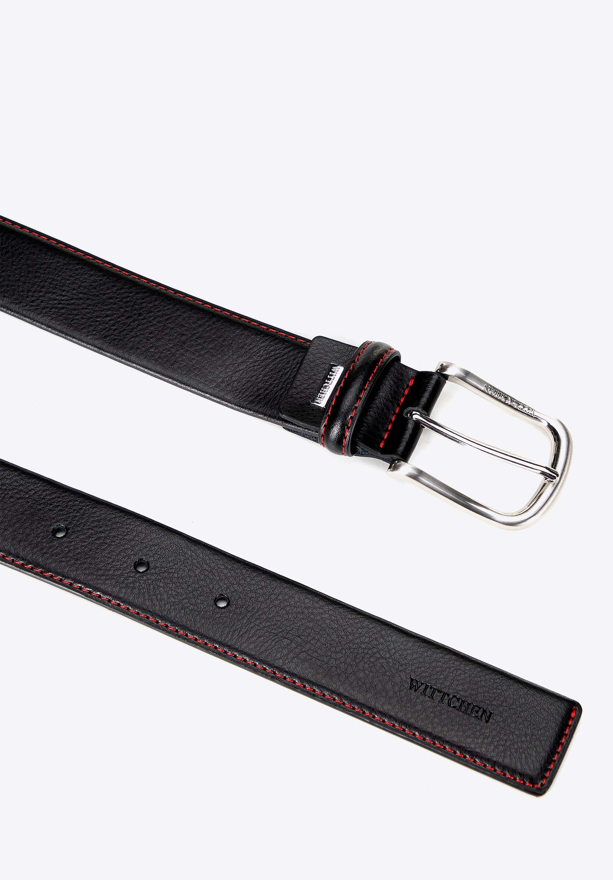 Elegancia a javából – férfi bőrövünk a klasszikus stílus és a finom, modern részletek tökéletes kombinációja. A kiváló minőségű természetes bőrből készült öv finom piros varrással tűnik ki, amely karaktert kölcsönöz, és ideális kiegészítővé teszi bármilyen ruhához. A sima bőrtextúra fokozza az eleganciát, míg az aprólékos kidolgozás hosszú élettartamot biztosít.