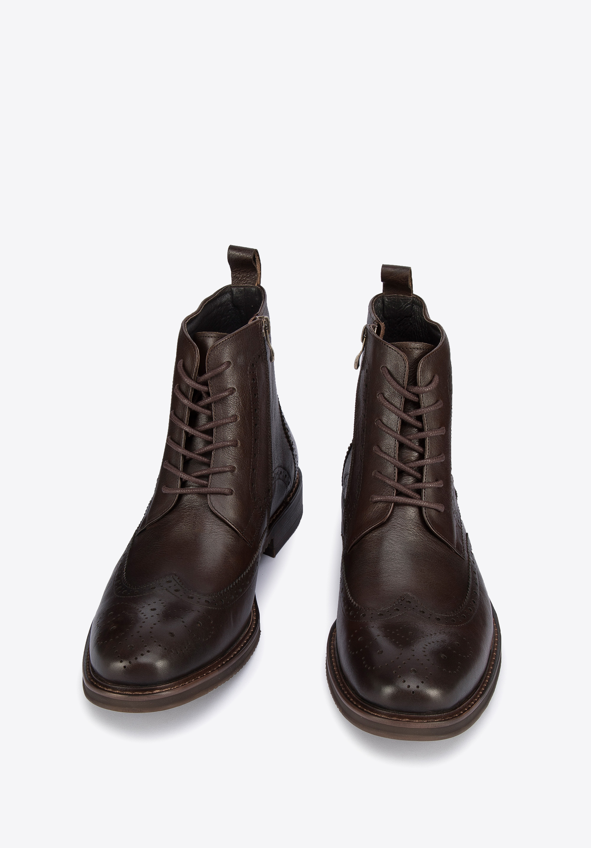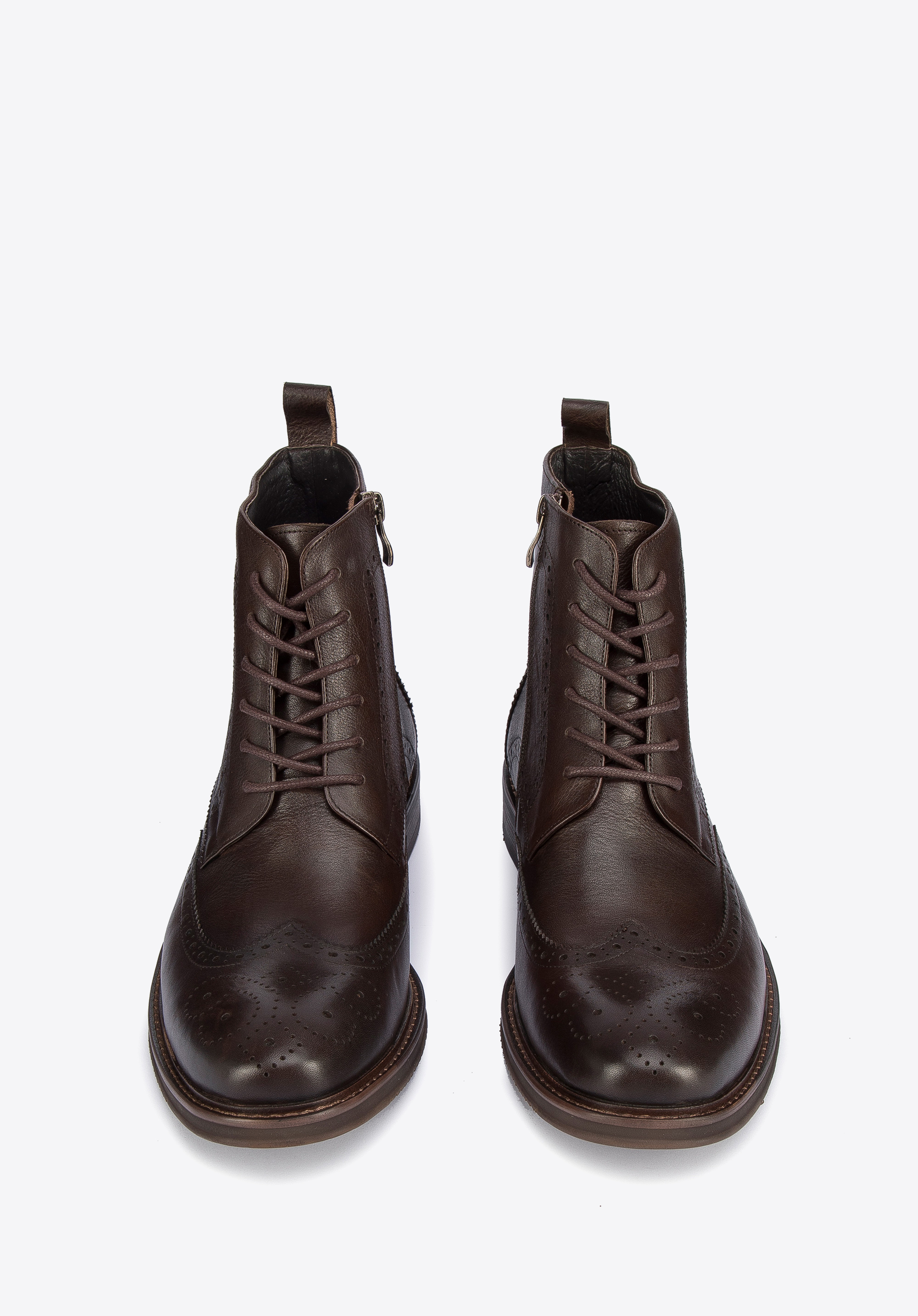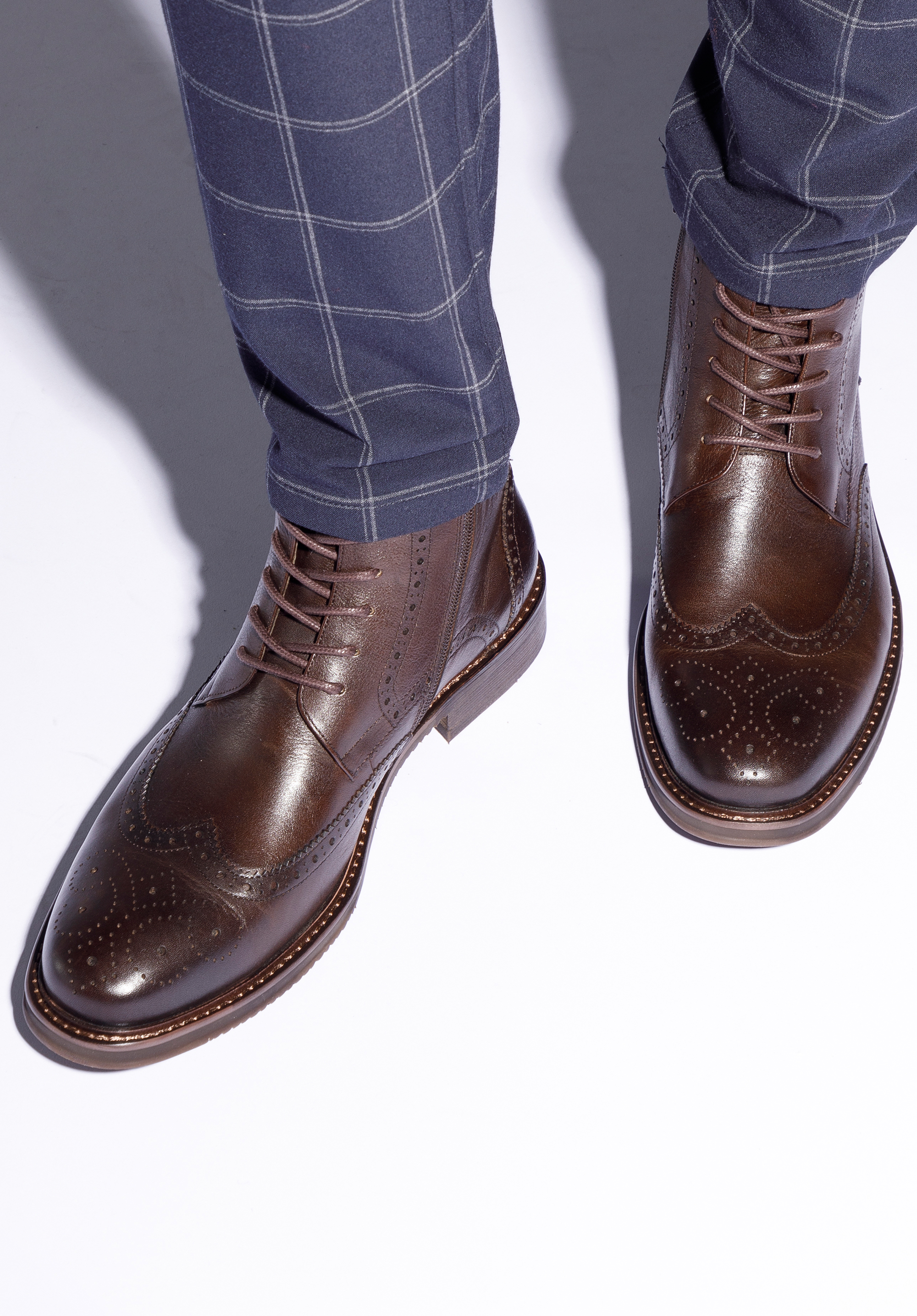 Ez az elegáns férfi bakancs nagyszerű választás őszre és tavaszra, valamint melegebb téli napokra. A stílusos orrdísz karaktert ad neki, az oldalakon látható lyukak pedig kiemelik egyediségégét. A belső oldalon cipzár található a könnyű belebújás érdekében. A cipők kiváló minőségű természetes bőrből készültek, csúszásmentes talpának köszönhetően pedig kényelmesen járhatsz bennük egész nap. Hordható hétköznapi és alkalmi ruhákkal is. Ez a perforált, férfi bőr bakancs minden divatos férfi időtlen kiegészítője.