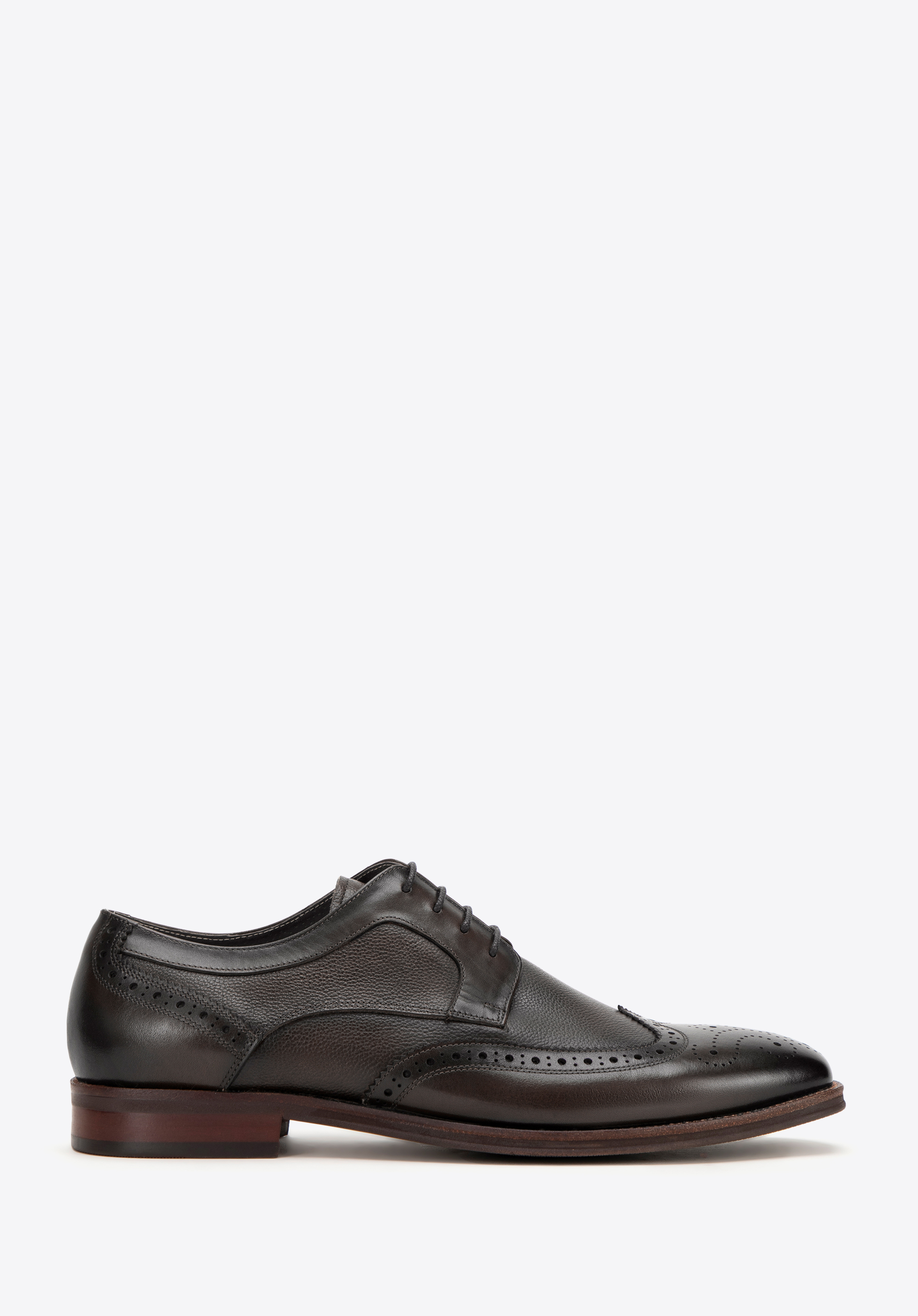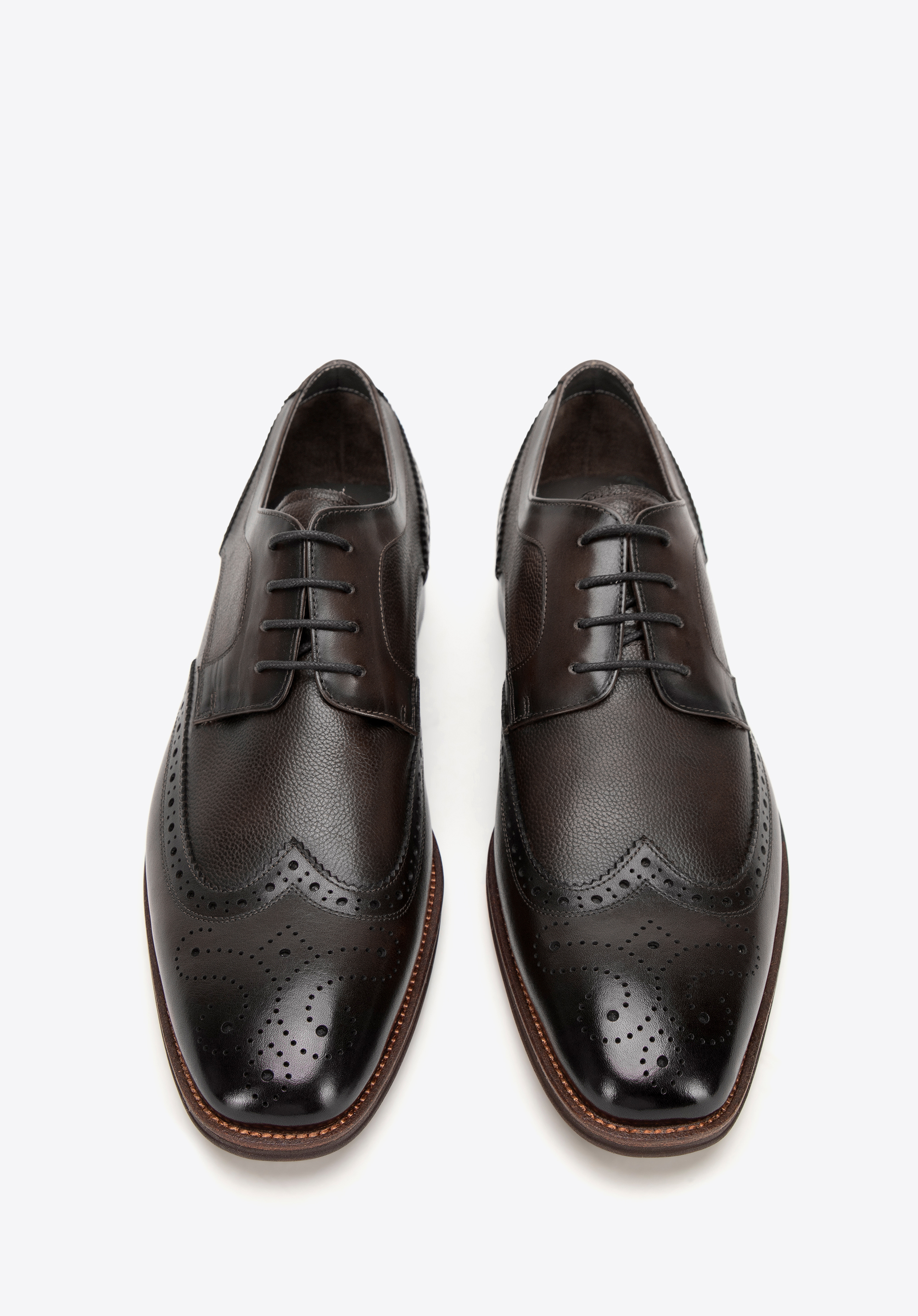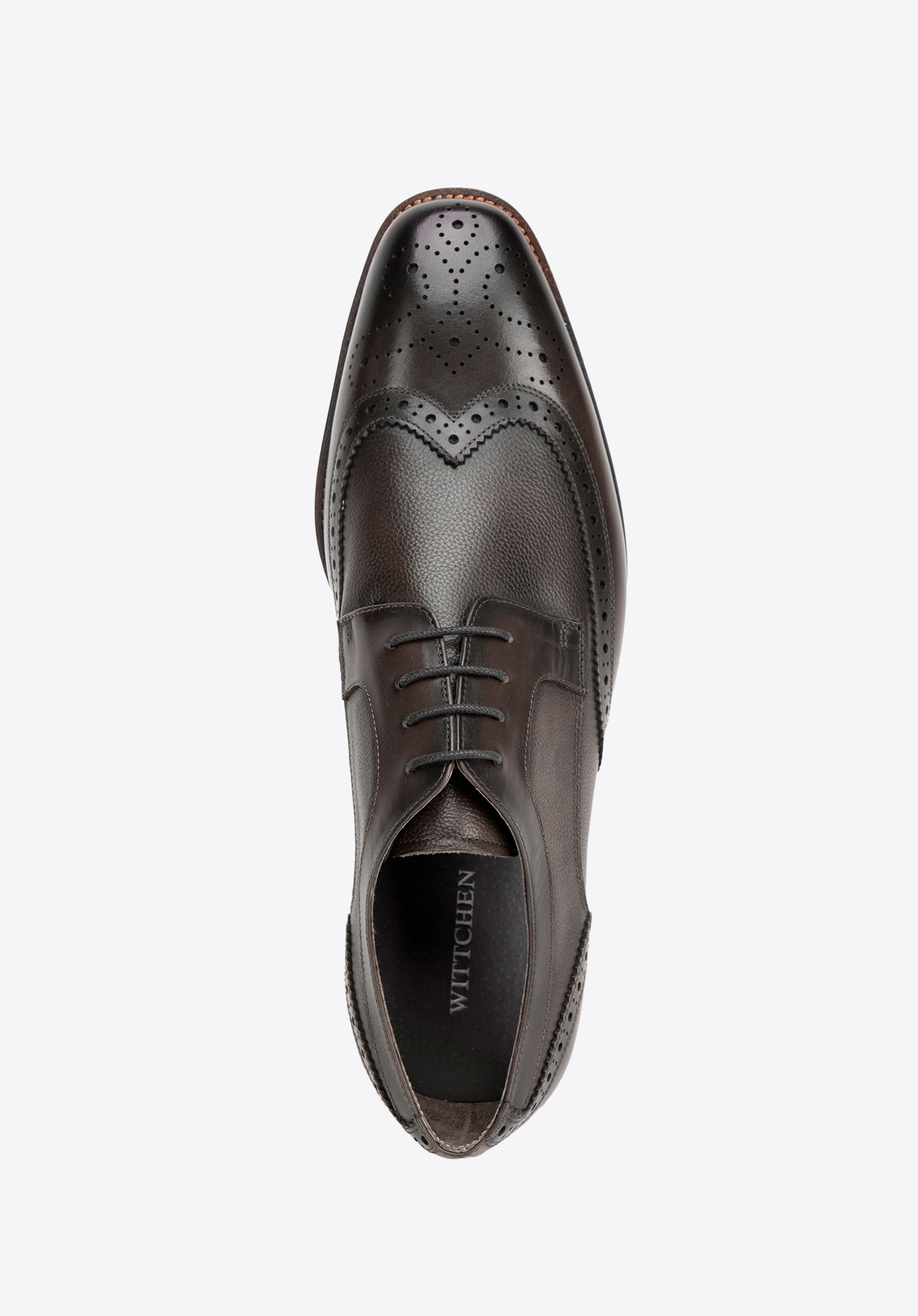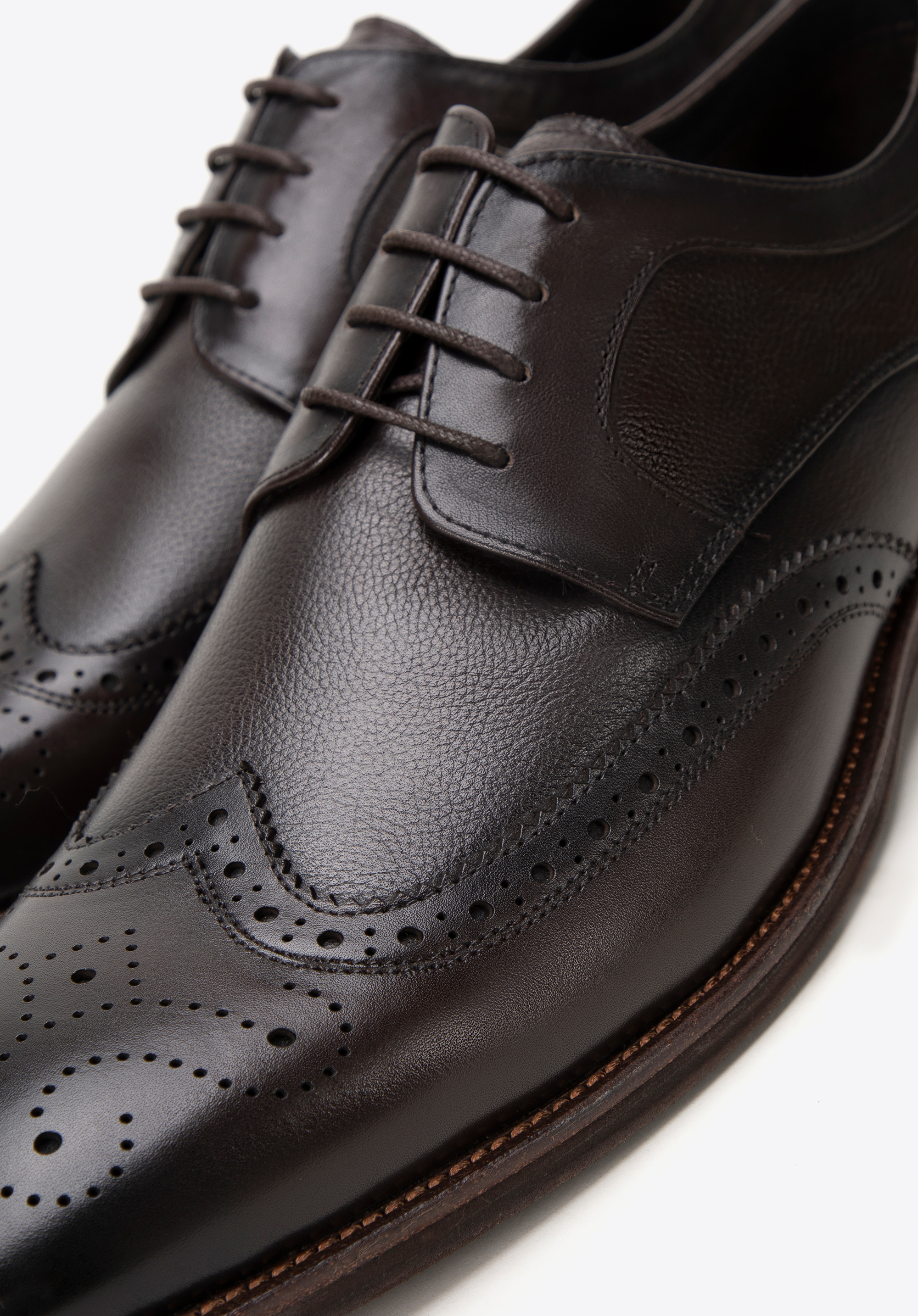 Ez a férfi cipő nemcsak a minőség, hanem a luxus és a stílus szimbóluma is. Prémium minőségű bőrből készült, és az elegáns szemcsés textúrát finom csillogással ötvözi. A bőr bélés páratlan kényelmet és tökéletes illeszkedést biztosít, így minden lépés élvezet lesz ebben a cipőben. A klasszikus lekerekített orr és a finom perforációkkal ellátott fűző eleganciát és kifinomultságot kölcsönöz, így ideális választás minden alkalomra.