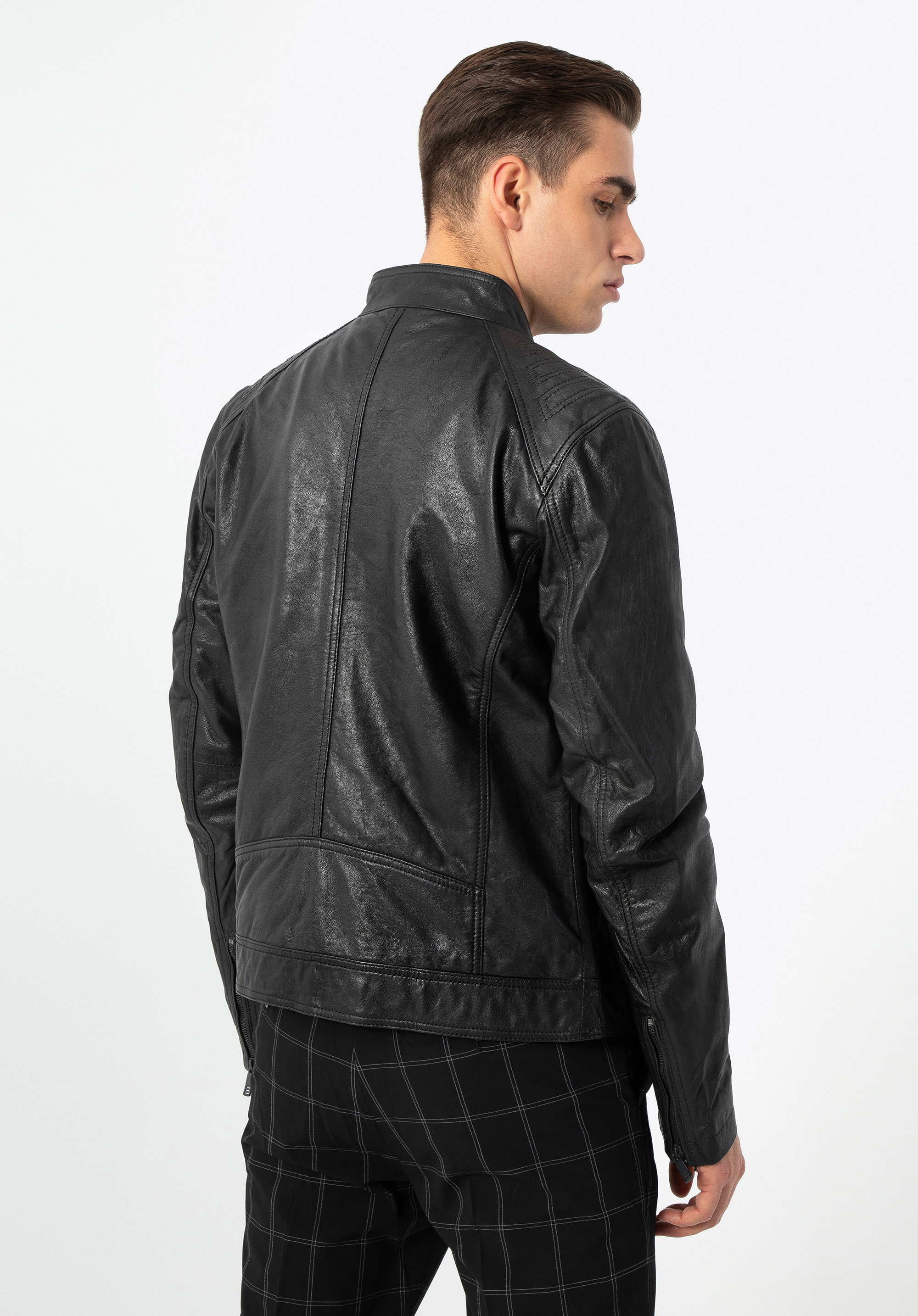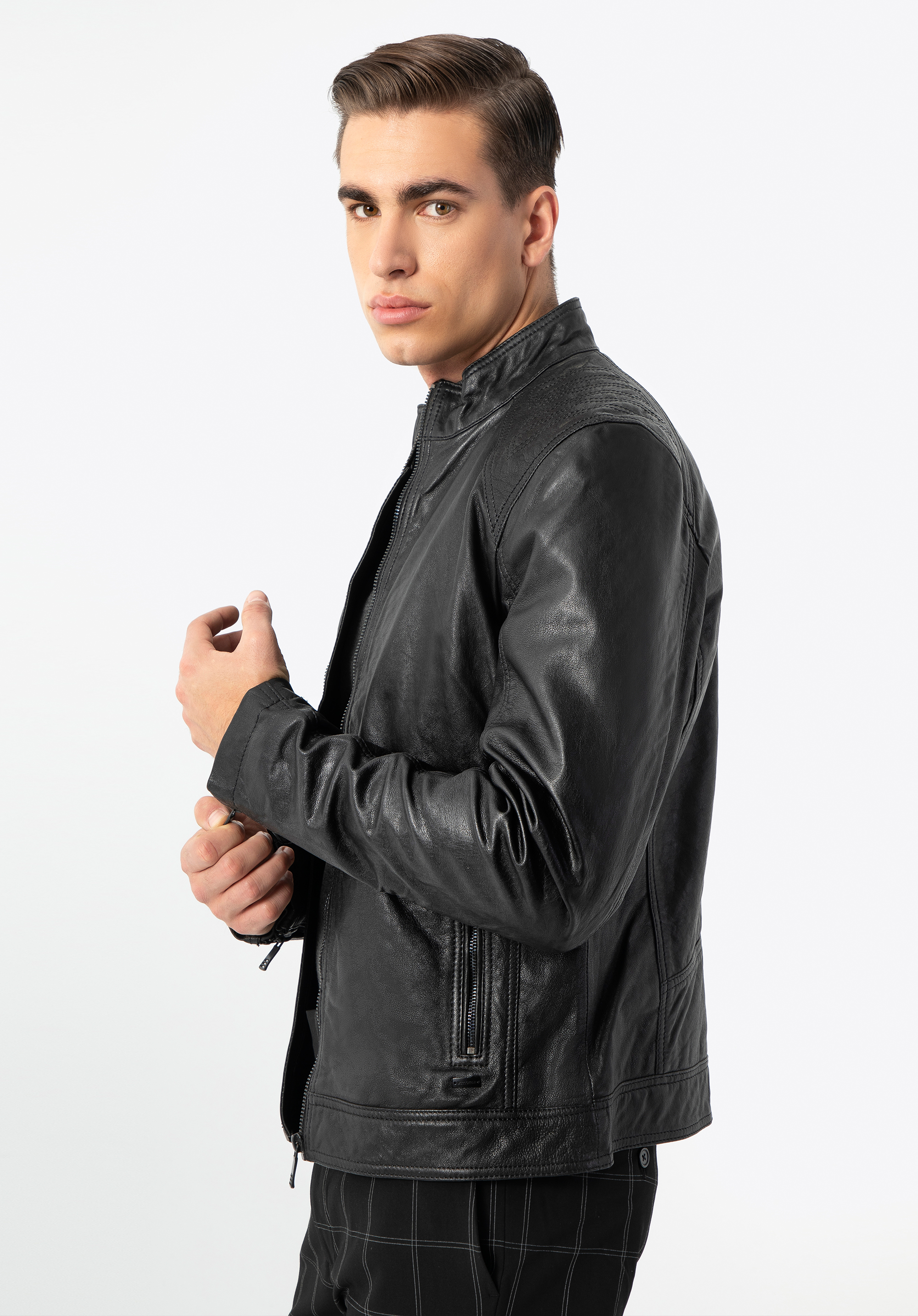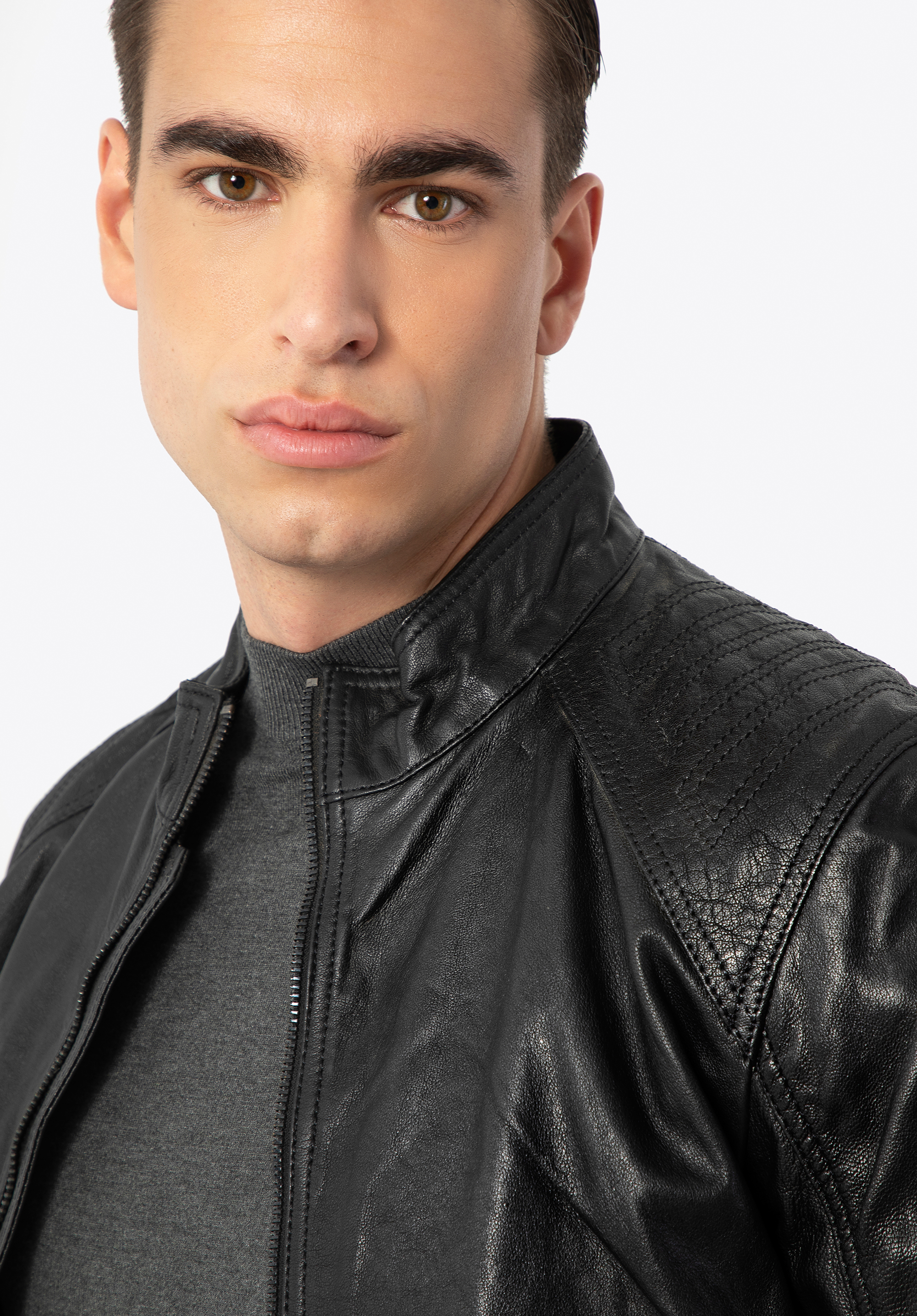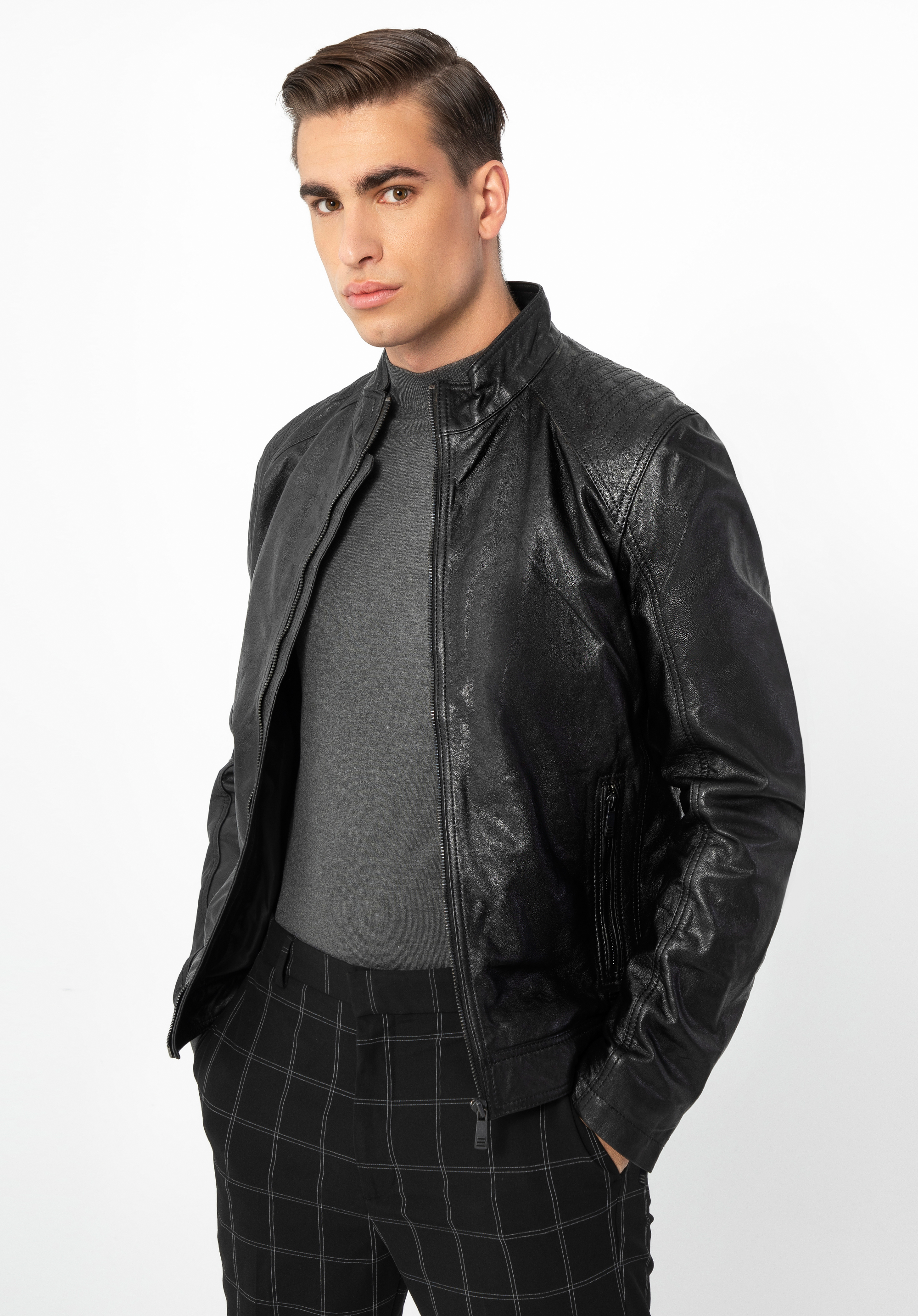Ennek a klasszikus kabátnak minden férfi ruhatárában ott kell lennie. Kiváló minőségű báránybőrből készült, így a ruhatárad legtöbb ruhadarabjával összehangolható. Az egyszerű, minimalista szabást a vállakon diszkrét steppeléssel variáltuk, amely kiemeli a vállakat és férfiasabbá teszi a sziluettet. Az állógallér véd a széltől, míg a függőleges zsebek távol tartják a hideg levegőt. A mandzsettáknál lévő cipzárak nemcsak esztétikusak, hanem a mindennapokban is nagyobb szabadságot biztosítanak. Mindez pedig azt jelenti, hogy ez a férfi bőrdzseki évekig állandó társad lesz!