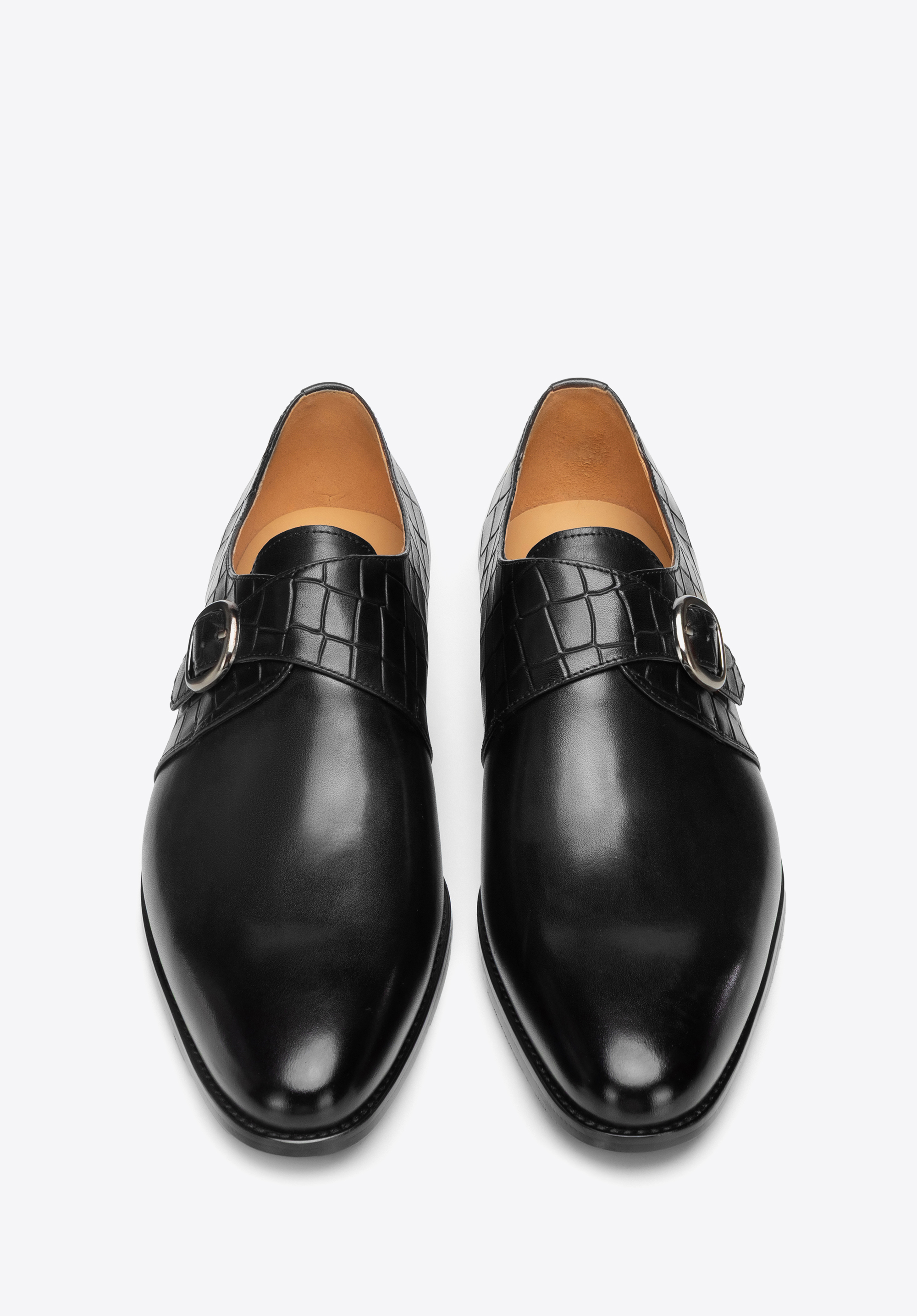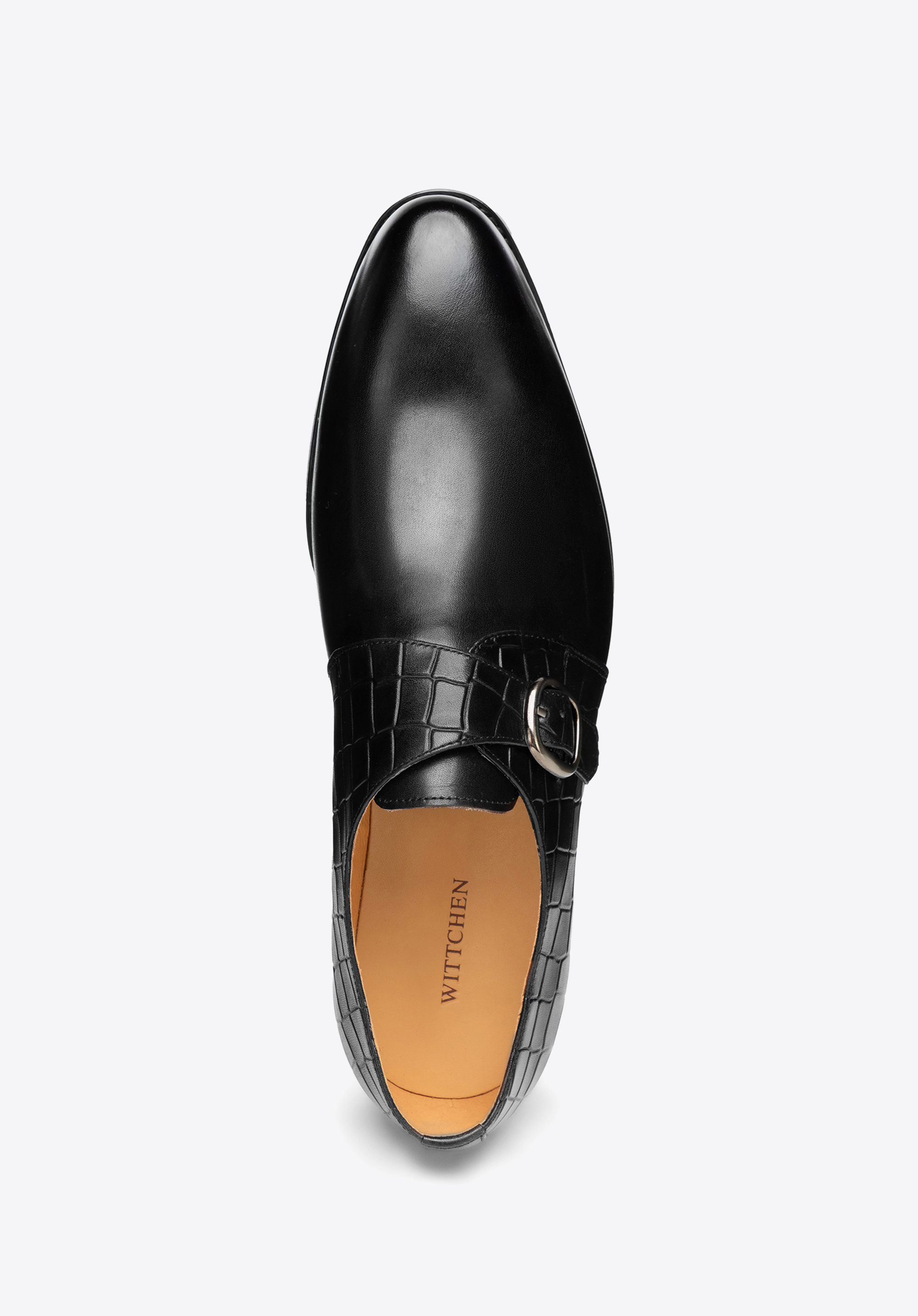 Fedezd fel a klasszikus dizájn és a finom luxus tökéletes keverékét ezzel aférfi bőrcipővel. Természetes sima bőrből készült, két textúrájú – sima és krokodilbőr – melyek stílust, tartósságot és kifinomult részleteket vonultatnak fel. A lekerekített orr letisztult, elegáns megjelenést kölcsönöz, míg az egyetlen csattal rögzíthető rész karaktert ad és kiemeli a modern, minimalista dizájnt. A lapos sarok és a gumitalp kényelmet és stabilitást nyújtanak bármilyen alkalomra.