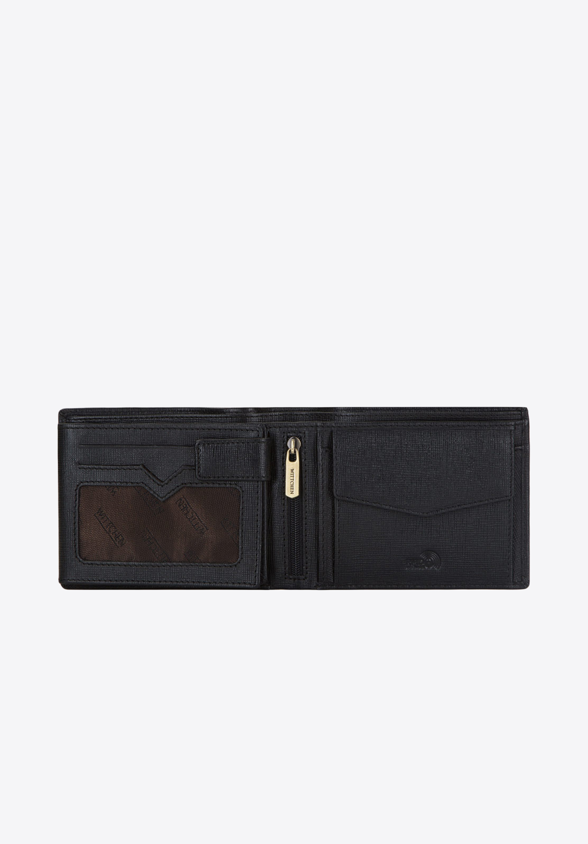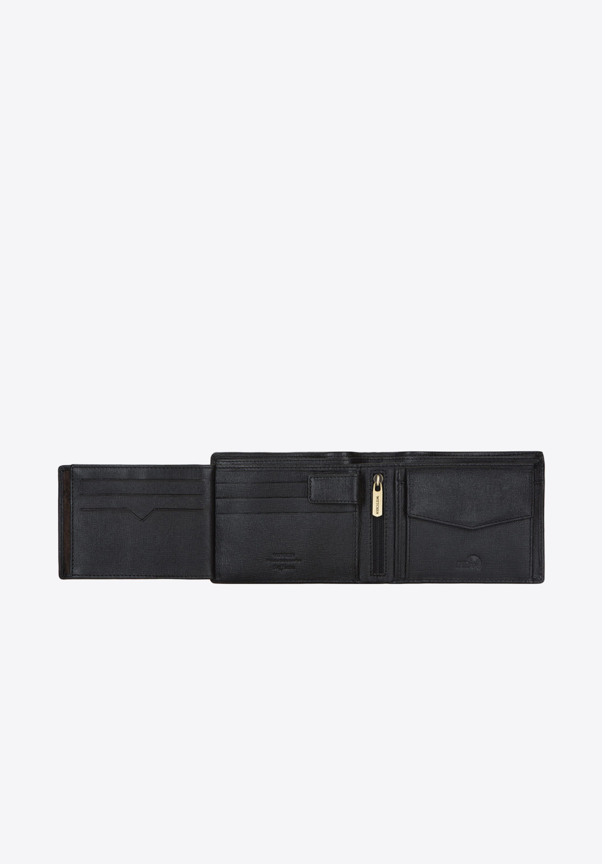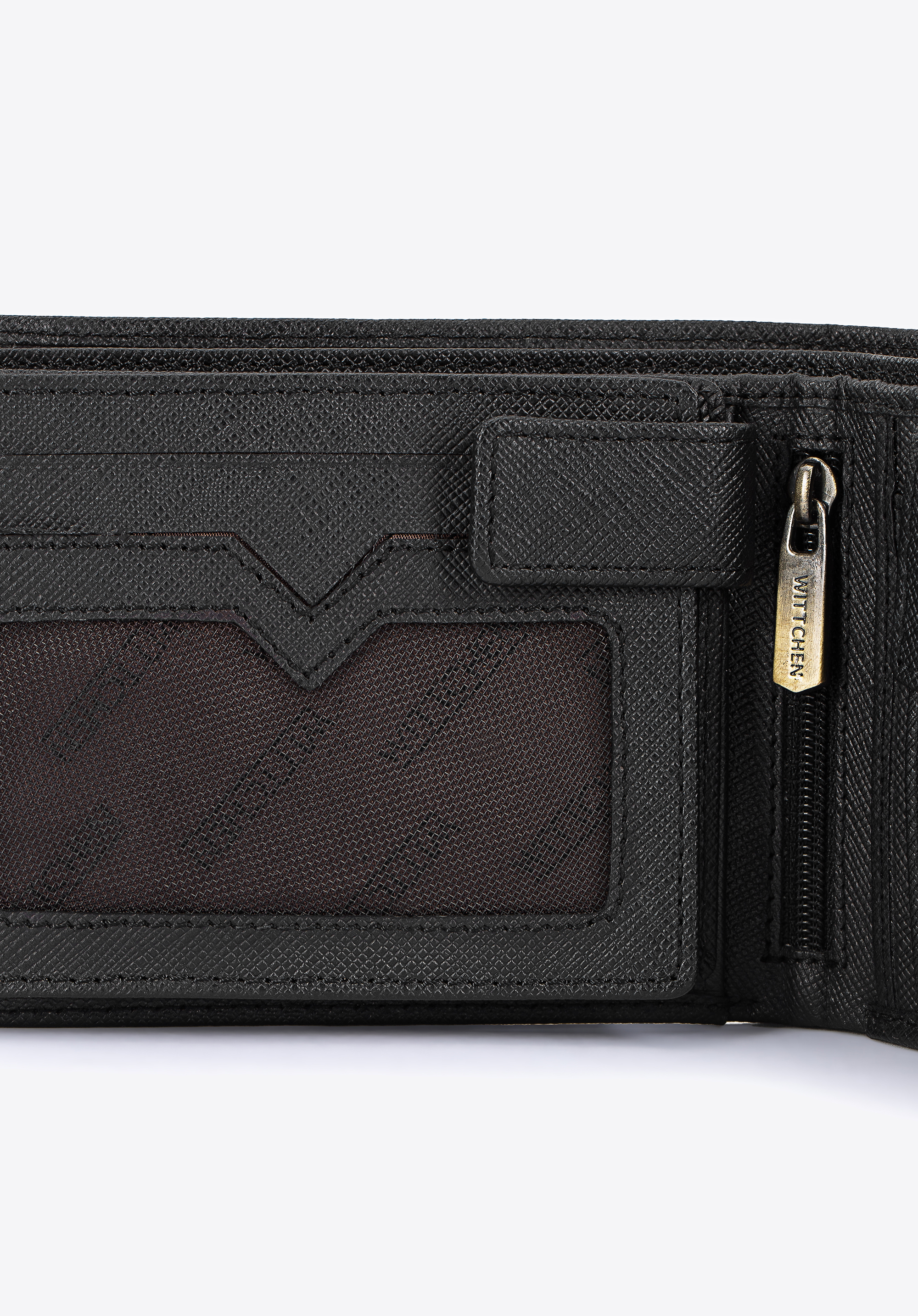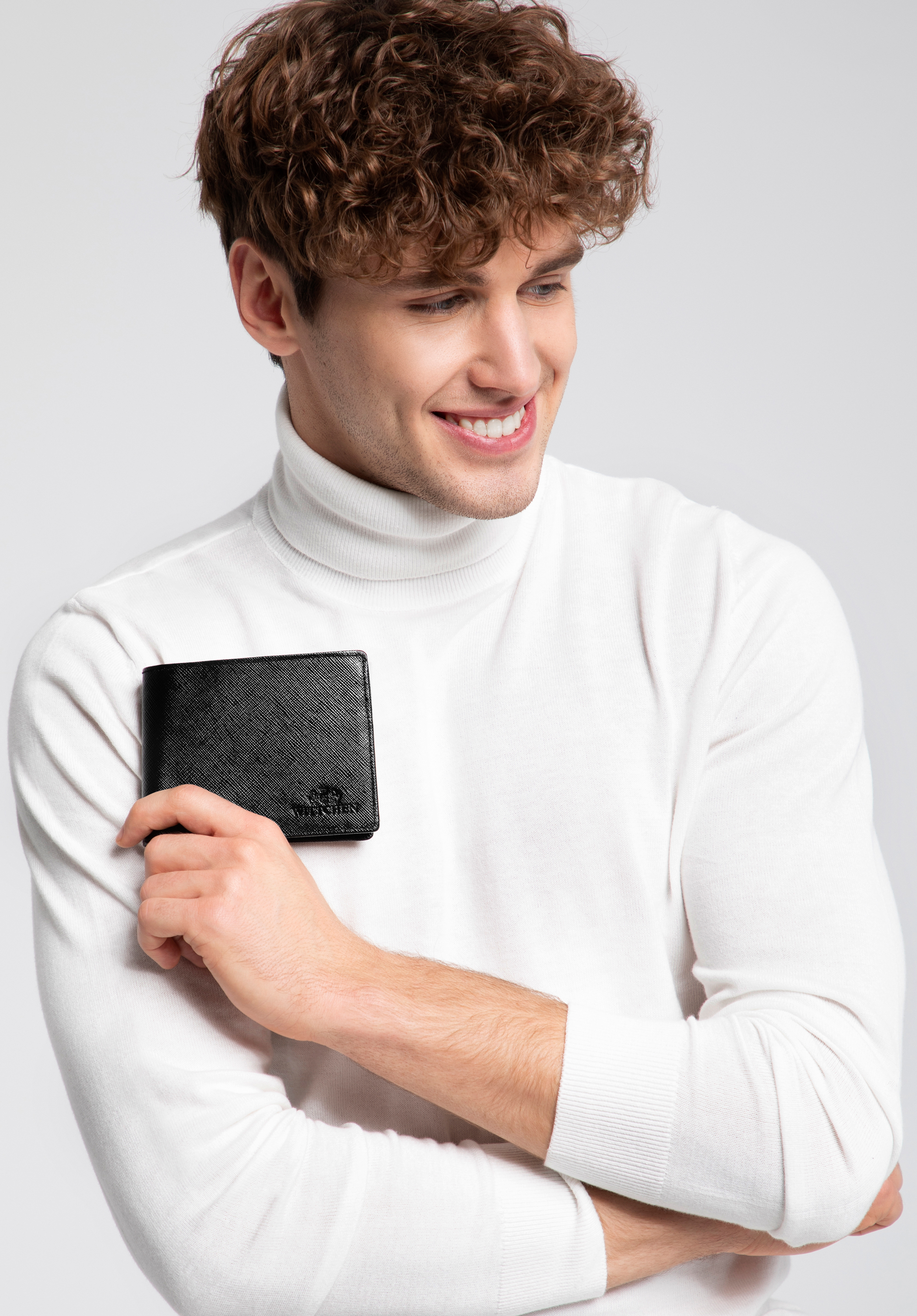Fekete férfi pénztárca hagyományos formával és funkcionálisan bővíthető szerkezettel. A modell a modern megoldásokat és a legmagasabb gyártási minőséget elváró férfiaknak fog örömet okozni. A különböző zsebek lehetővé teszik számos szükséges dolog tárolását.
