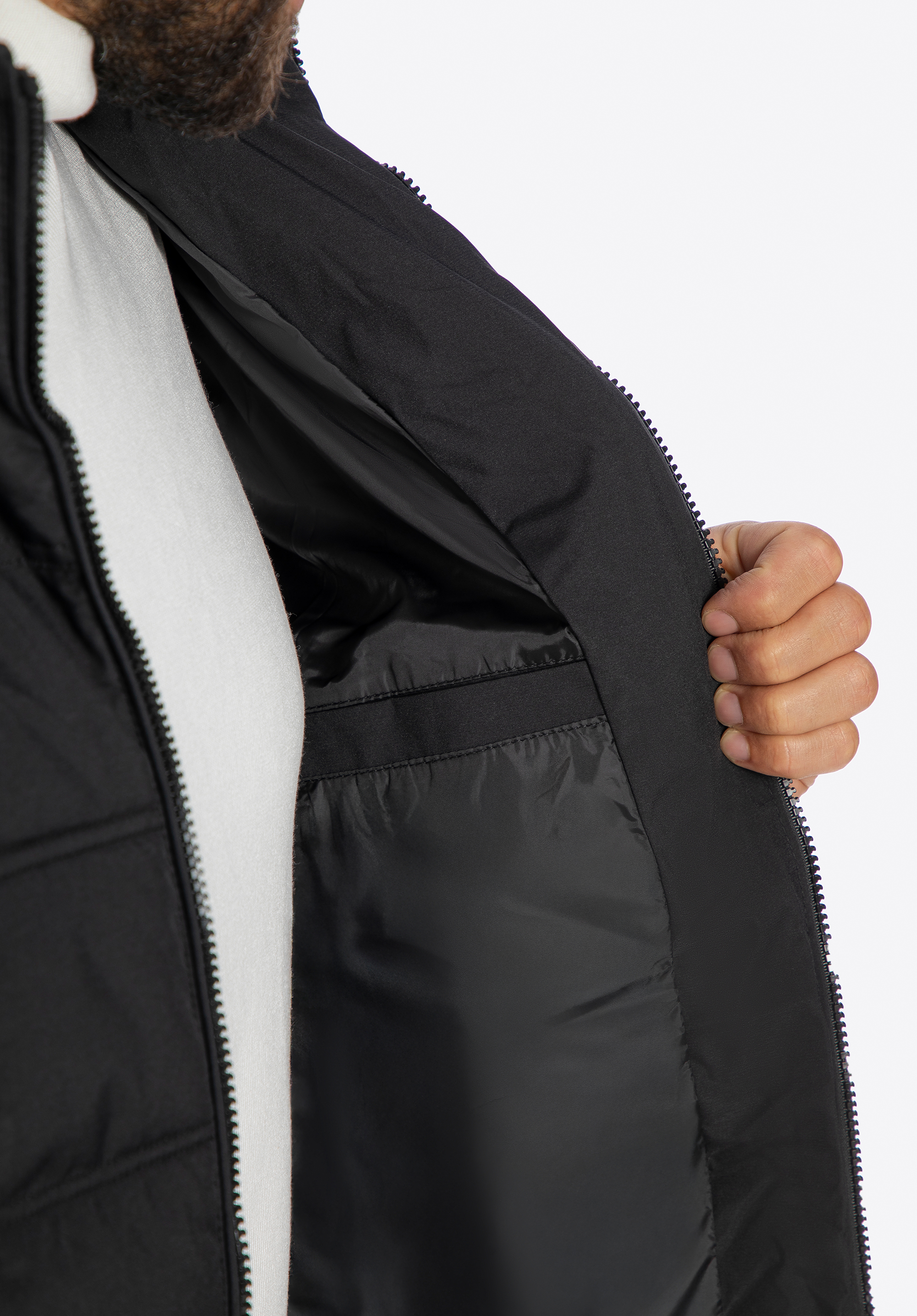 - Márkás részletek: A cipzár és a rögzítőelemek hangsúlyozzák a kabát modern, prémium megjelenését.
