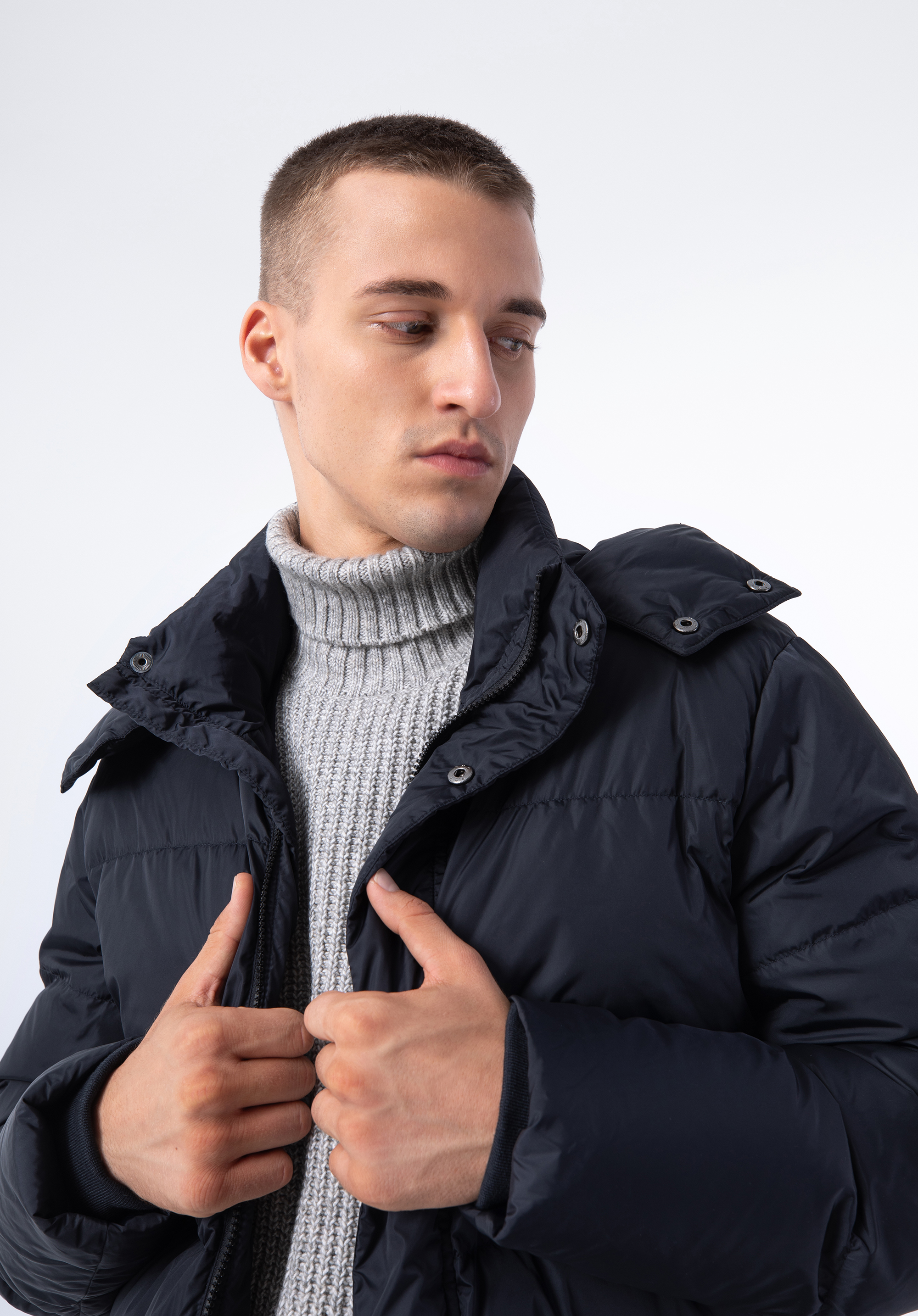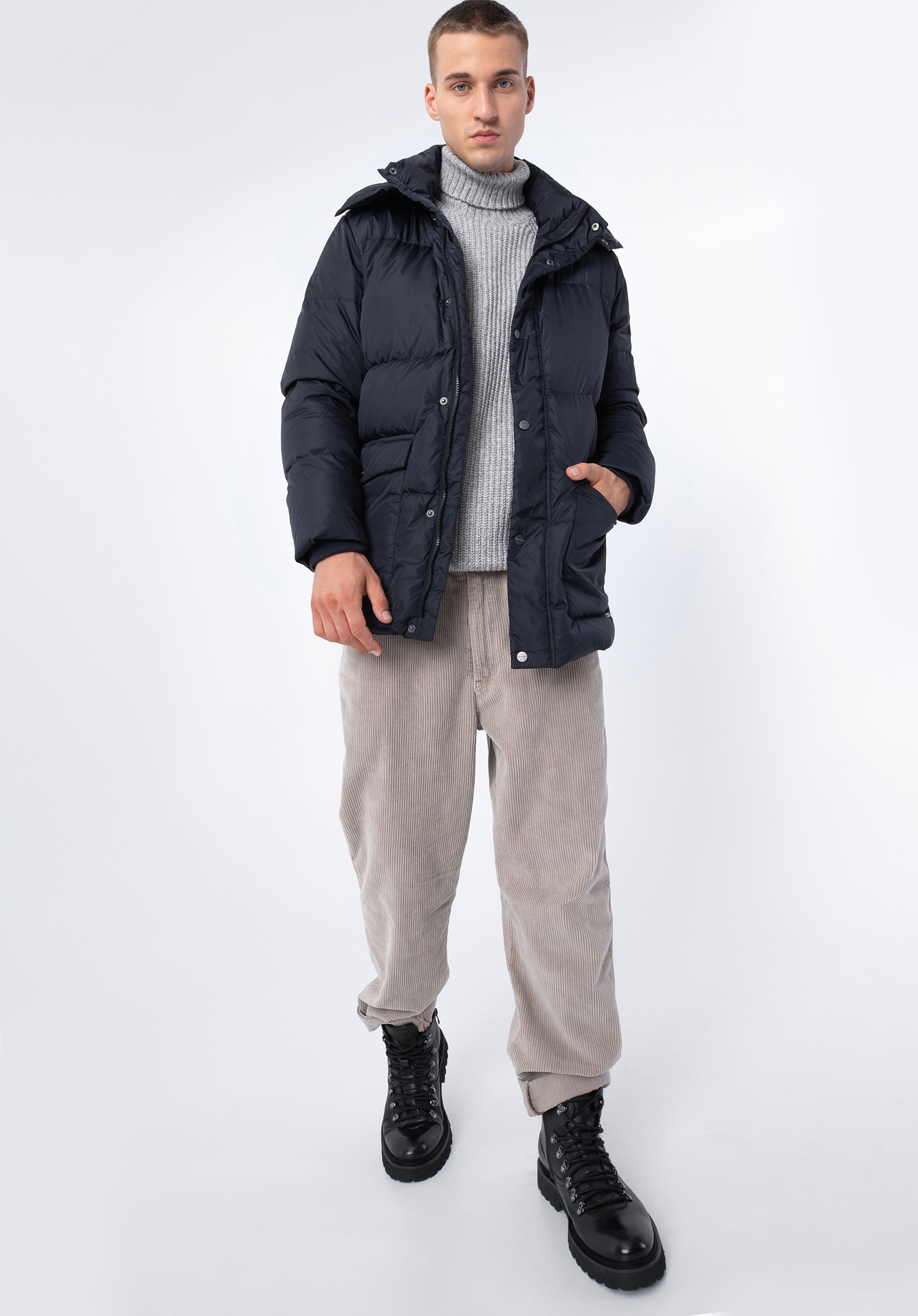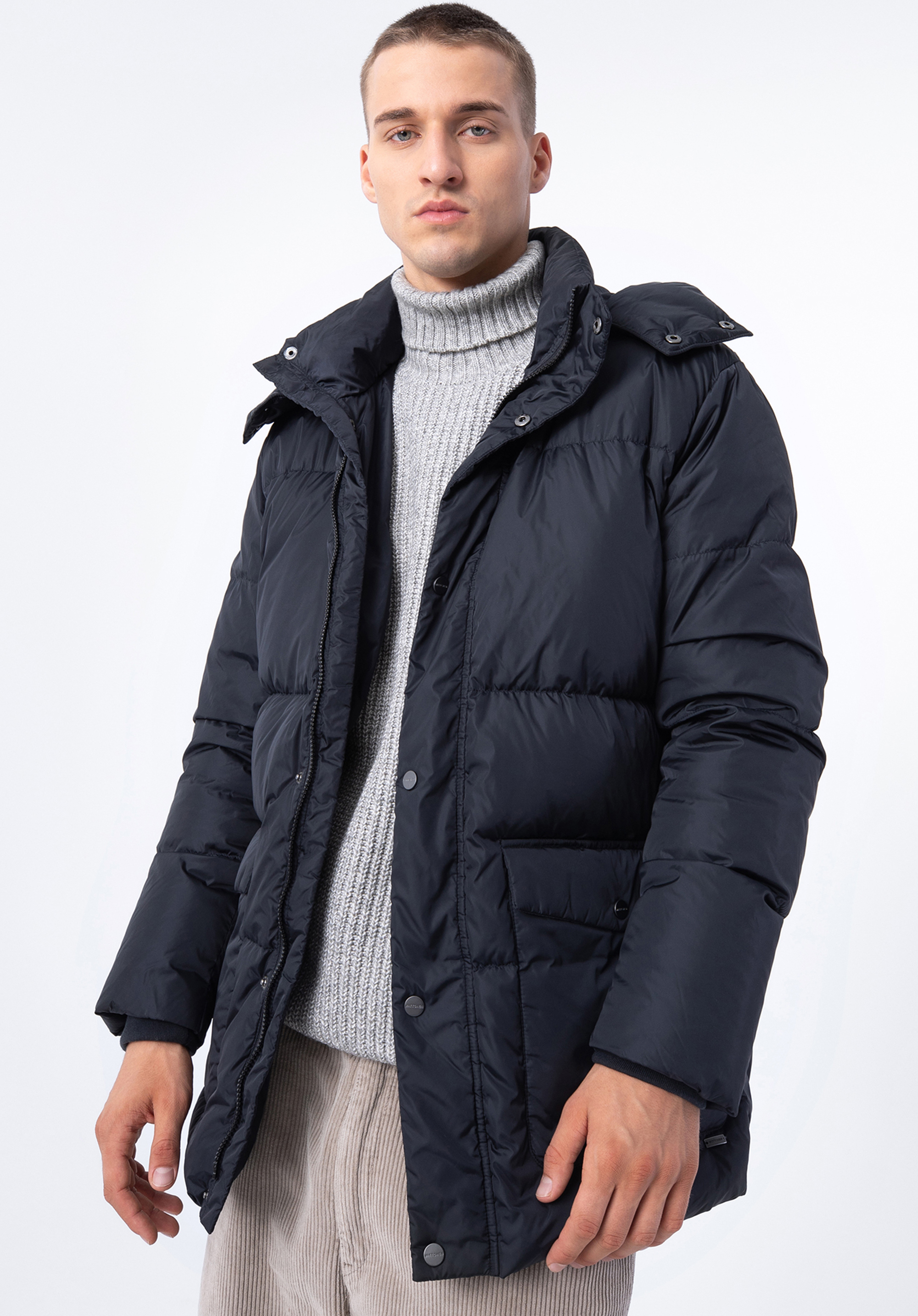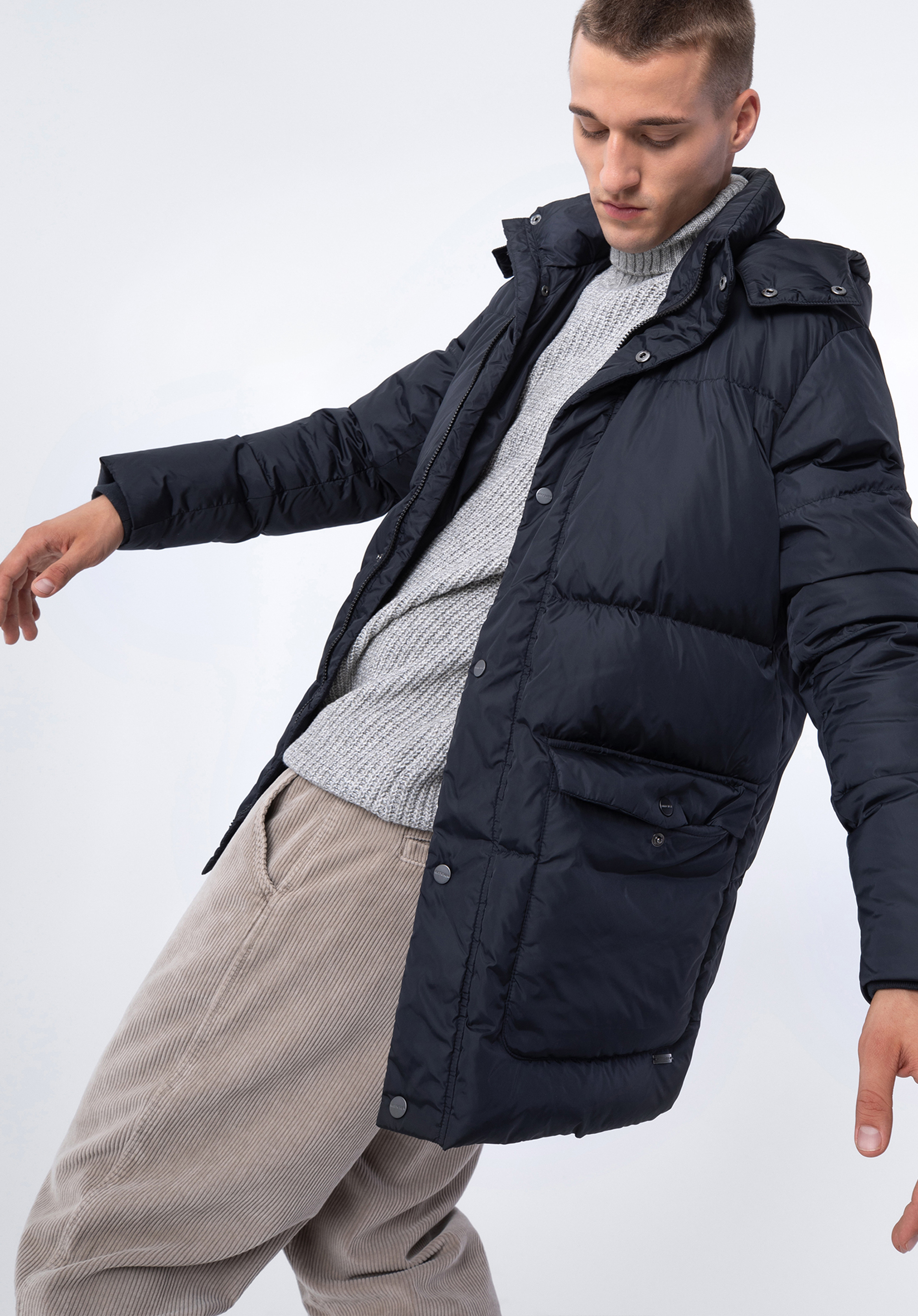 Ez a kabát őszre és télre remek választás minden férfi számára. Nejlonból készült és 70% kacsa pehely és 30% kacsatoll töltelékének köszönhetően melegen tart az igazán hideg napokon. Az elülső zsebekben kényelmesen tárolhatod a kezed és az apróbb tárgyakat . Az ujjakon kötött mandzsetta is található, amely még jobban megvéd a hideg ellen. Az egyszerű, kapucnival ellátott kialakítás szinte bármilyen ruhához passzolni fog. Minden nap viselheted munkába és munka után – időtlen és univerzális. A férfi steppelt kapucnis tollkabát praktikus és stílusos kiegészítő, amit mindennap viselhetsz.