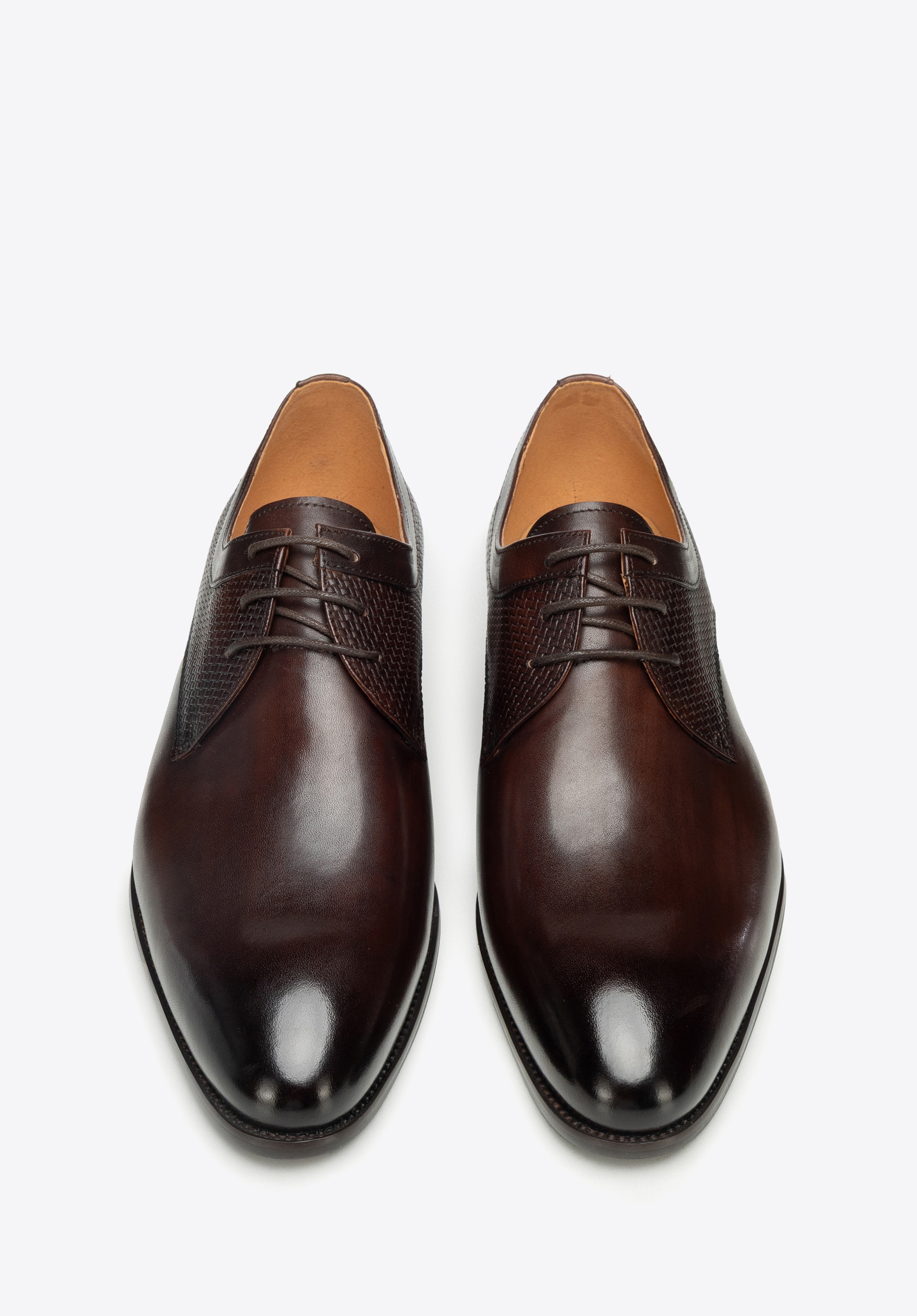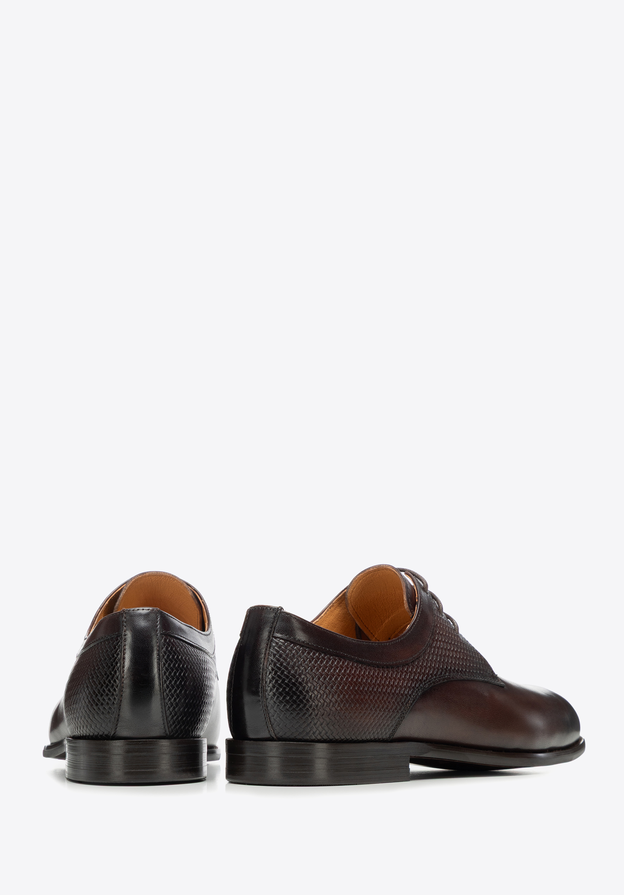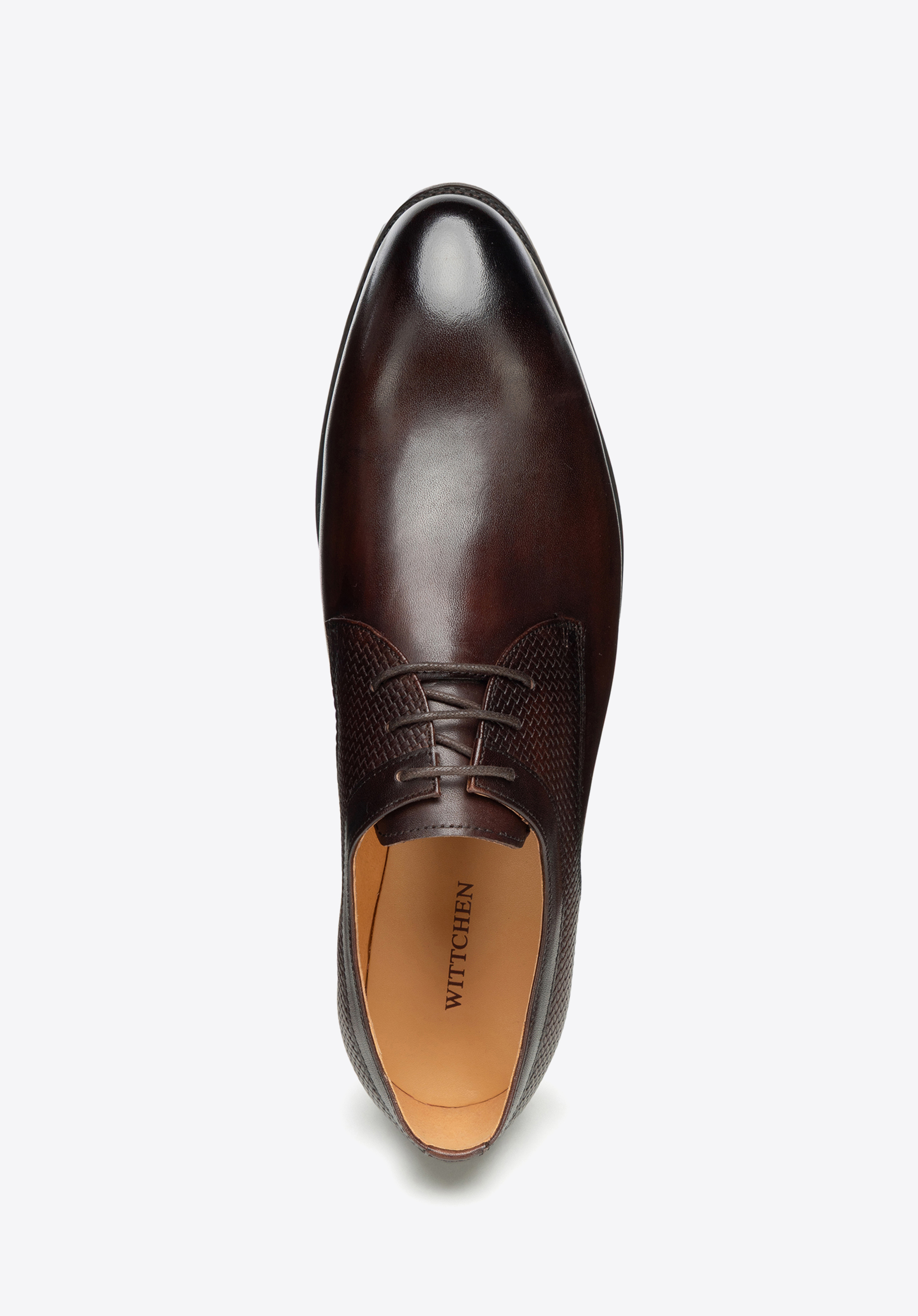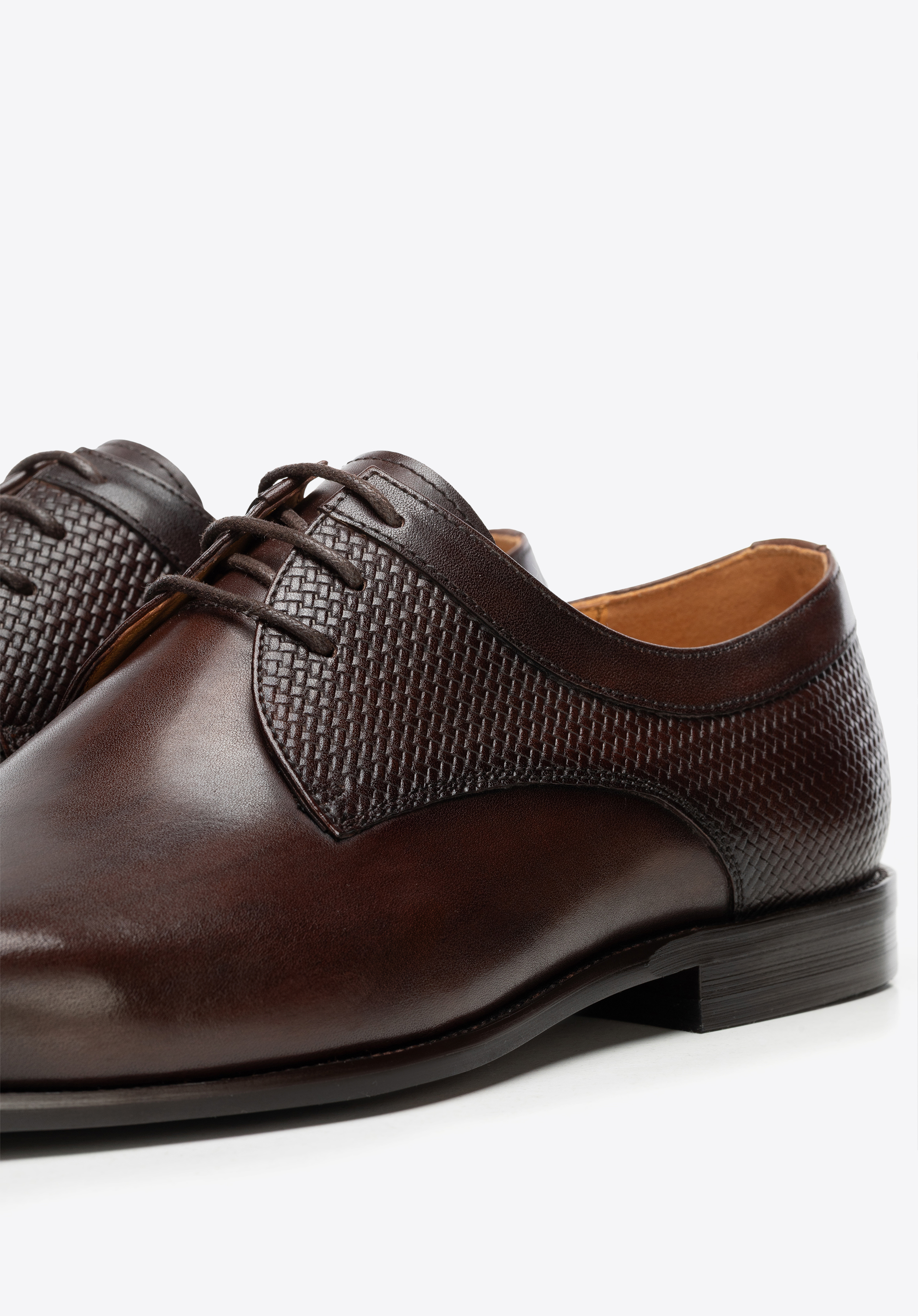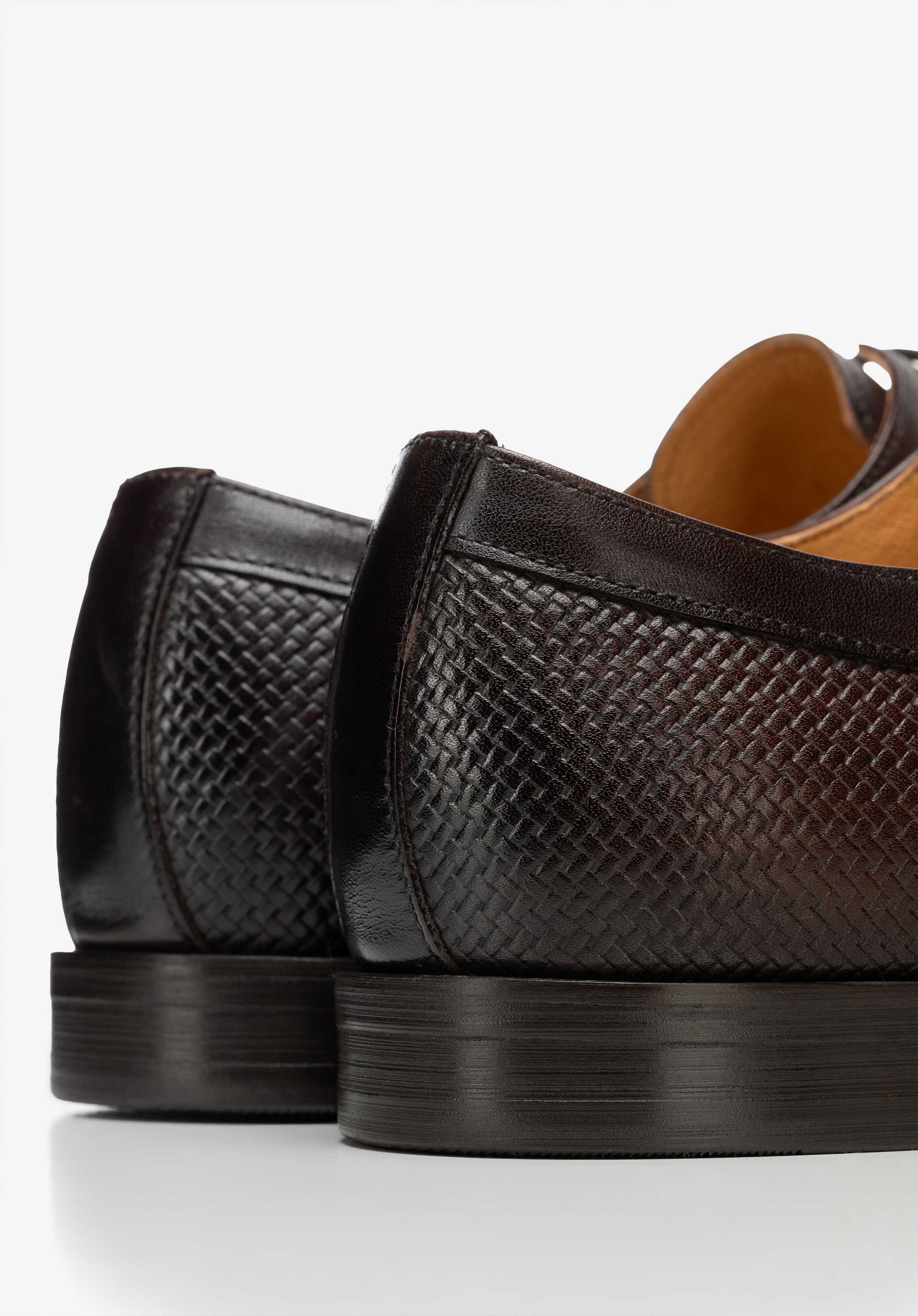 Ez a kifinomult férfi öltönycipő az időtlen formavilágot divatos, modern részletekkel ötvözi. Prémium, teljes kiőrlésű bőrből készült, amely két textúrával – simával és szőttel – rendelkezik, így egyedi karaktert és aprólékos kidolgozást sugároz. A bőr finom csillogása fokozza eleganciáját, míg a kontrasztos textúrák mélységet és stílusos megjelenést kölcsönöznek. Klasszikus dizájnjával ez a cipő tökéletes irodába vagy különleges alkalmakra egyaránt.
