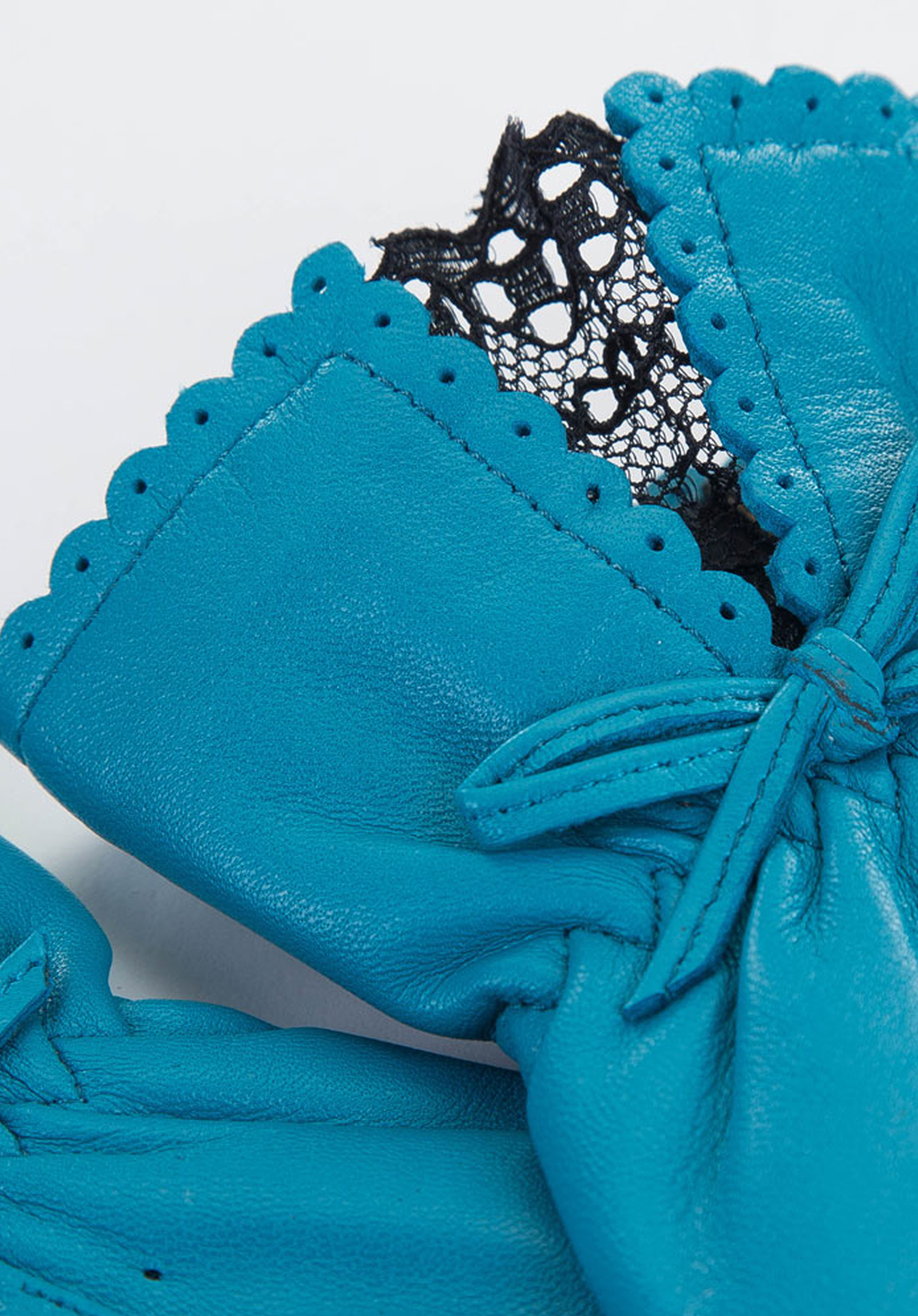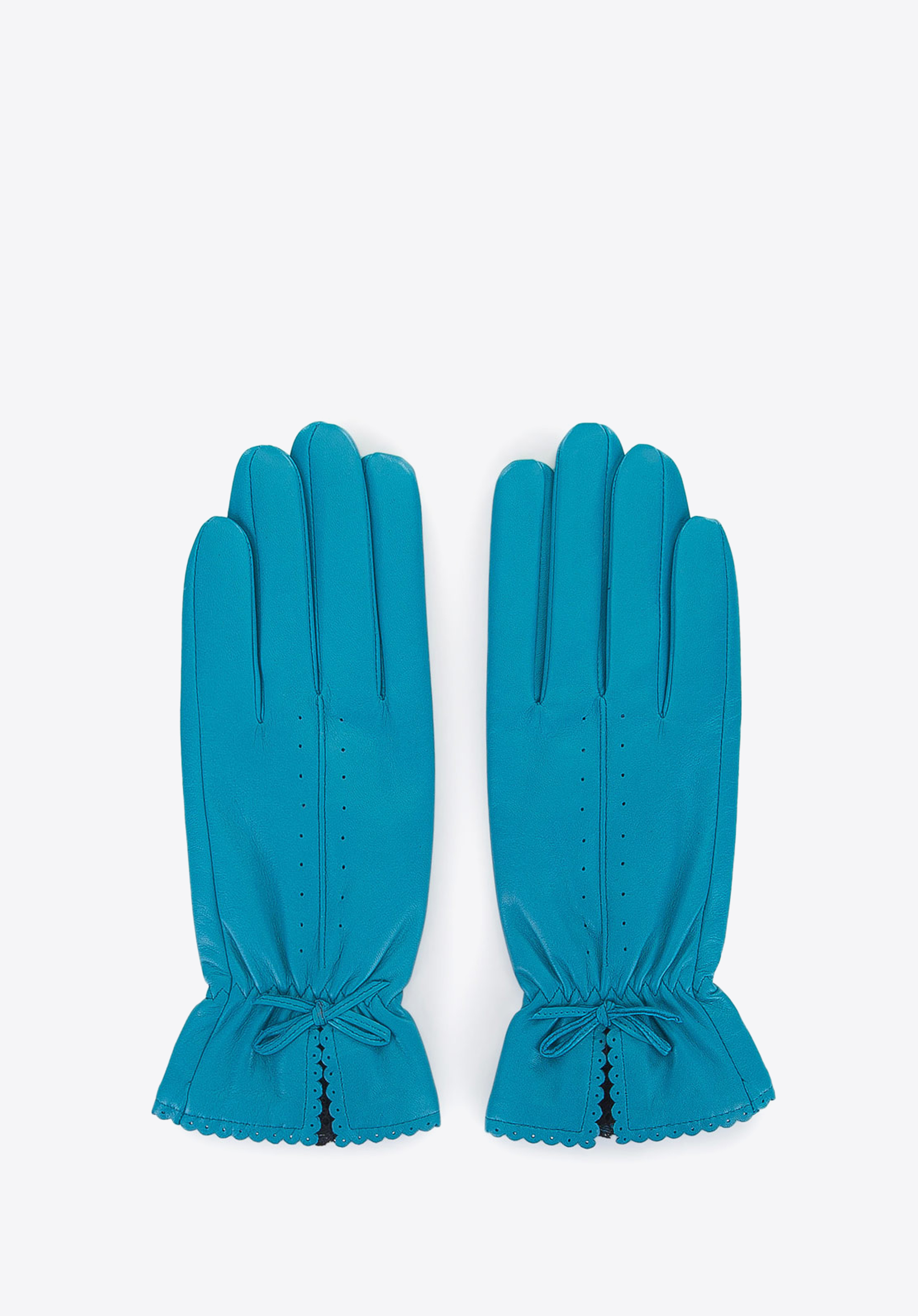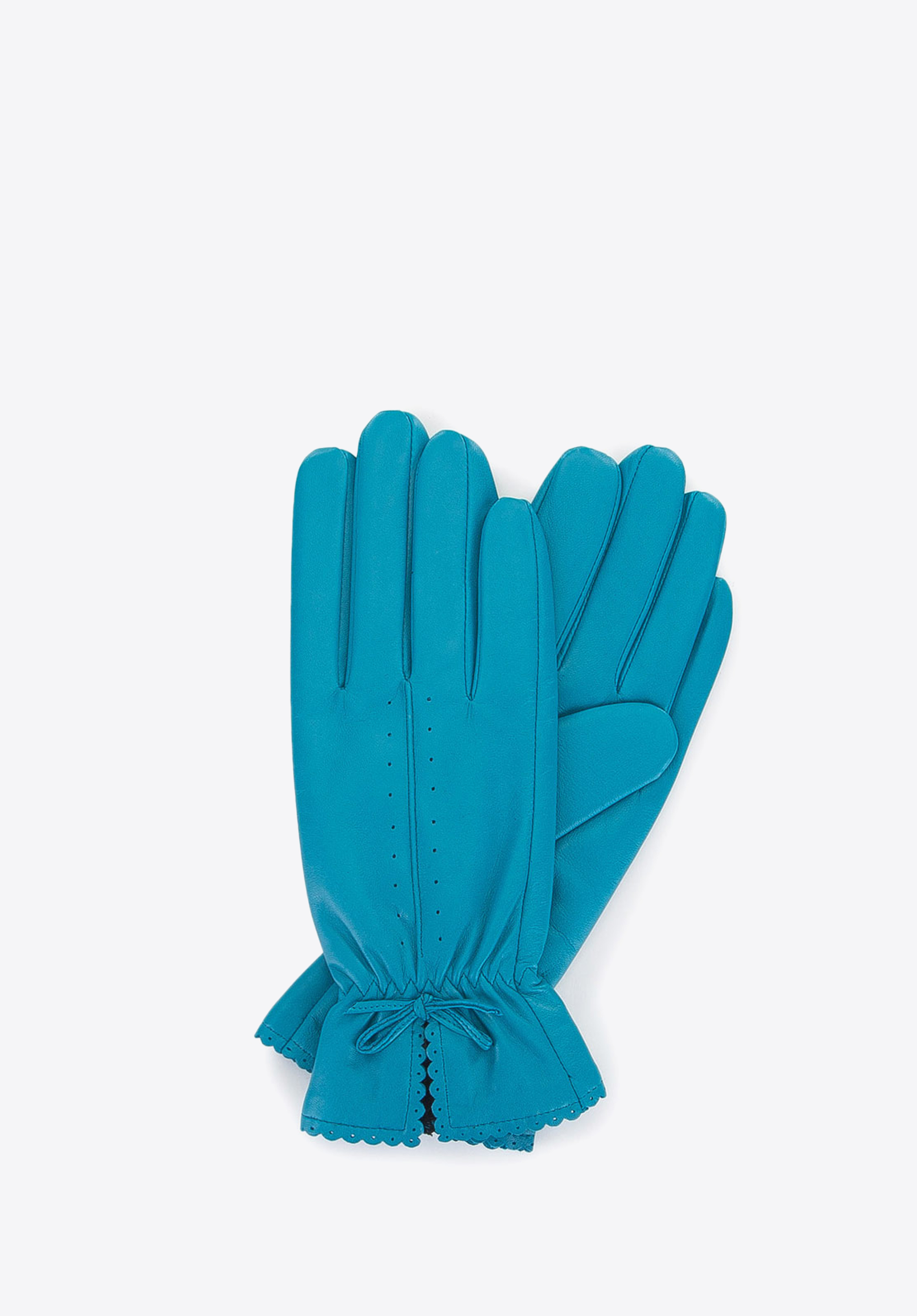 Egyszerű, mégis bájos bőrkesztyű. A szegélyük stílusos fodros, a csuklónál pedig rugalmas csipke és egy finom masni díszíti a szegélyt. A dekoratív perforációk remekül néznek ki, de van egy másik funkciójuk is - állandó levegőellátást biztosítanak a kezeknek, így a kesztyűk tavasszal és ősszel is kiválóak. Kiváló minőségű természetes bőrből készültek, egységes színben. Ezek a fodros női bőrkesztyűk elegáns nőiességet kölcsönöznek majd megjelenésednek.