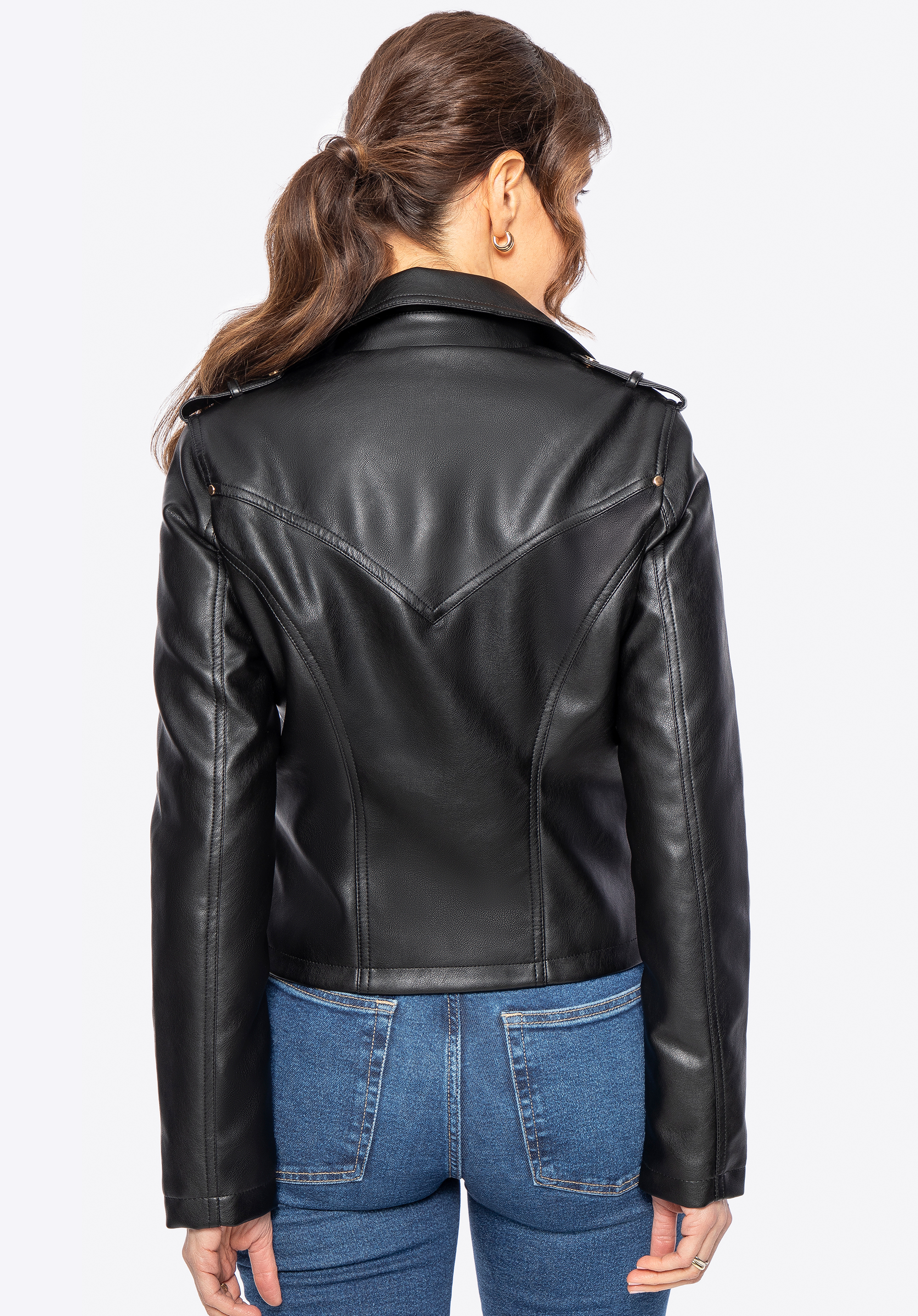 Ez a dzseki az időtlen elegancia és a modern karakter kombinációja - igazi divatnyilatkozat! Ökobőrből készült, nemcsak megjelenésével, hanem kényelmével is lenyűgöz. A karcsúsított szabás tökéletesen kiemeli a sziluettet, míg a fém díszítőelemek, köztük a gyártó logója az oldalán és a cipzárakon, finom eleganciát teremtenek. Az átlós cipzáras záródás, a határozott szabású vállak és a rajta található patentok, valamint a zsebeken és a galléron található szegecsek olyan részletek, egyedi karaktert és egy kis rockos jelleget kölcsönöznek a dzsekinek.
