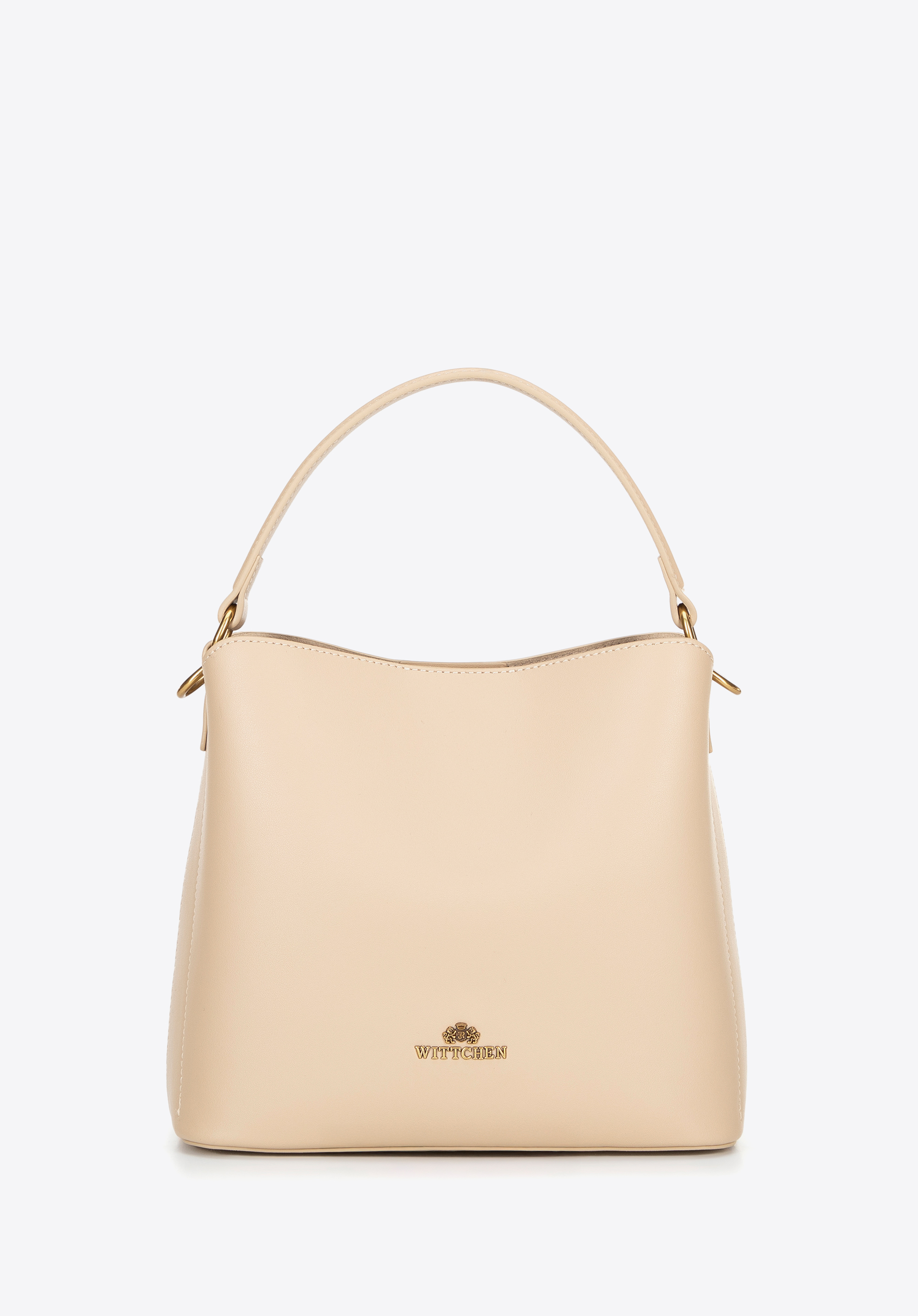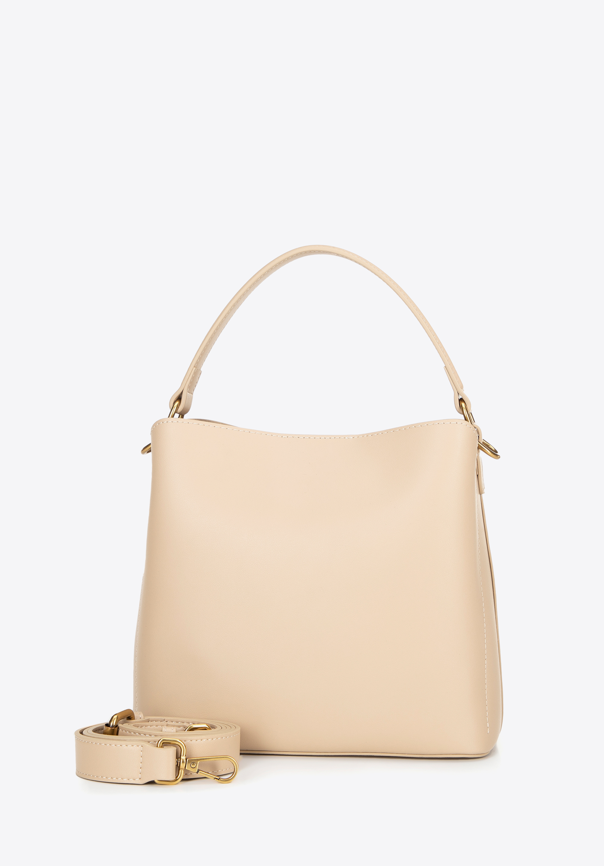 Ez az elegáns bőrönd ötvözi az időtlen dizájnt a funkcionalitással. A természetes bőrből készült váz kiemeli luxus jellegét, míg a bőrt imitáló mikroszálas pánt kényelmes hordozást biztosít. A táska háromrekeszes kialakítású - a főrekesz cipzáras, az oldalsó rekeszek mágneses csattal záródnak, belül pedig két zseb található, köztük egy cipzáras. A gyártó logója díszíti az elejét, a levehető és állítható pánt pedig lehetővé teszi, hogy a táska kézben vagy vállon hordható legyen.
