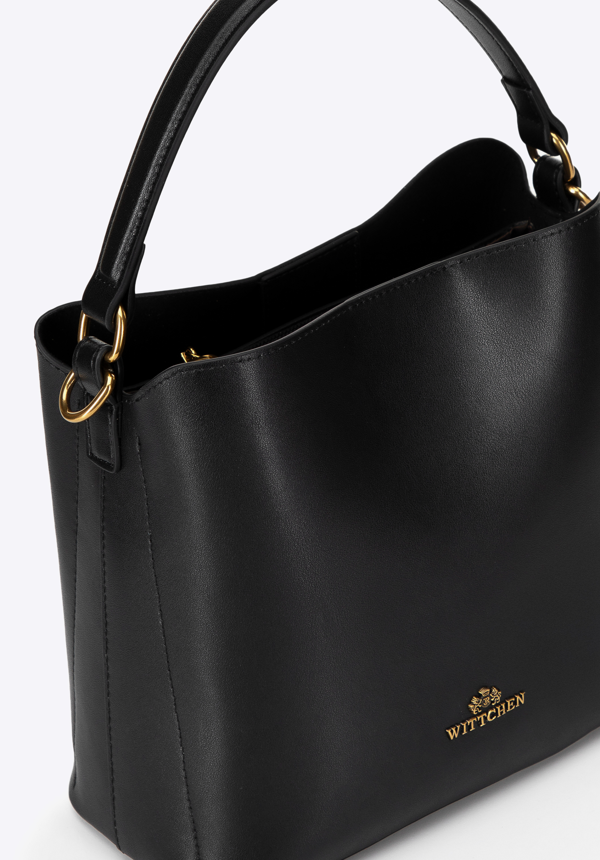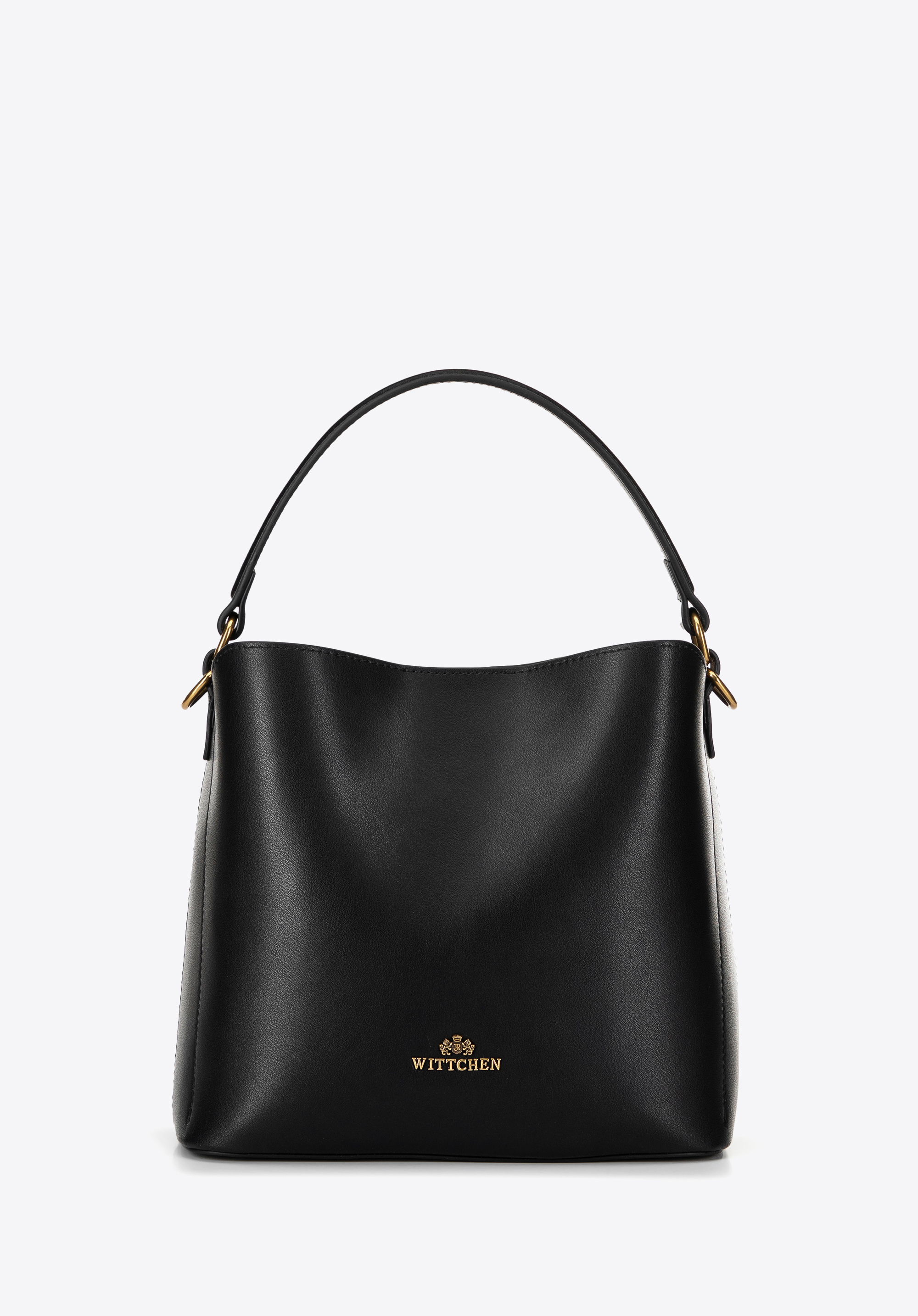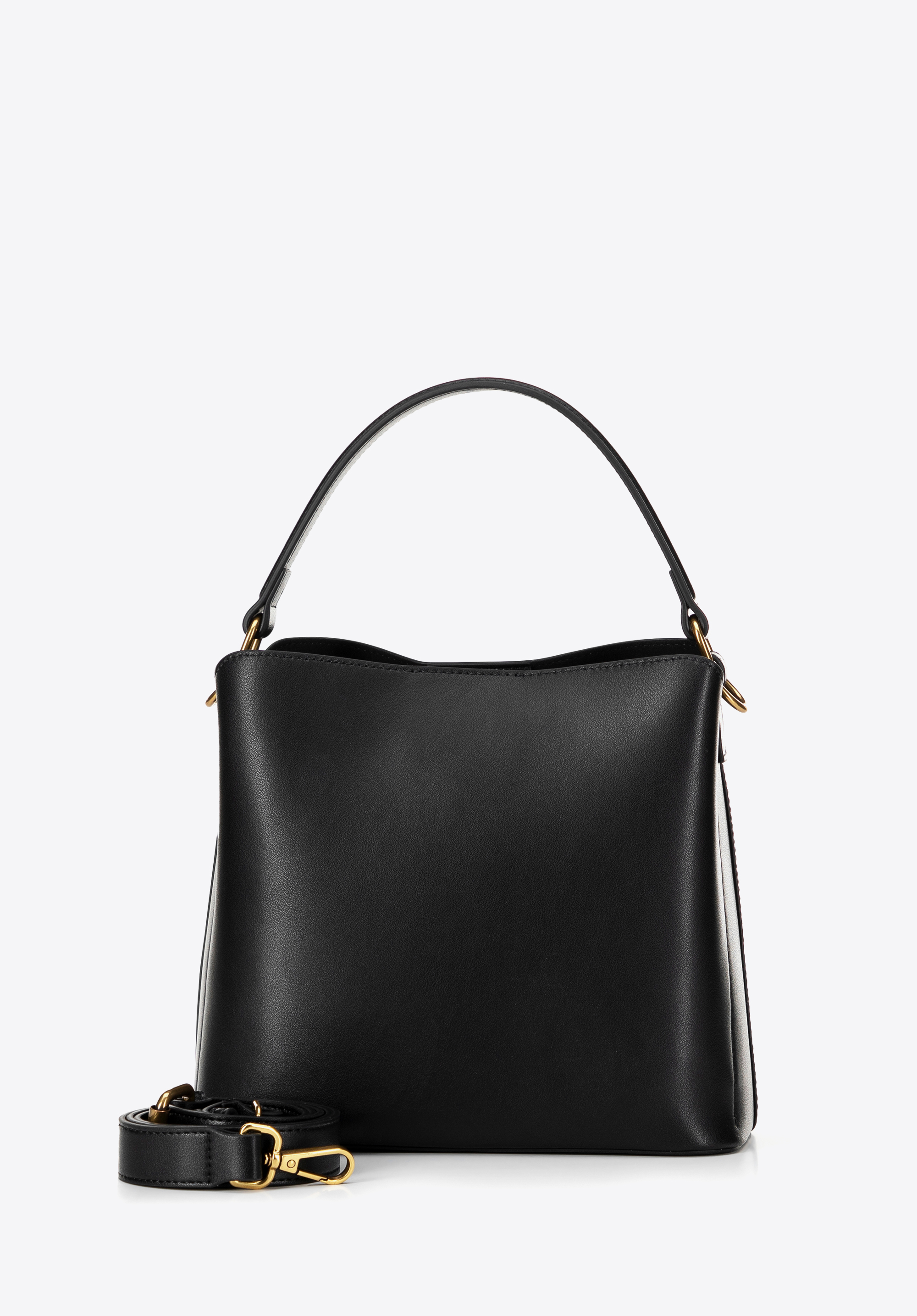 Ez az elegáns bőrönd ötvözi az időtlen dizájnt a funkcionalitással. A természetes bőrből készült váz kiemeli luxus jellegét, míg a bőrt imitáló mikroszálas pánt kényelmes hordozást biztosít. A táska háromrekeszes kialakítású - a főrekesz cipzáras, az oldalsó rekeszek mágneses csattal záródnak, belül pedig két zseb található, köztük egy cipzáras. A gyártó logója díszíti az elejét, a levehető és állítható pánt pedig lehetővé teszi, hogy a táska kézben vagy vállon hordható legyen.