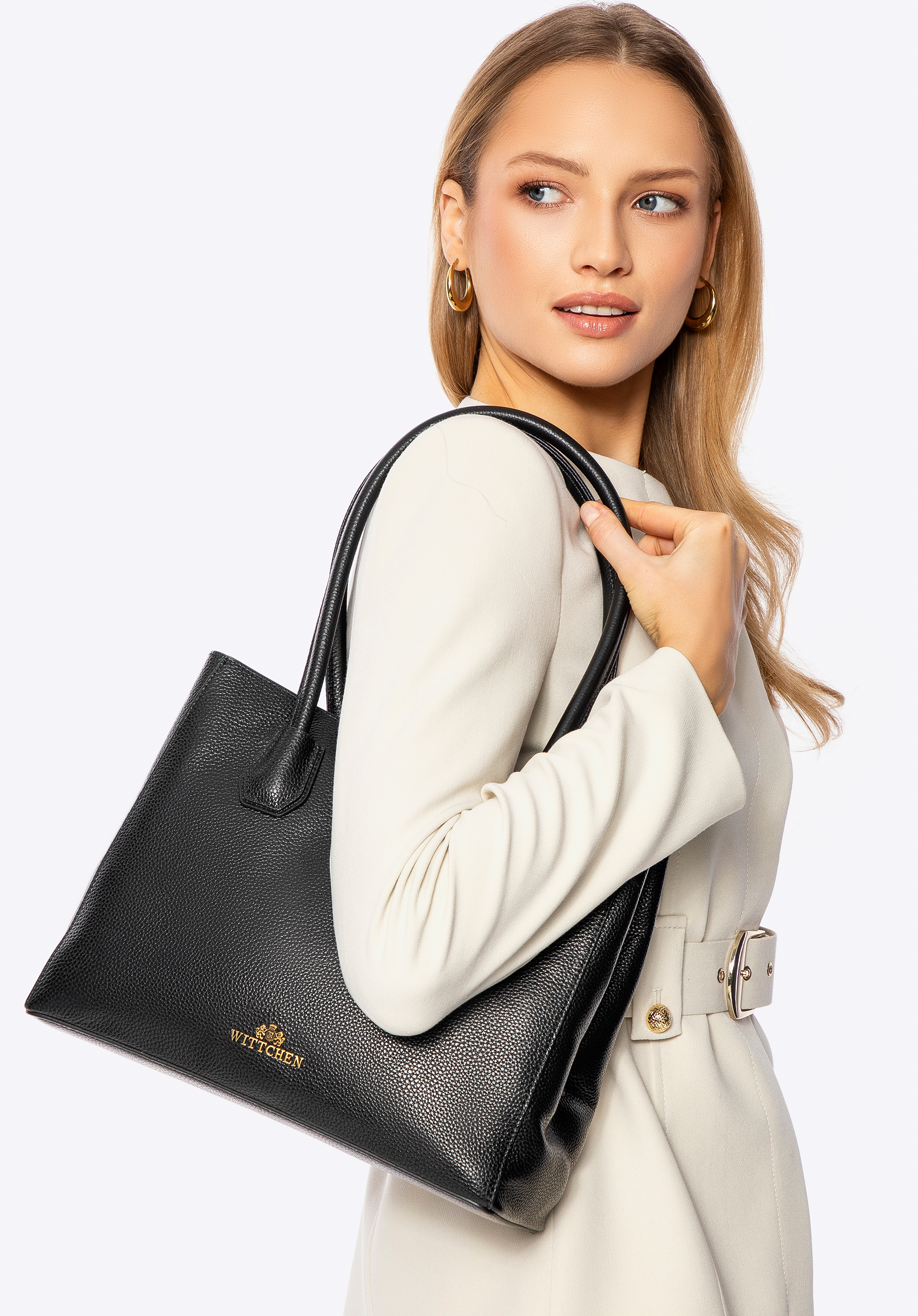 Háromrekeszes női bőr kézitáska - fekete-arany