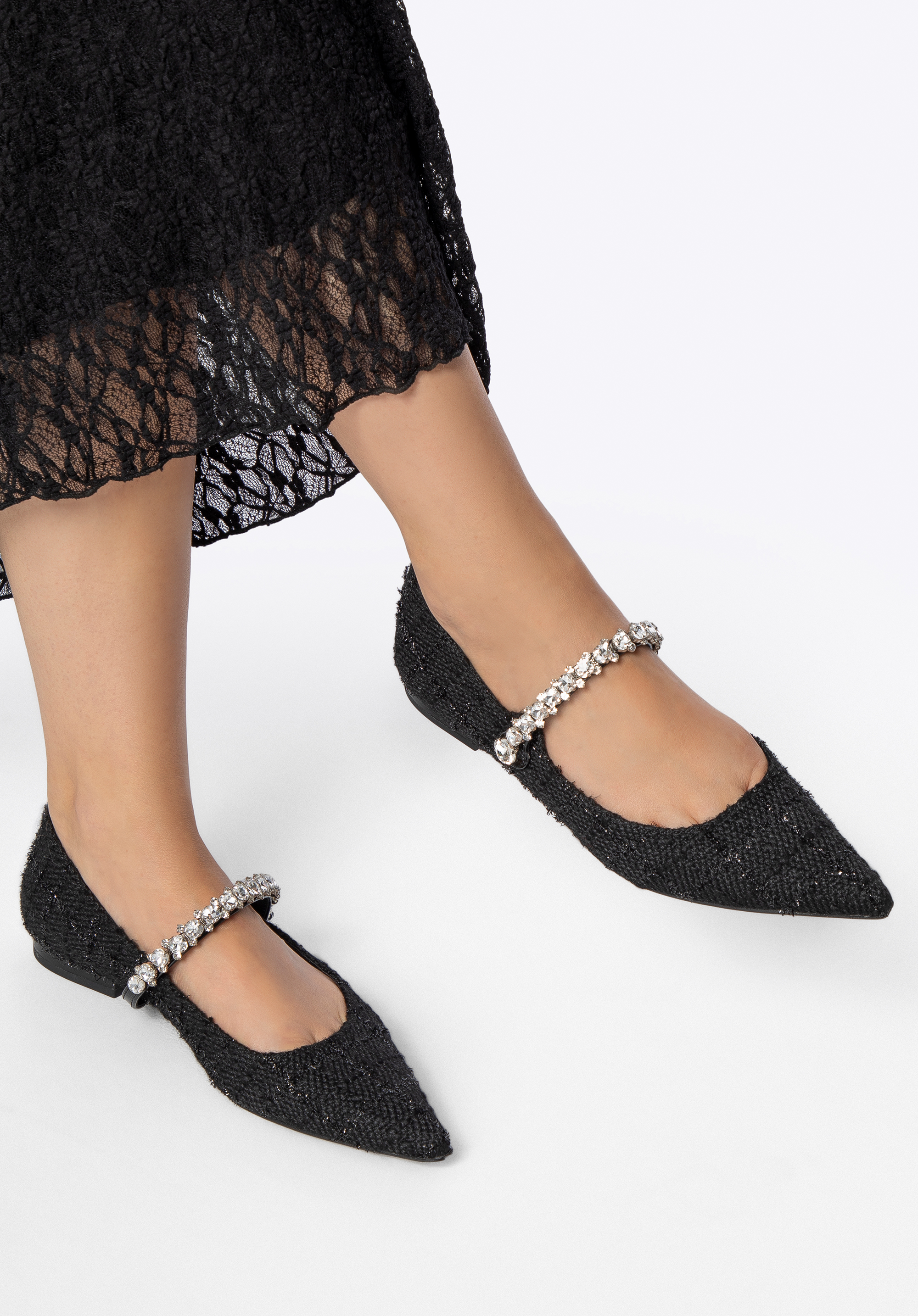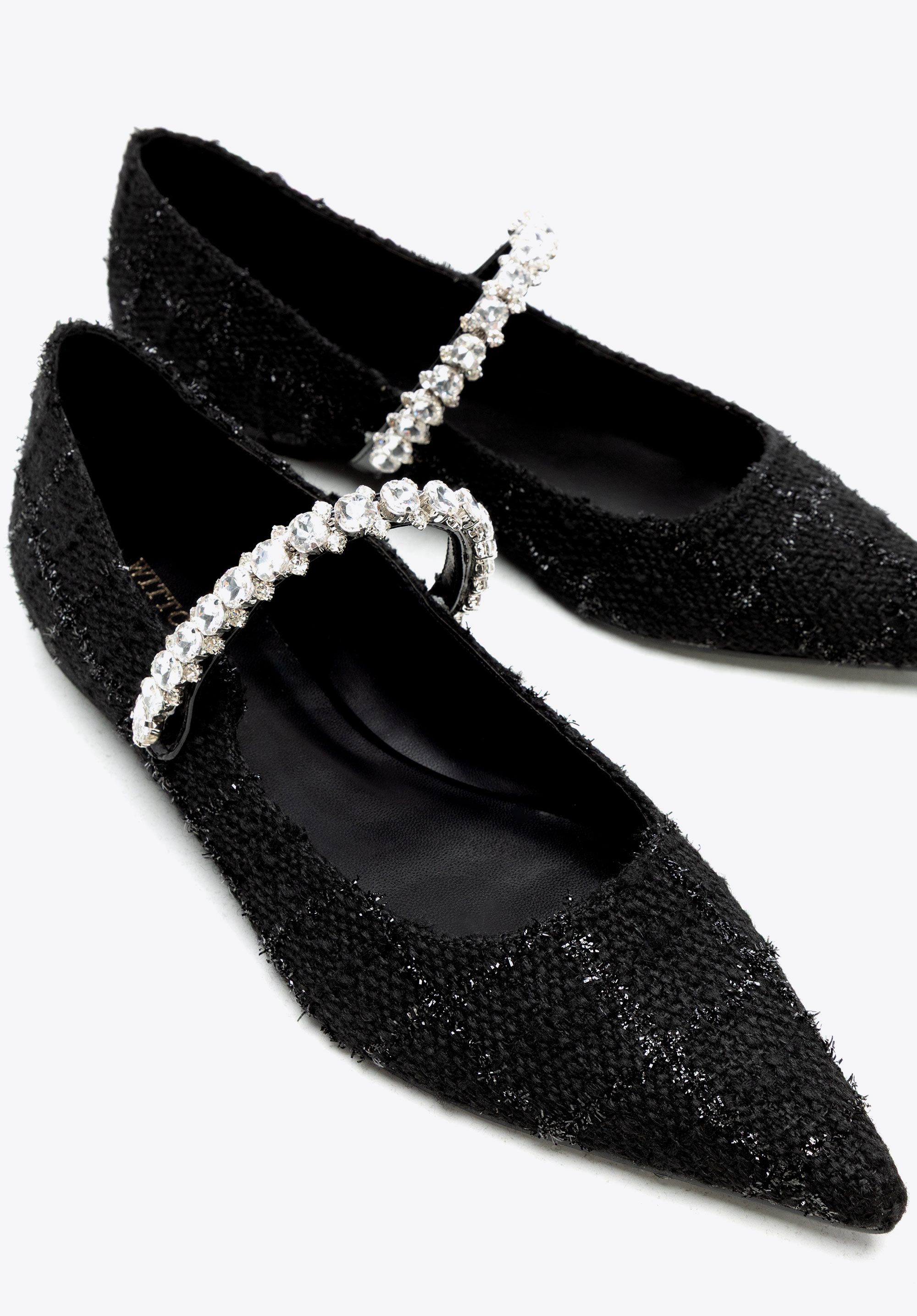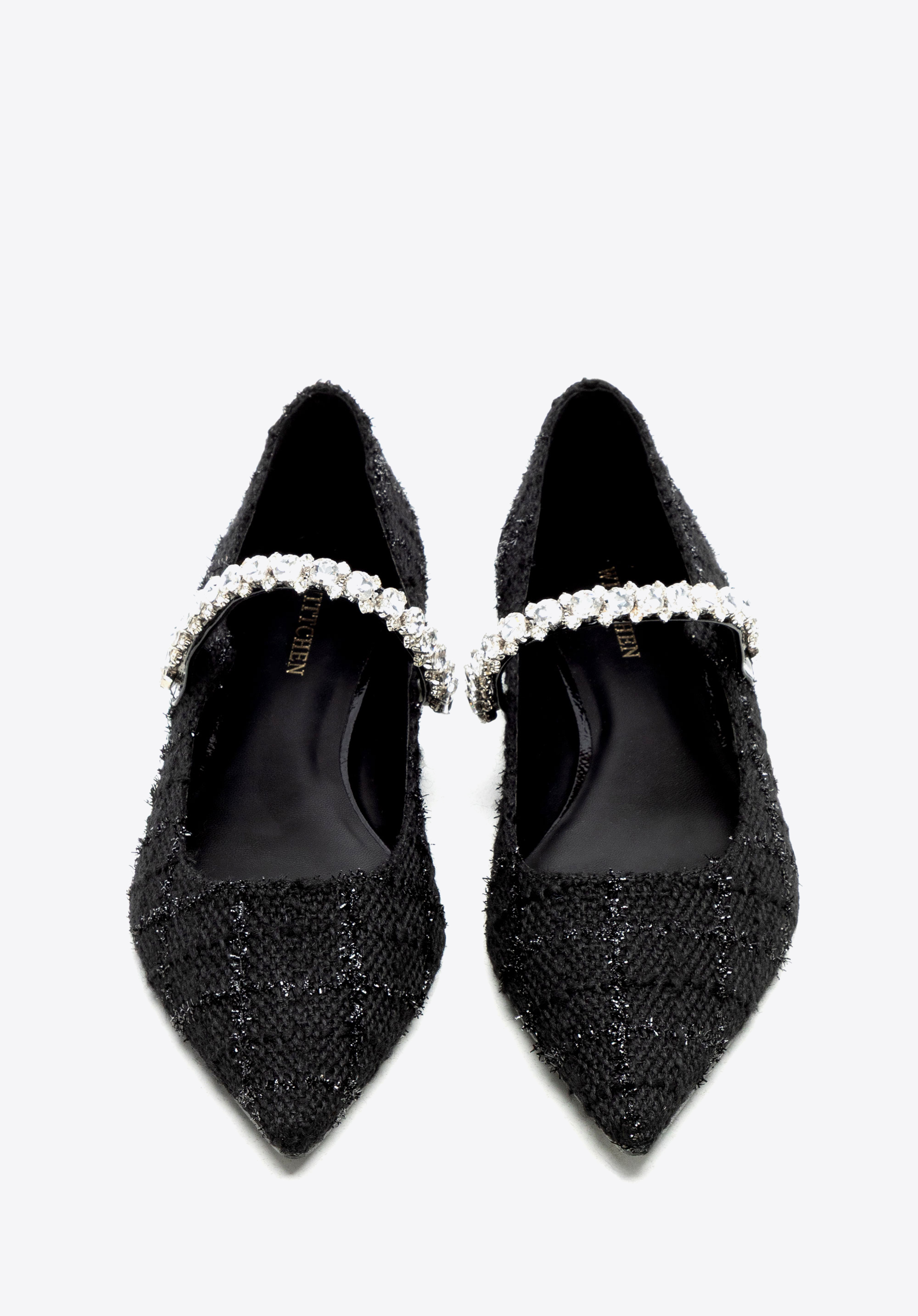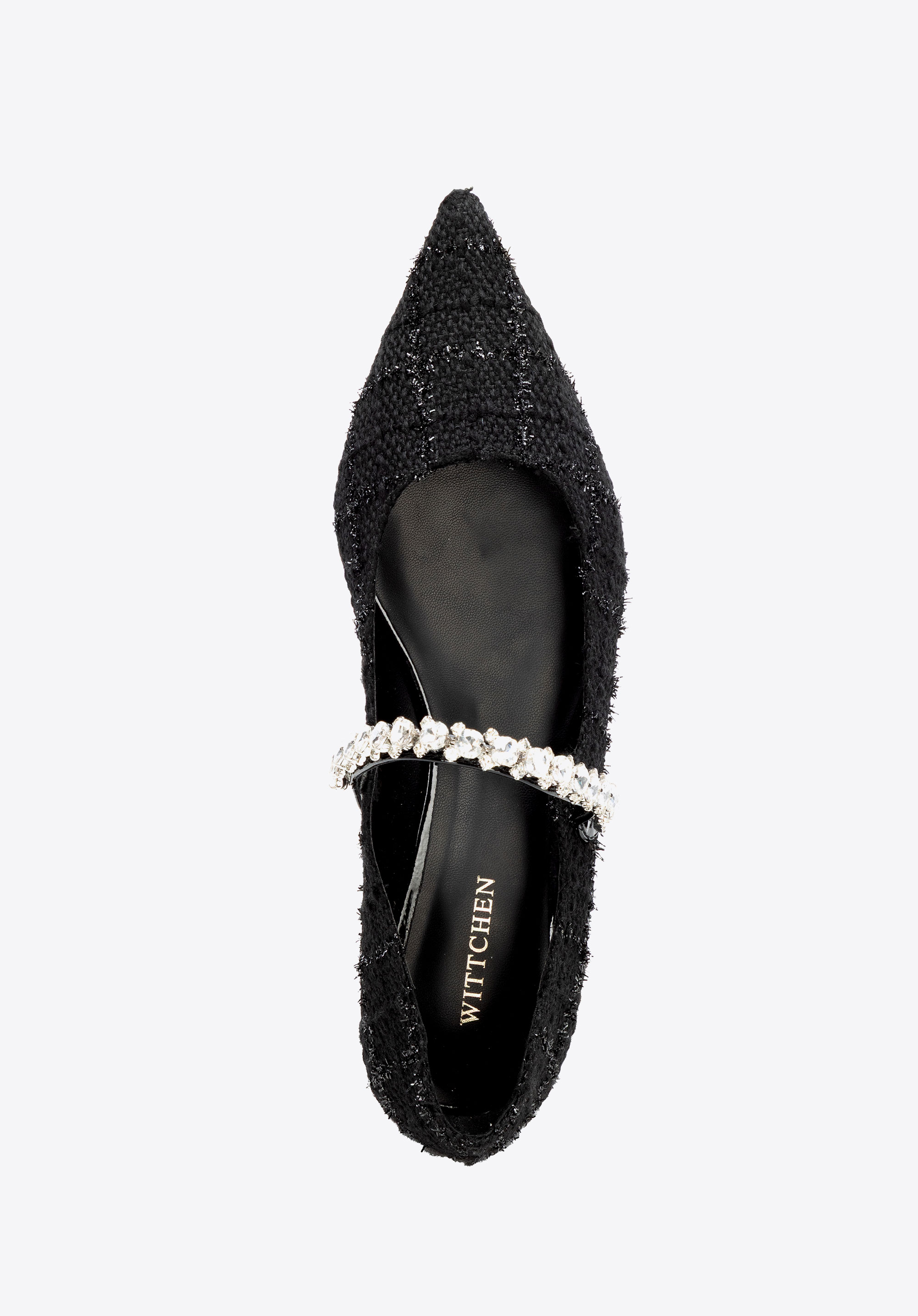 Ezek a balerina cipők a klasszikus stílust a mindennapi kényelemmel ötvözik egy kifejezetten nőies dizájnban. A finomított tweed textúra időtlen eleganciát kölcsönöz nekik, így tökéletesek mind az irodába, mind a városi kiruccanásokra. A kifinomult hegyes orrnak köszönhetően, amely karcsúsítja és vizuálisan meghosszabbítja a lábat. A csillogó strasszokkal díszített pántnak köszönhetően ezek a cipők a finom ékszerek báját ötvözik a mindennapi praktikummal.