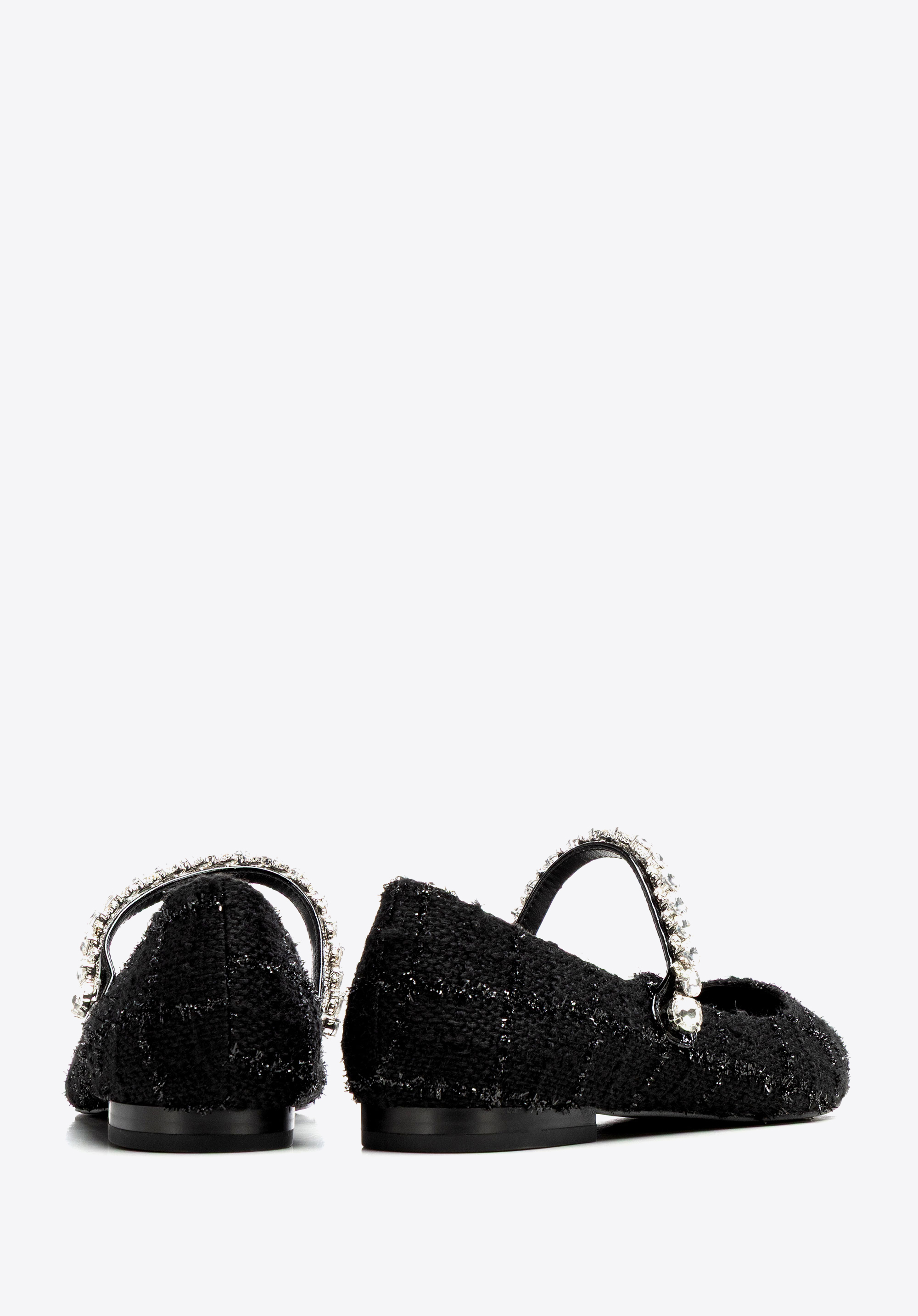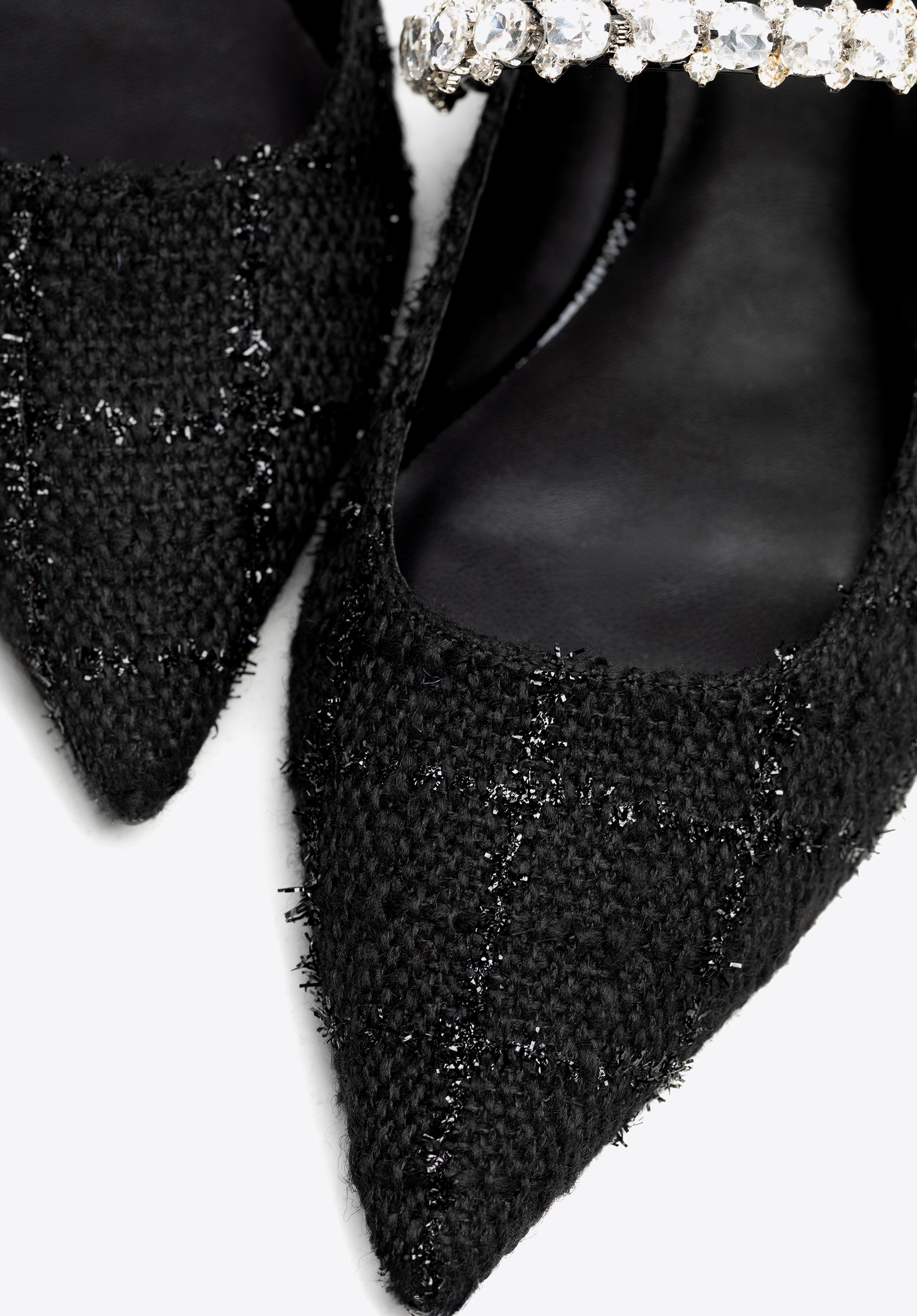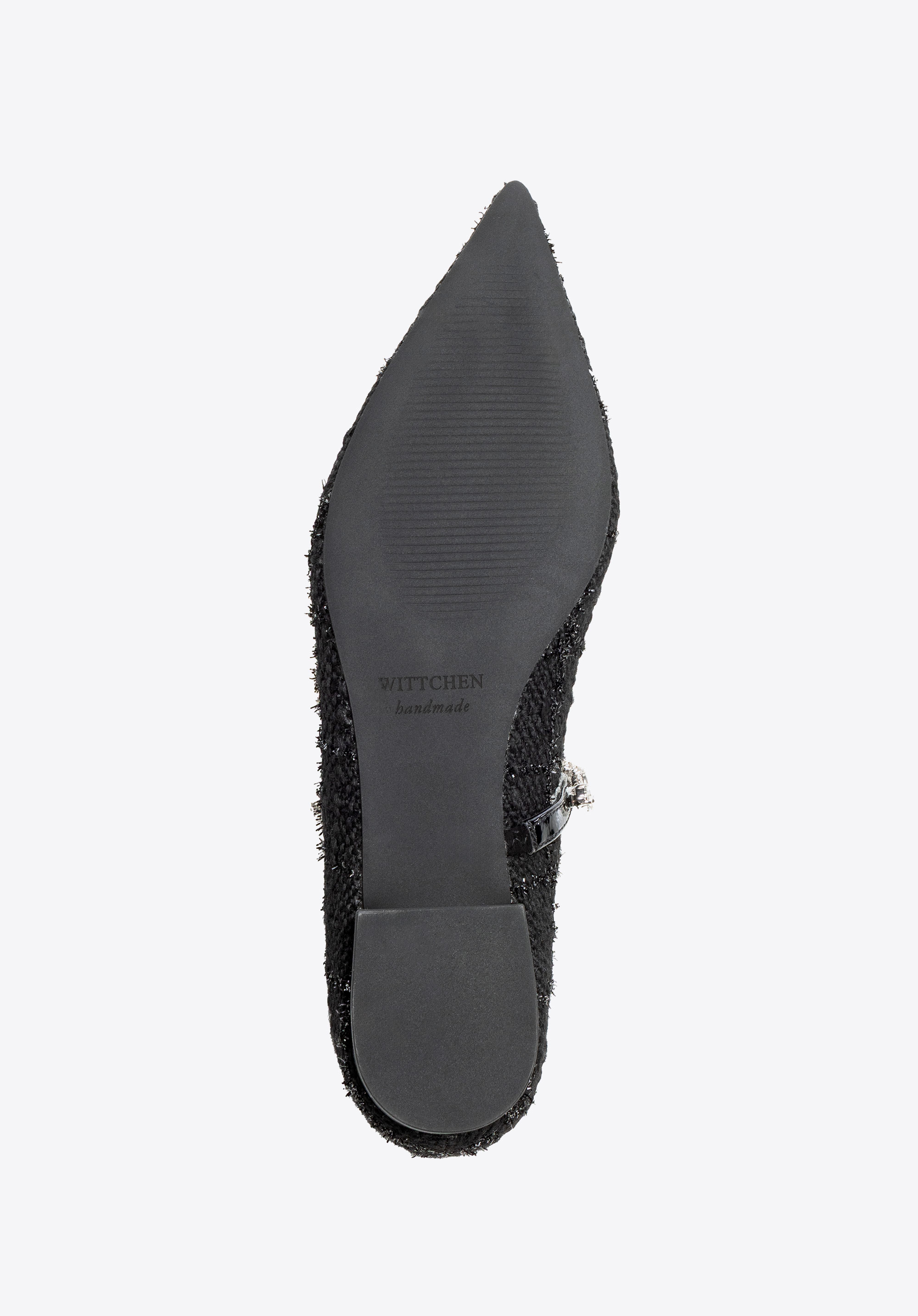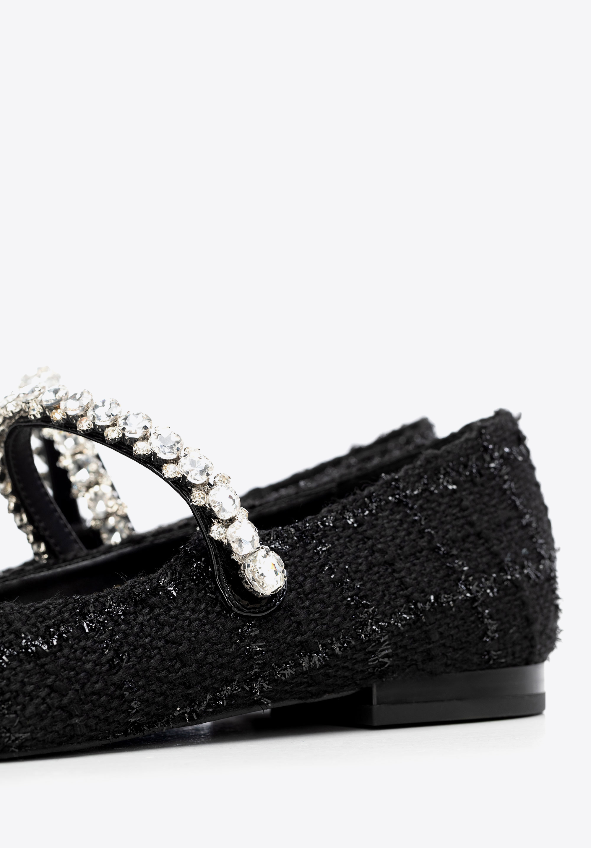 Ezek a balerina cipők a klasszikus stílust a mindennapi kényelemmel ötvözik egy kifejezetten nőies dizájnban. A finomított tweed textúra időtlen eleganciát kölcsönöz nekik, így tökéletesek mind az irodába, mind a városi kiruccanásokra. A kifinomult hegyes orrnak köszönhetően, amely karcsúsítja és vizuálisan meghosszabbítja a lábat. A csillogó strasszokkal díszített pántnak köszönhetően ezek a cipők a finom ékszerek báját ötvözik a mindennapi praktikummal.