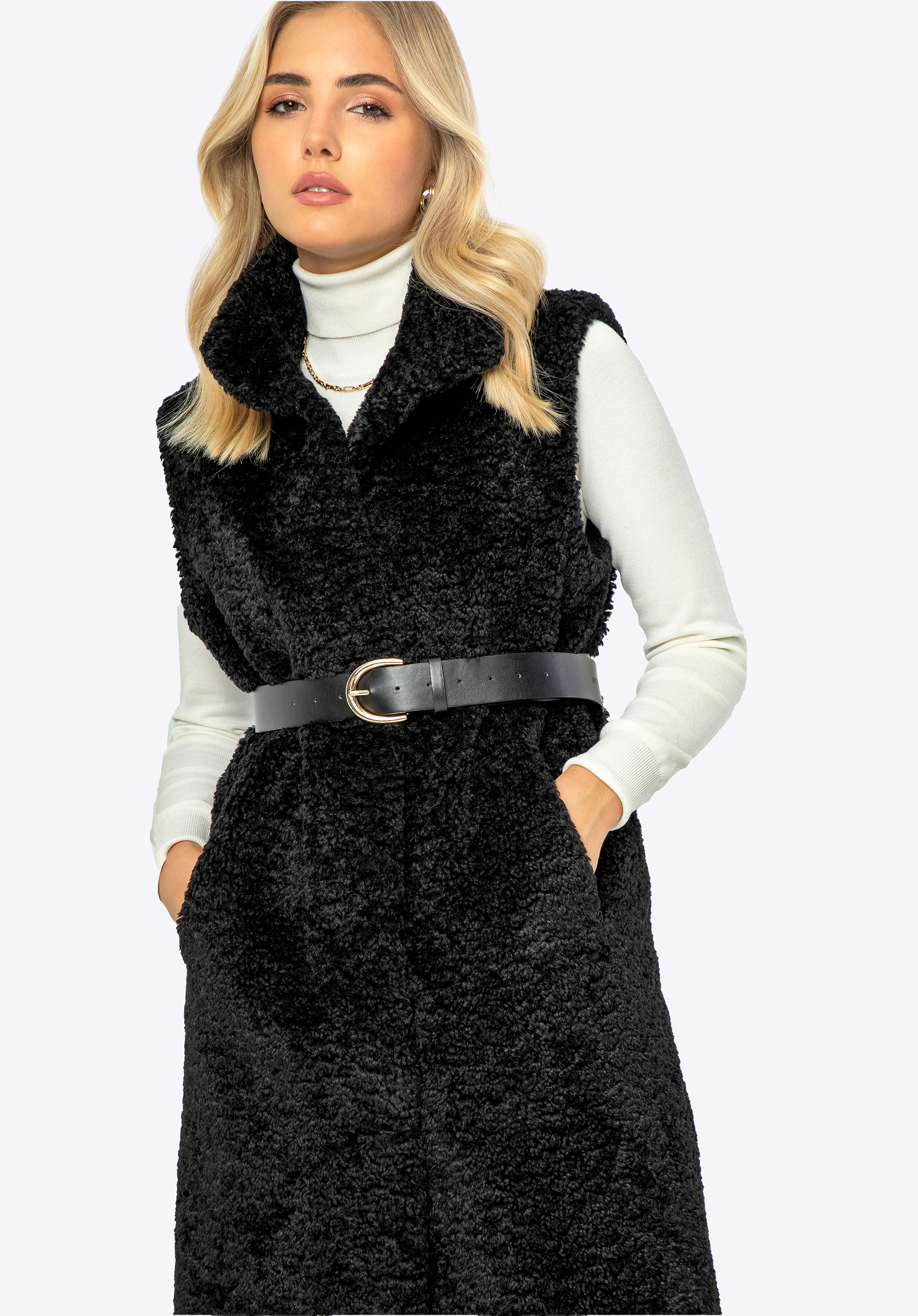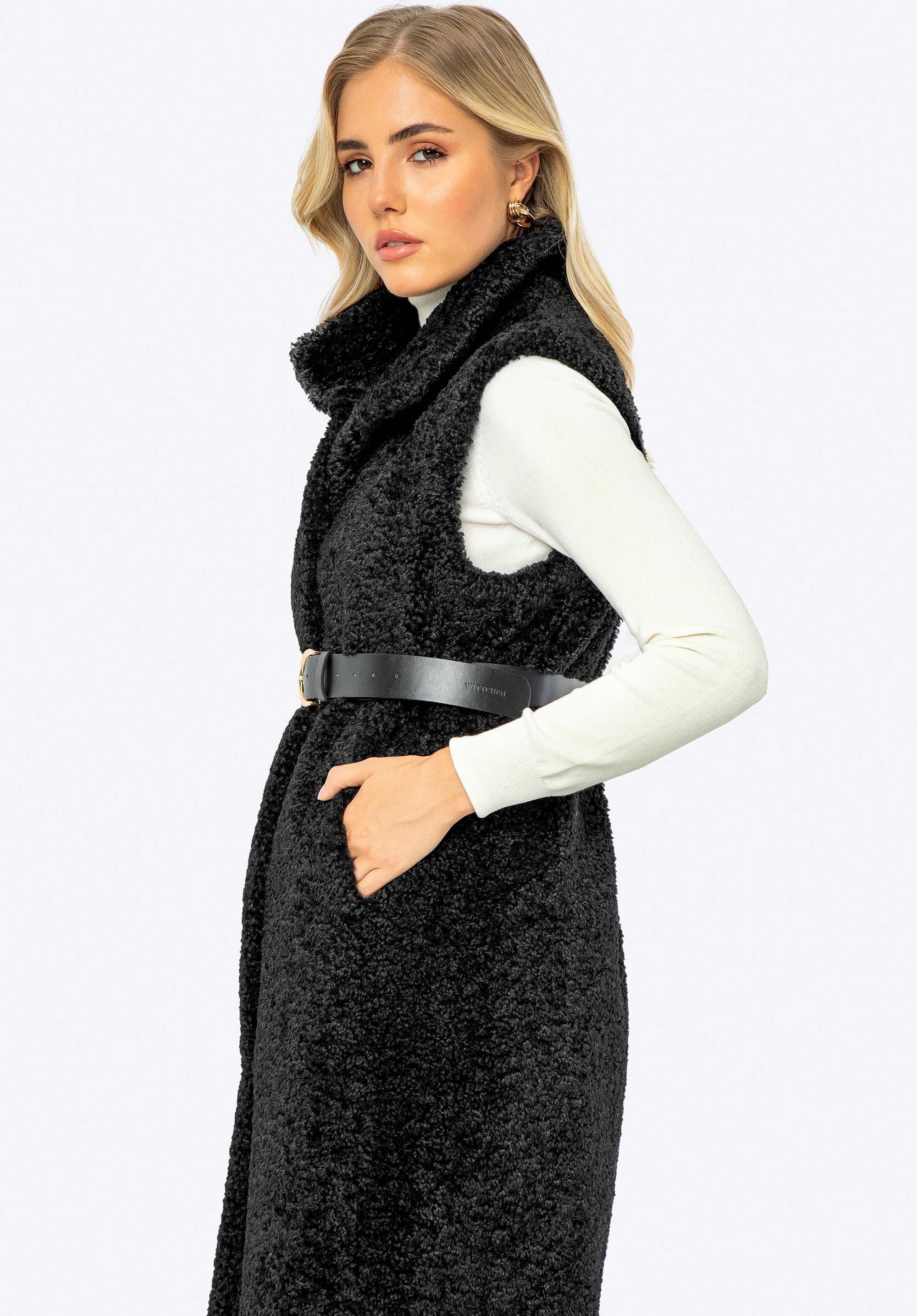 Fedezd fel a divatot, amely ötvözi az eleganciát a kényelemmel. Ez a hosszú női mellénykötelező darab lesz a ruhatáradban. Puha, kellemes anyagból készült, nem csak luxus megjelenést, hanem kivételes viselési kényelmet is biztosít. Az oldalzsebek praktikus kiegészítők, amelyek tökéletesek a hűvösebb napokon a kezek behúzásához, míg a passzoló tépőzáras és szemes zárás finoman kiemeli a darab elegáns karakterét. A hosszú kialakítás megnyújtja a sziluettet, a lehajtható gallér pedig védelmet nyújt a szél és a hideg ellen. Mindezt kihangsúlyozza egy divatos műbőr öv , amely harmóniát kölcsönöz öltözékednek.