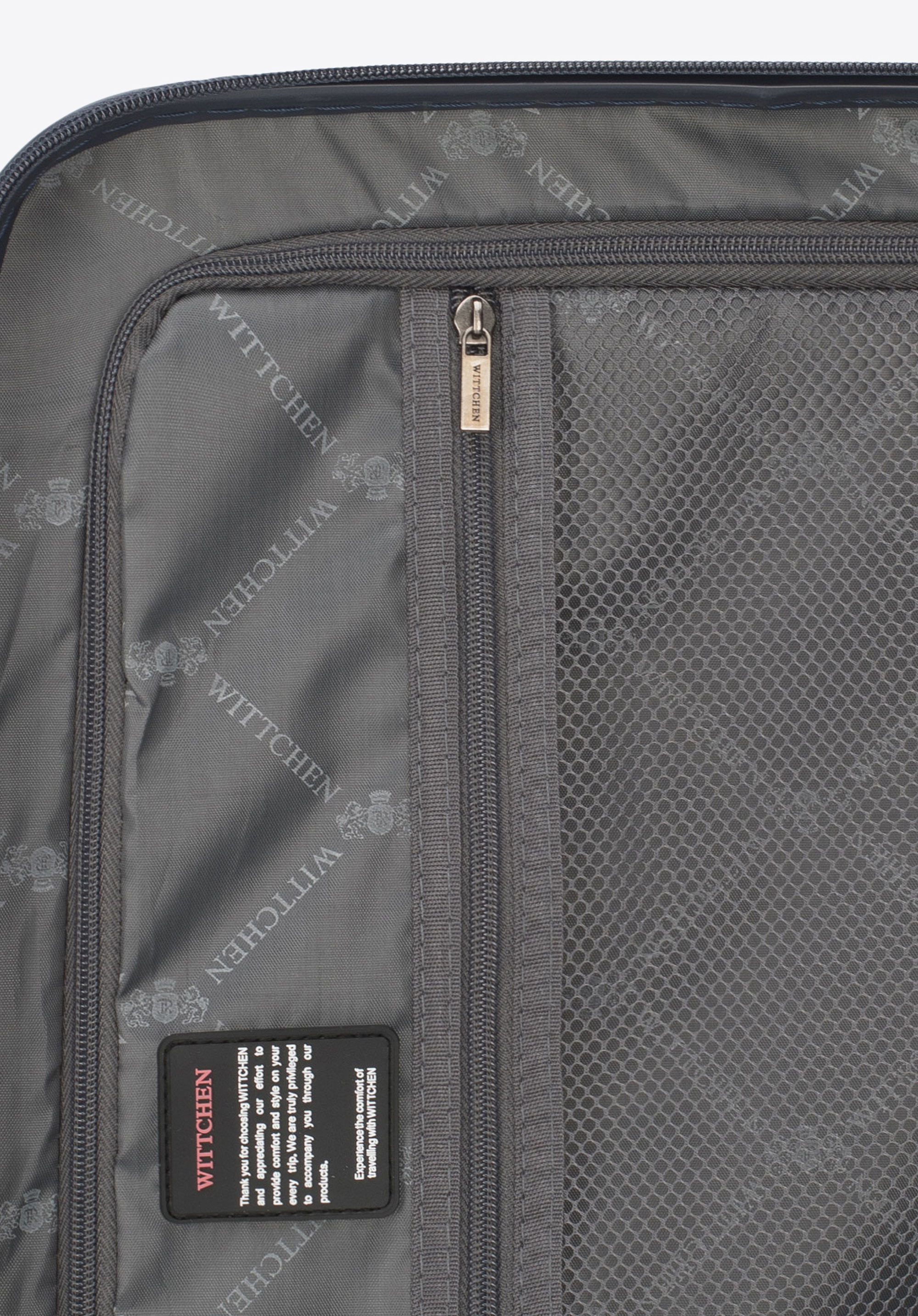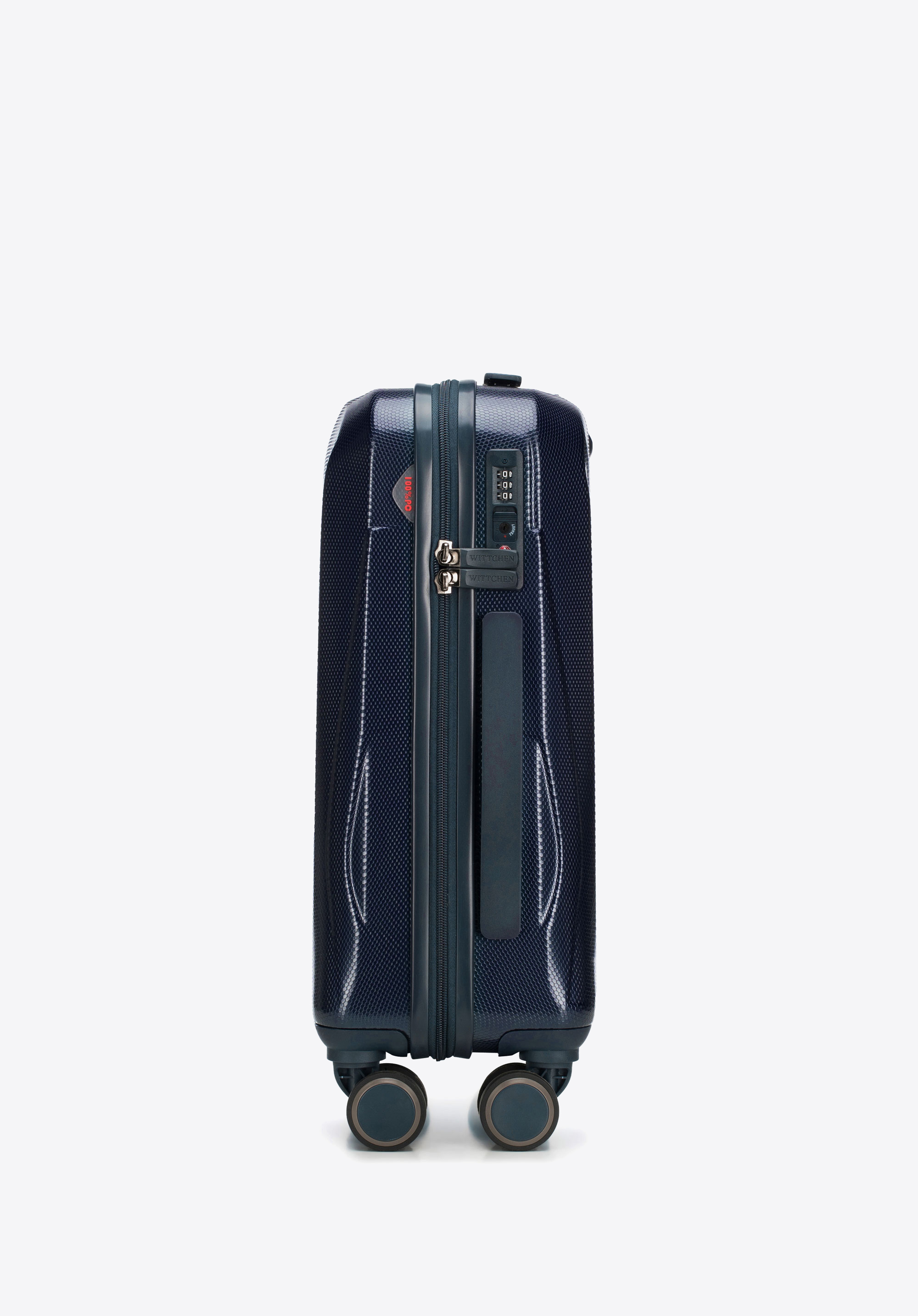 teleszkópos fogantyú zárral. A monokróm modell fogantyúi és kerekei ugyanabban az árnyalatban vannak, mint a felülete. Öt színben kapható: kék, zöld, bordó, sötétkék és fekete.