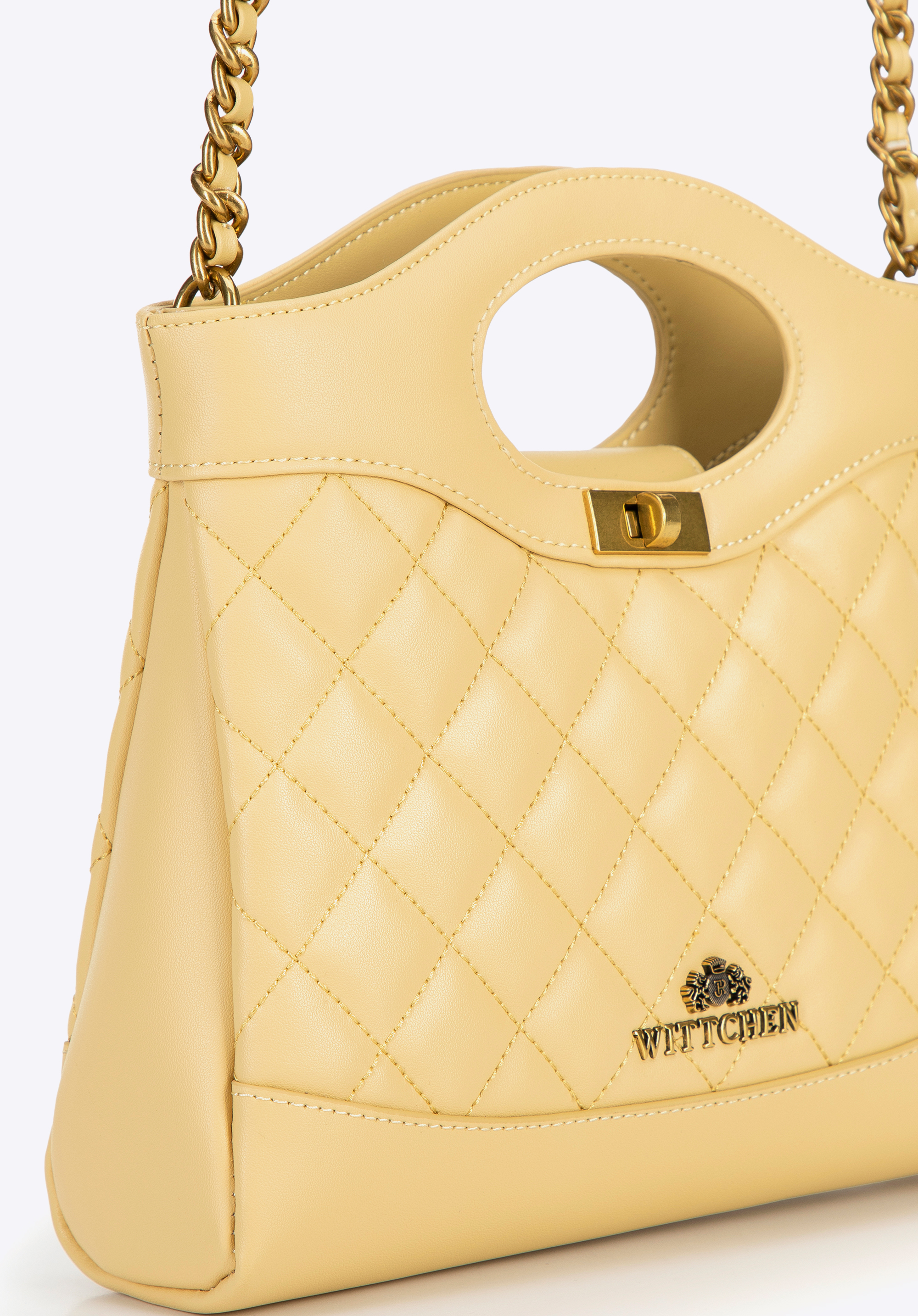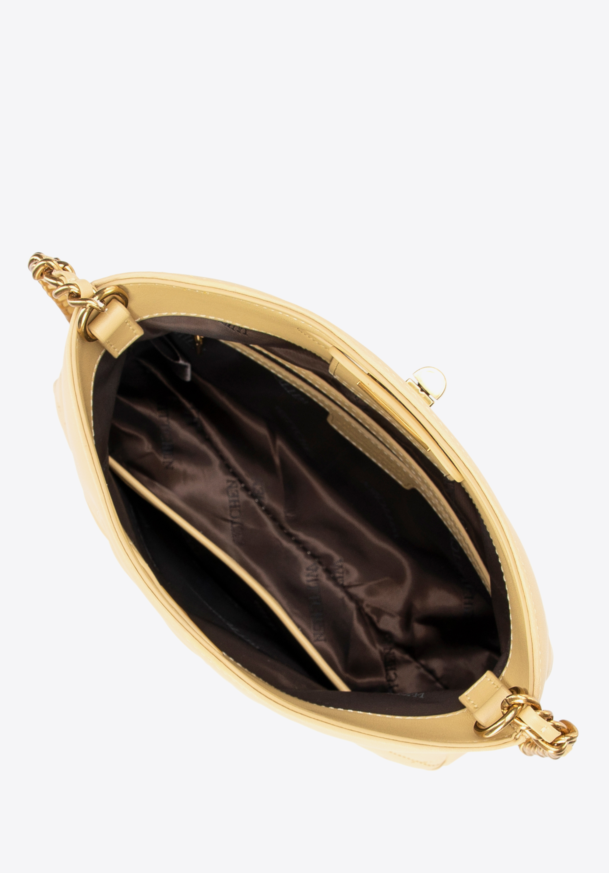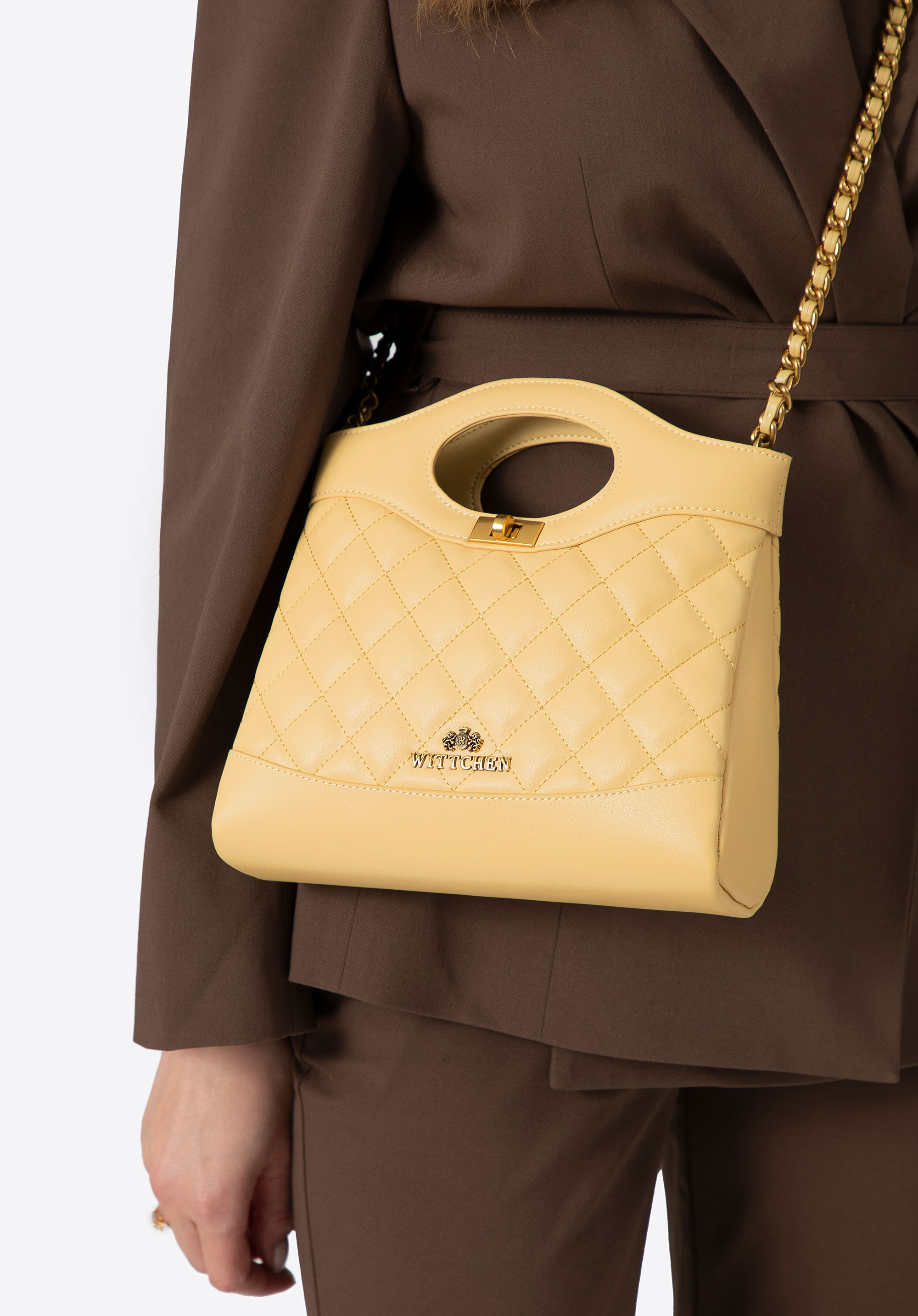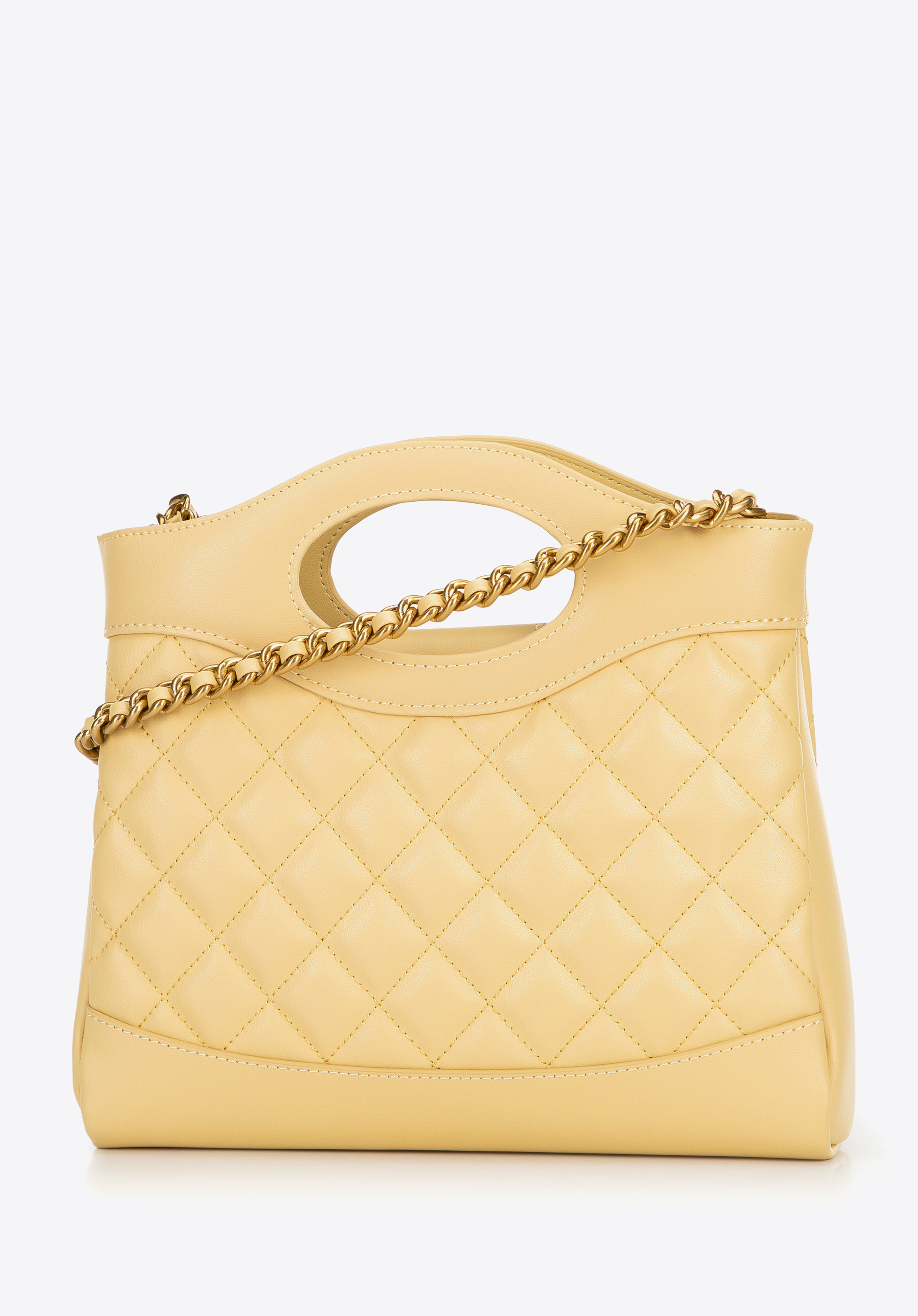 Egészítsd ki ruhatáradat egy olyan kézitáskával, amely időtlen dizájnjával és egyedi karakterével nyűgöz le. Ez a táska a klasszikus és a modern hangsúlyok kombinációja. Természetes bőrből készült, elöl és hátul geometrikus steppeléssel rendelkezik az igényes megjelenés érdekében. A merev szabás lehetővé teszi, hogy a töltéstől függetlenül megőrizze tökéletes formáját, míg a stílusos csat elegáns befejező elemet ad. A hosszú lánc és a két fogantyú lehetővé teszi, hogy a táska akár kézben, akár vállon hordható legyen, alkalomhoz és stílushoz illően.