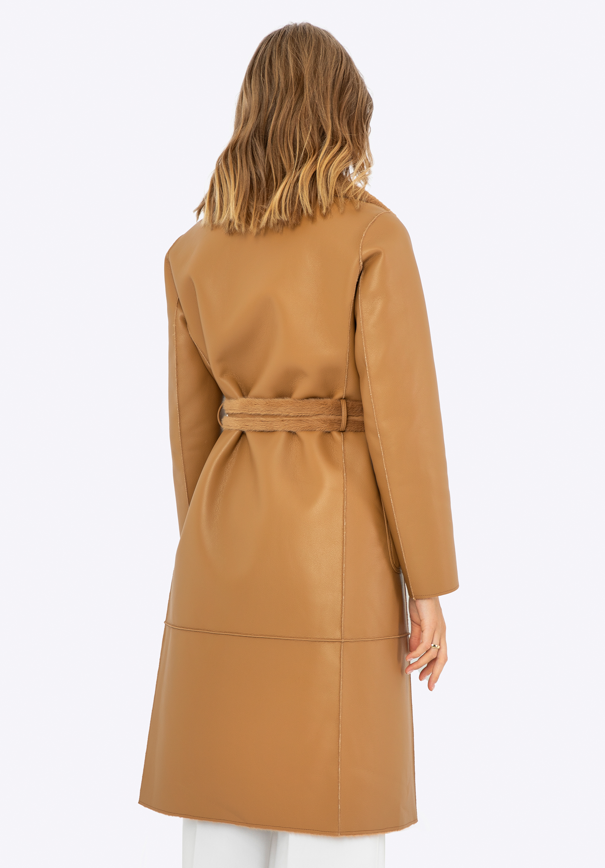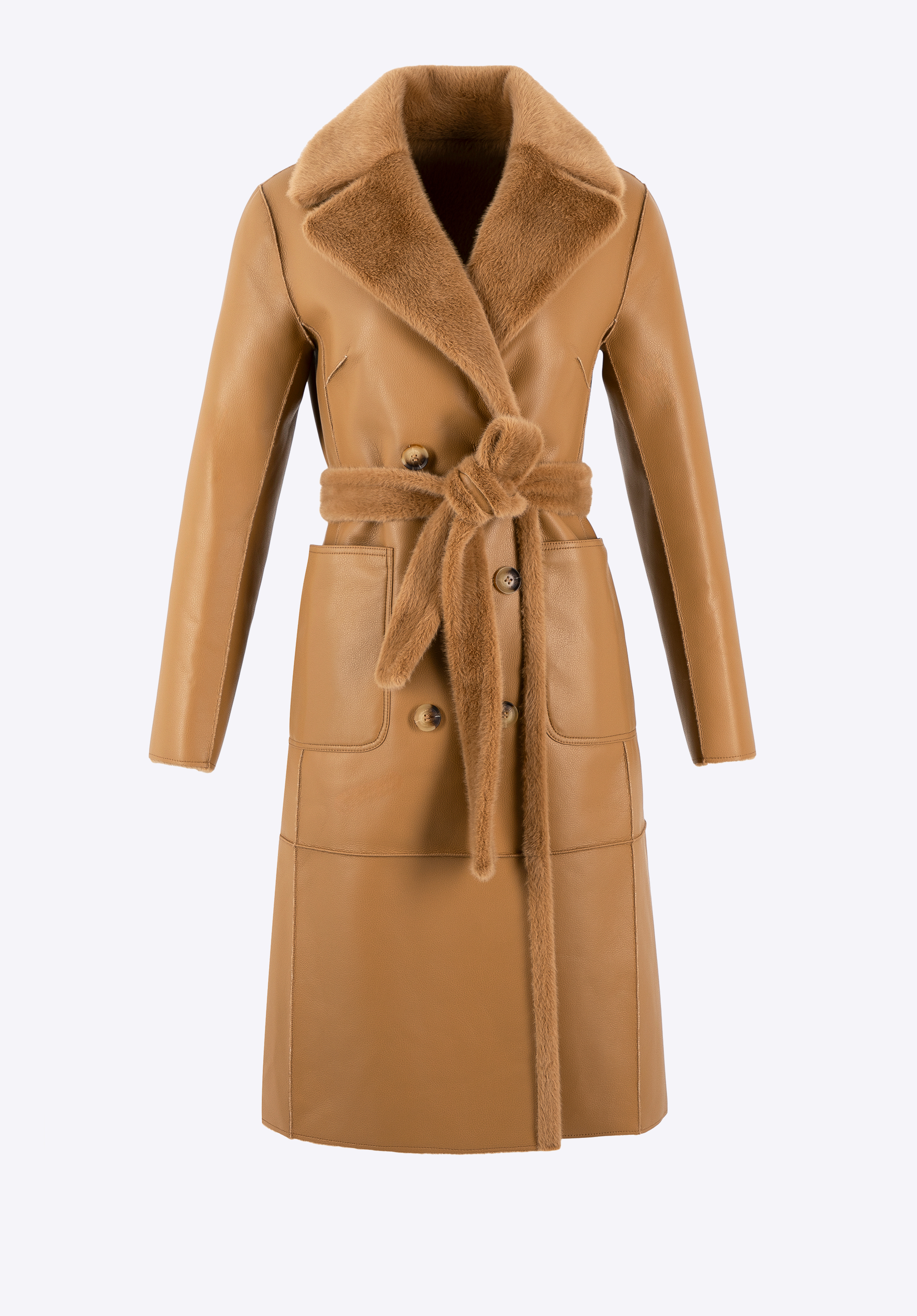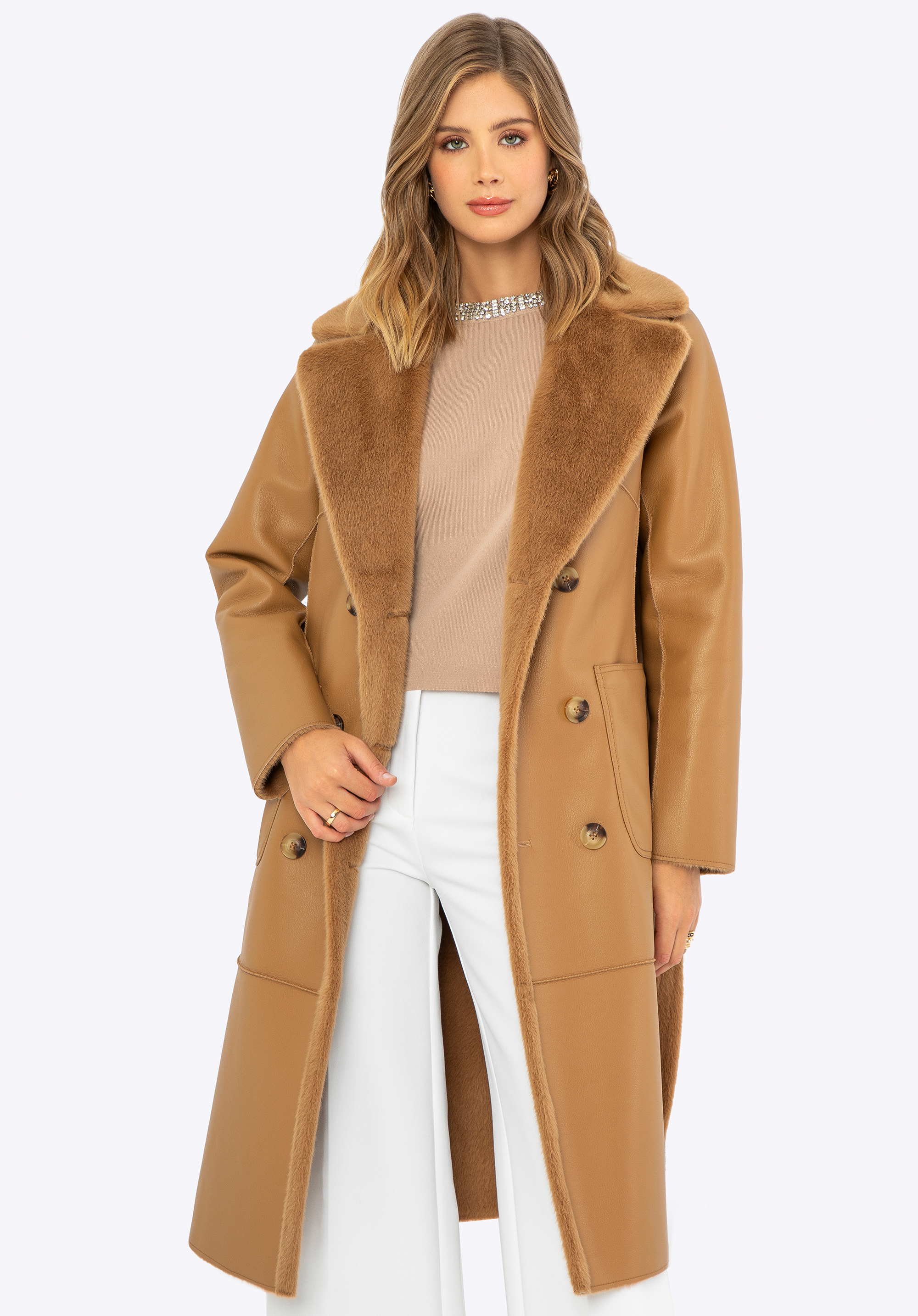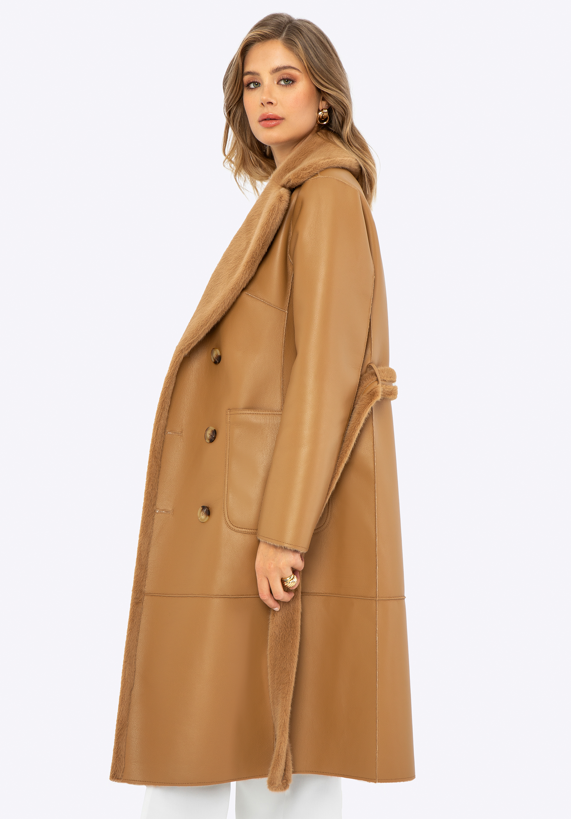 Ha értékeled az egyedi ruhákat, nálunk találsz valami tökéleteset! Ez a szemet gyönyörködtető női kabát a stílusrajongók kedvence, sokoldalú megjelenést kínál bármilyen alkalomra. Ez a kifordítható dizájn két stílust kínál egyben: luxus műszőrme az egyik oldalon és elegáns műbőr a másik oldalon. A hosszú vonalú kialakítás kiváló védelmet nyújt a hideg ellen, míg a kétsoros gombolás kifinomult eleganciát ad. A kabát praktikus poliészterből készült függőleges belső zsebekkel és műbőr külső zsebekkel rendelkezik, amelyek tökéletesek az apró tárgyak tárolására. A derekát műszőrme öv emeli ki, a lehajtható gallér pedig további kényelmet és meleget garantál. Ez a kifordítható kabát ideális választás a téli napokra!