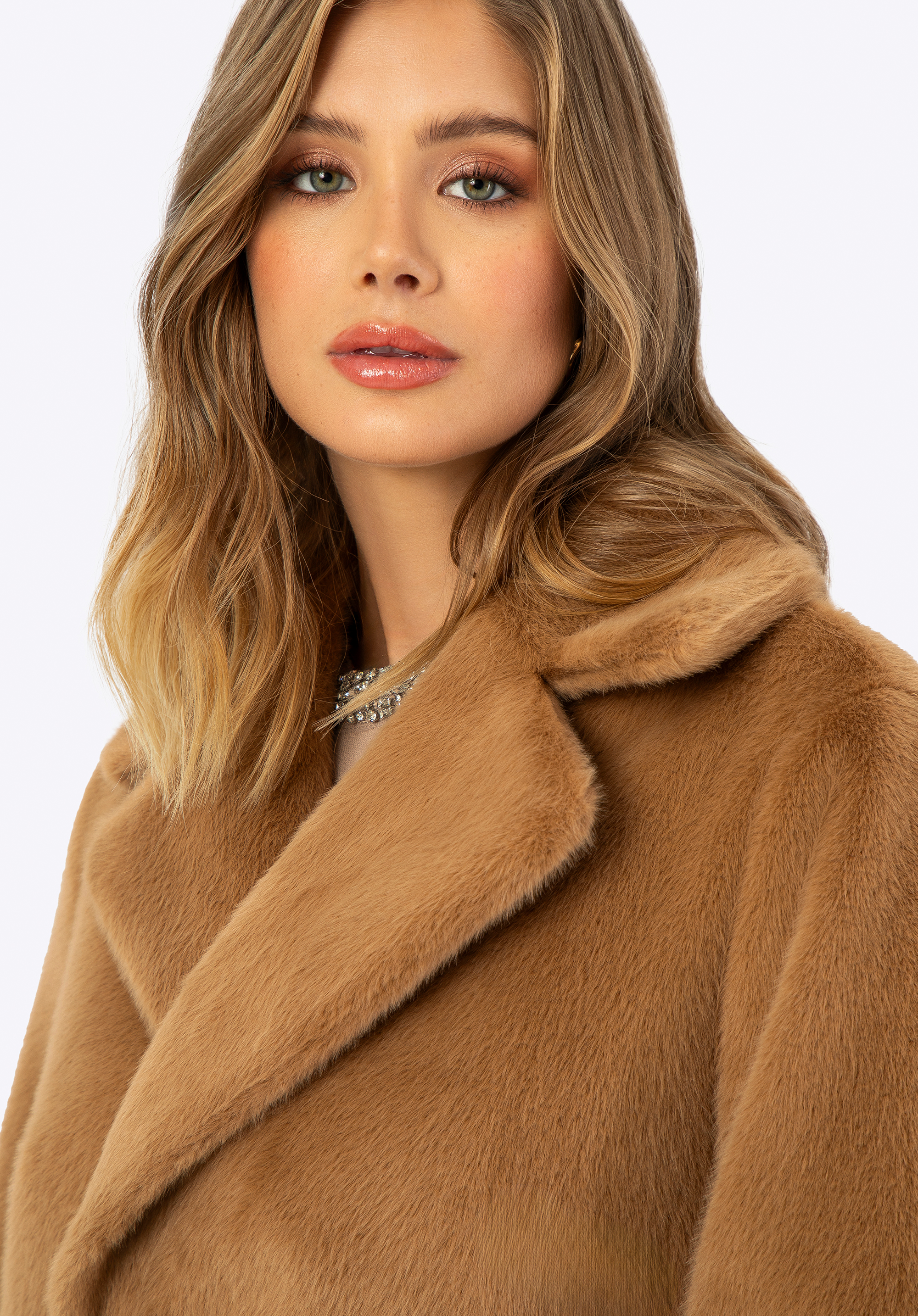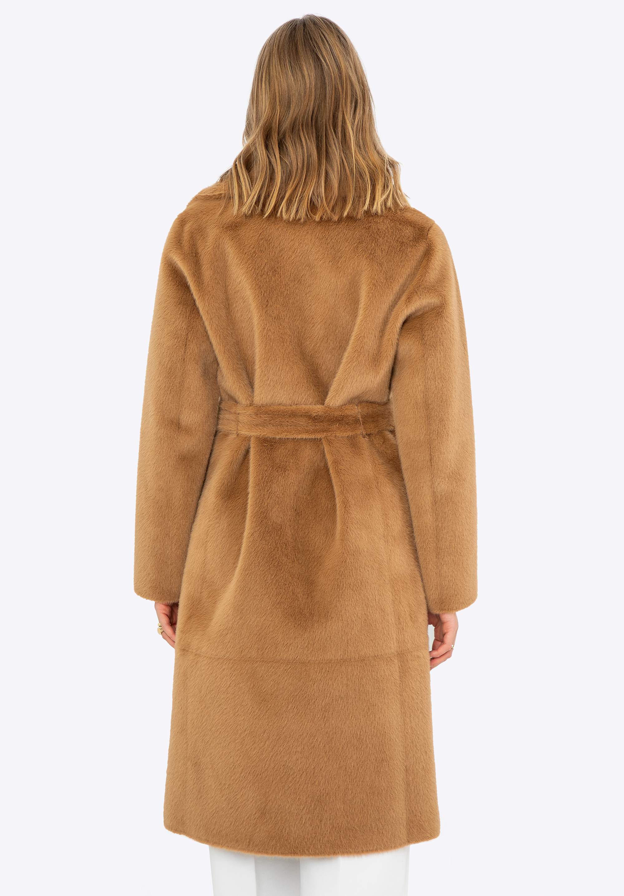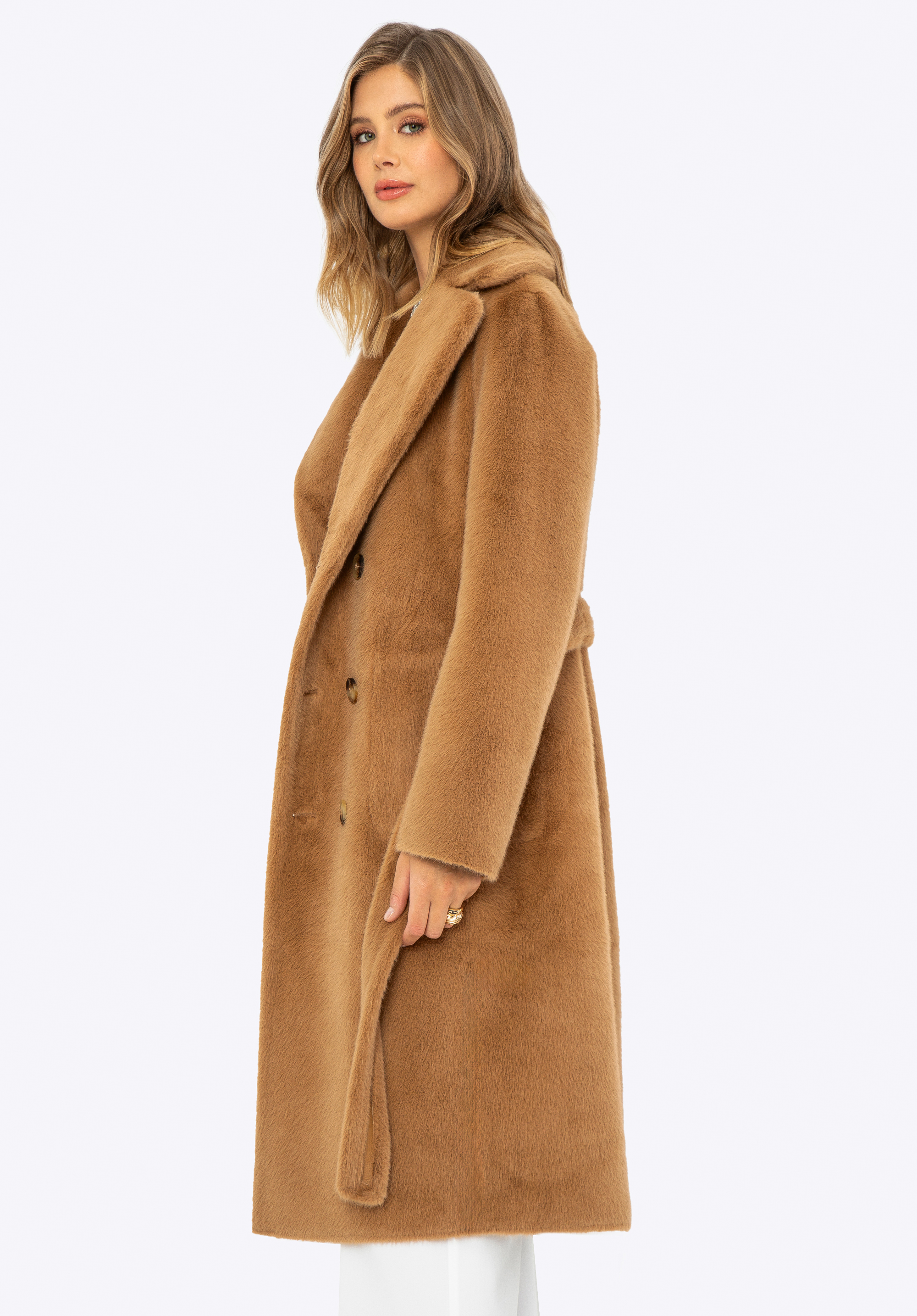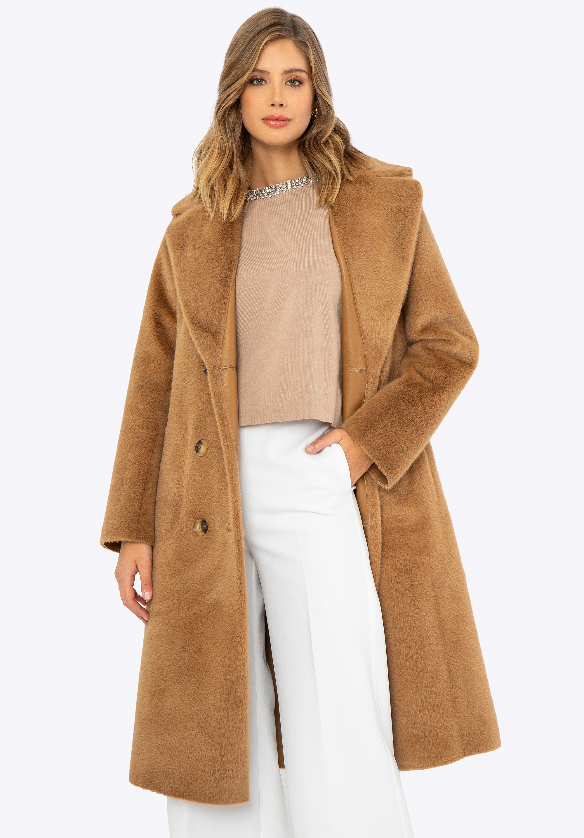 Ha értékeled az egyedi ruhákat, nálunk találsz valami tökéleteset! Ez a szemet gyönyörködtető női kabát a stílusrajongók kedvence, sokoldalú megjelenést kínál bármilyen alkalomra. Ez a kifordítható dizájn két stílust kínál egyben: luxus műszőrme az egyik oldalon és elegáns műbőr a másik oldalon. A hosszú vonalú kialakítás kiváló védelmet nyújt a hideg ellen, míg a kétsoros gombolás kifinomult eleganciát ad. A kabát praktikus poliészterből készült függőleges belső zsebekkel és műbőr külső zsebekkel rendelkezik, amelyek tökéletesek az apró tárgyak tárolására. A derekát műszőrme öv emeli ki, a lehajtható gallér pedig további kényelmet és meleget garantál. Ez a kifordítható kabát ideális választás a téli napokra!