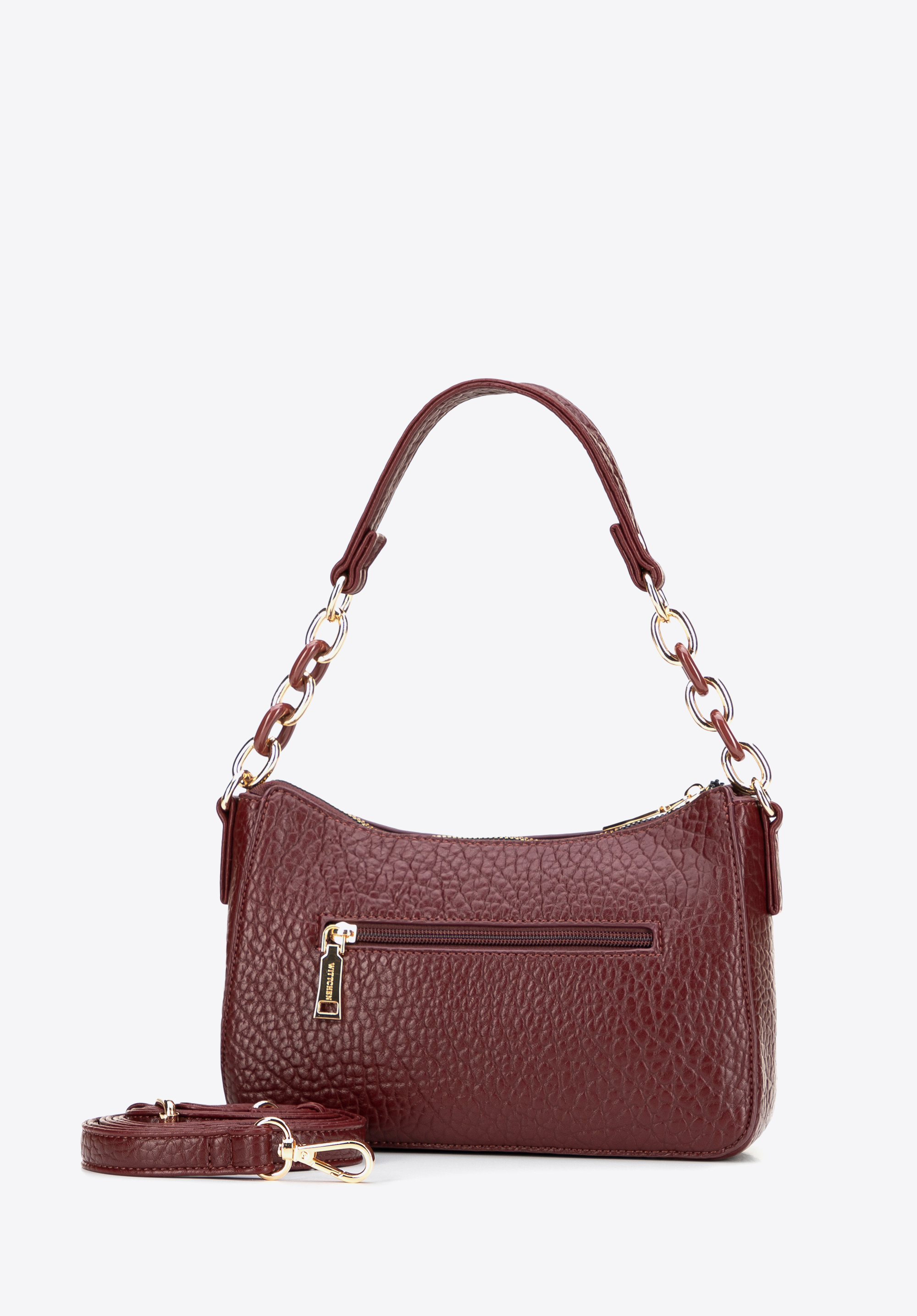 Dobd fel öltözékedet ezzel a divatos és kompakt táskával. A táska színében pompázó láncos fogantyú és a kontrasztos varrás modern megjelenést kölcsönöznek neki, míg a cipzáras fő- és a hátsó zseb gyors hozzáférést biztosítanak a szükséges holmijaidhoz. A visszafogott márkajelzés és a márkás cipzárak teszik teljessé az elegáns megjelenést, így ez a táska stílusos és praktikus kiegészítő bármilyen alkalomra.