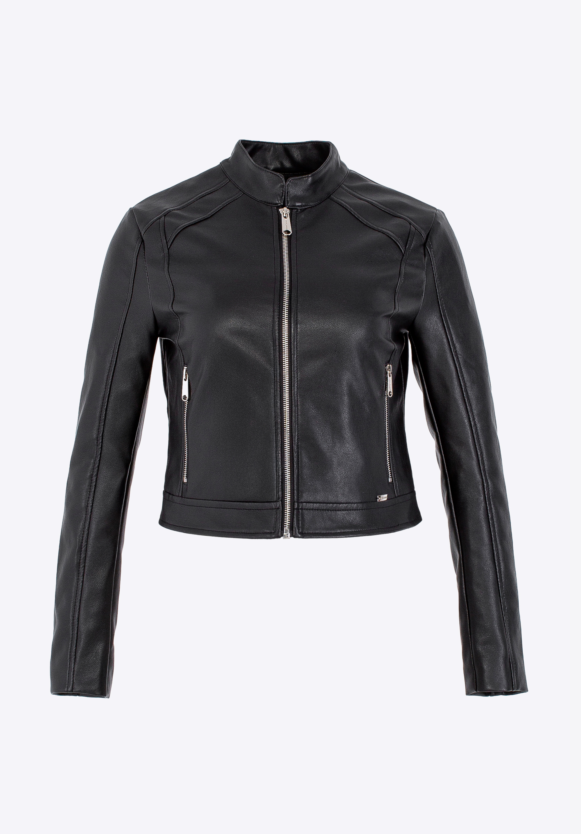 Ez a dzseki minden ruhatárban kötelező darab. Ökobőrből készült, és az eleganciát modern stílussal ötvözi. Minimalista szabása, finom varrásai és fém részletei - a gyártó logójával az oldalán és a cipzárakkal - szemet gyönyörködtető jelleget kölcsönöznek neki. A klasszikus állógallér és a cipzár kényelmes viseletet és tökéletes illeszkedést biztosít. A hosszú ujjak és a két praktikus cipzáras zseb teszi teljessé ennek az egyedi kabátnak a funkcionalitását.