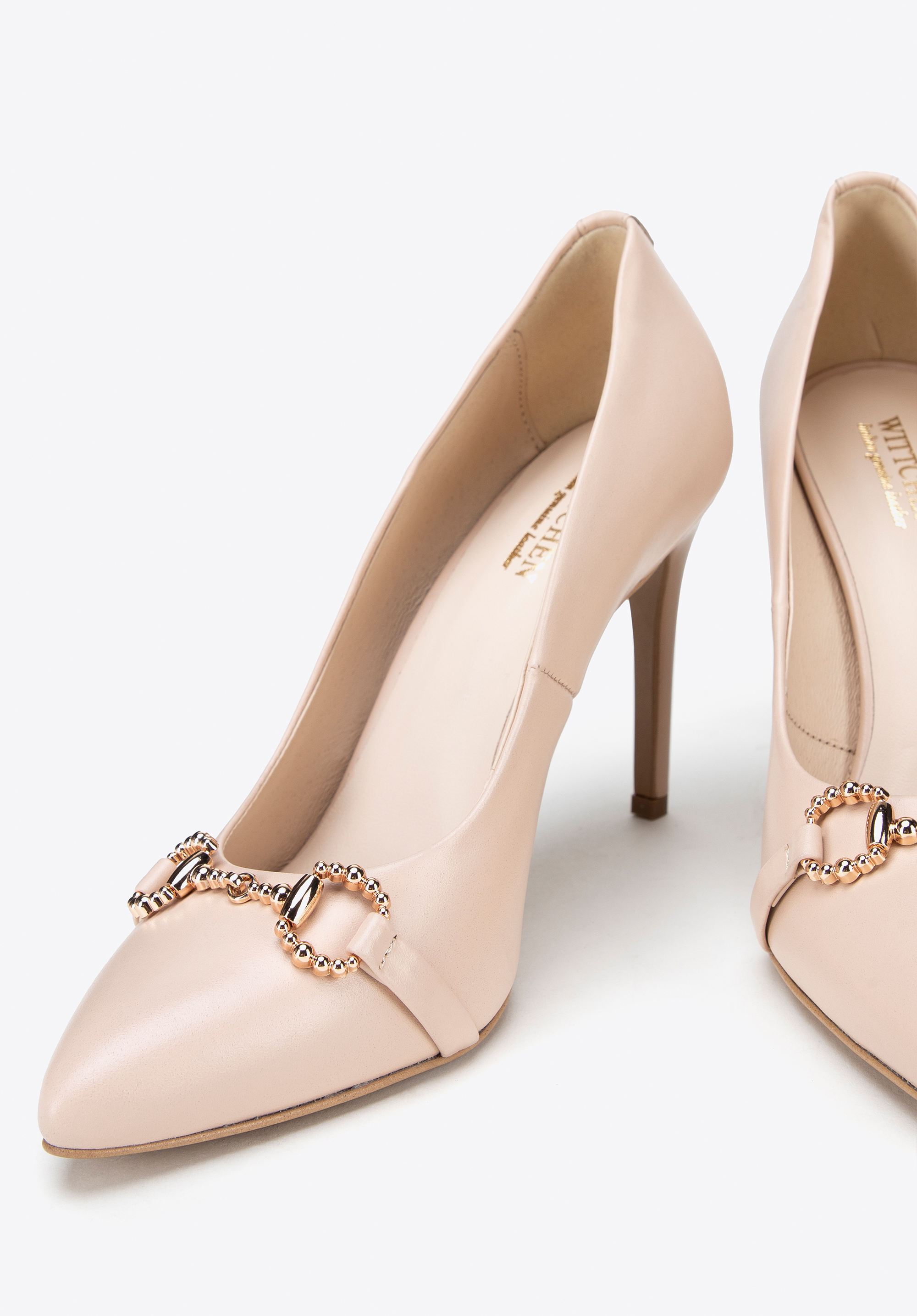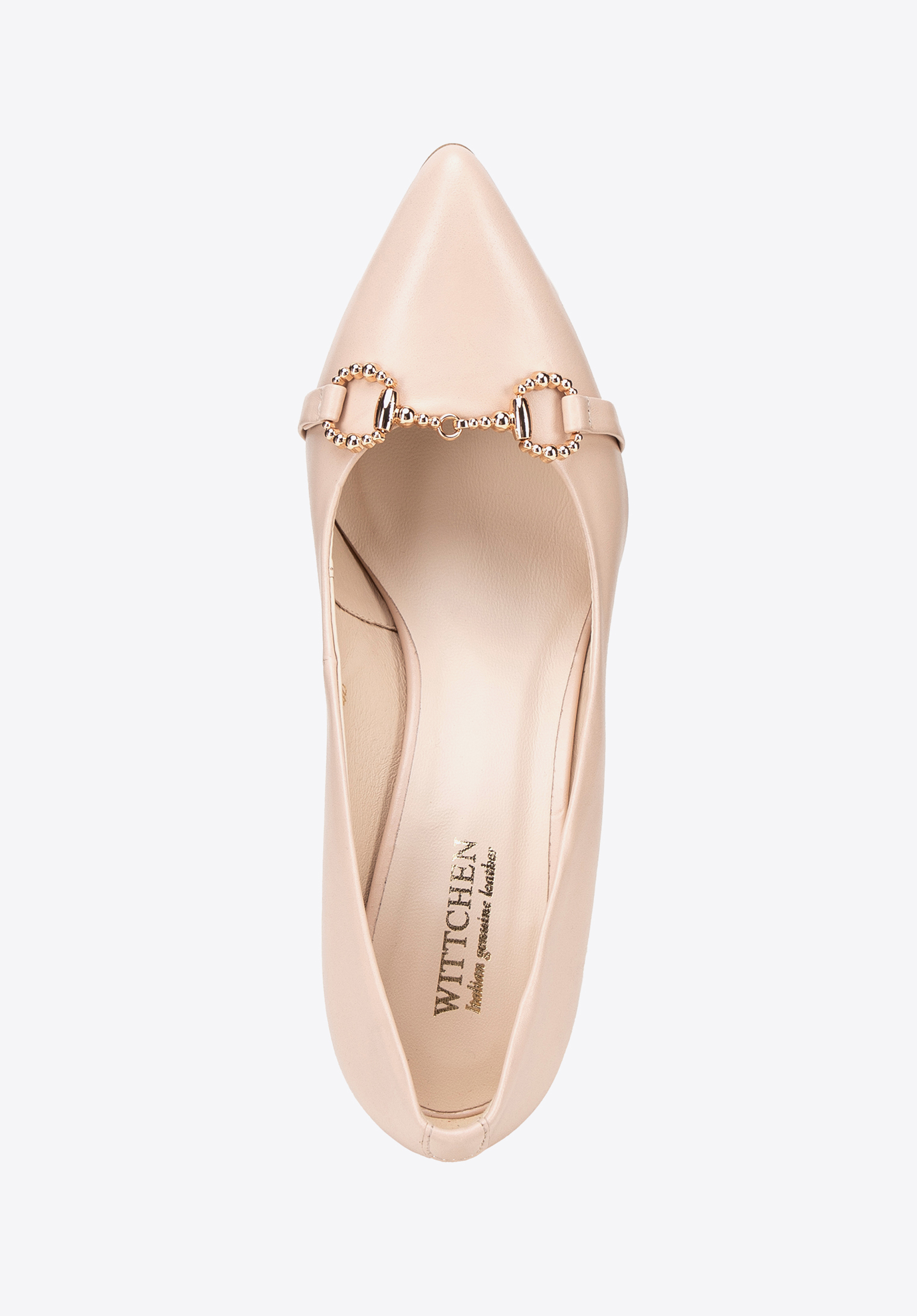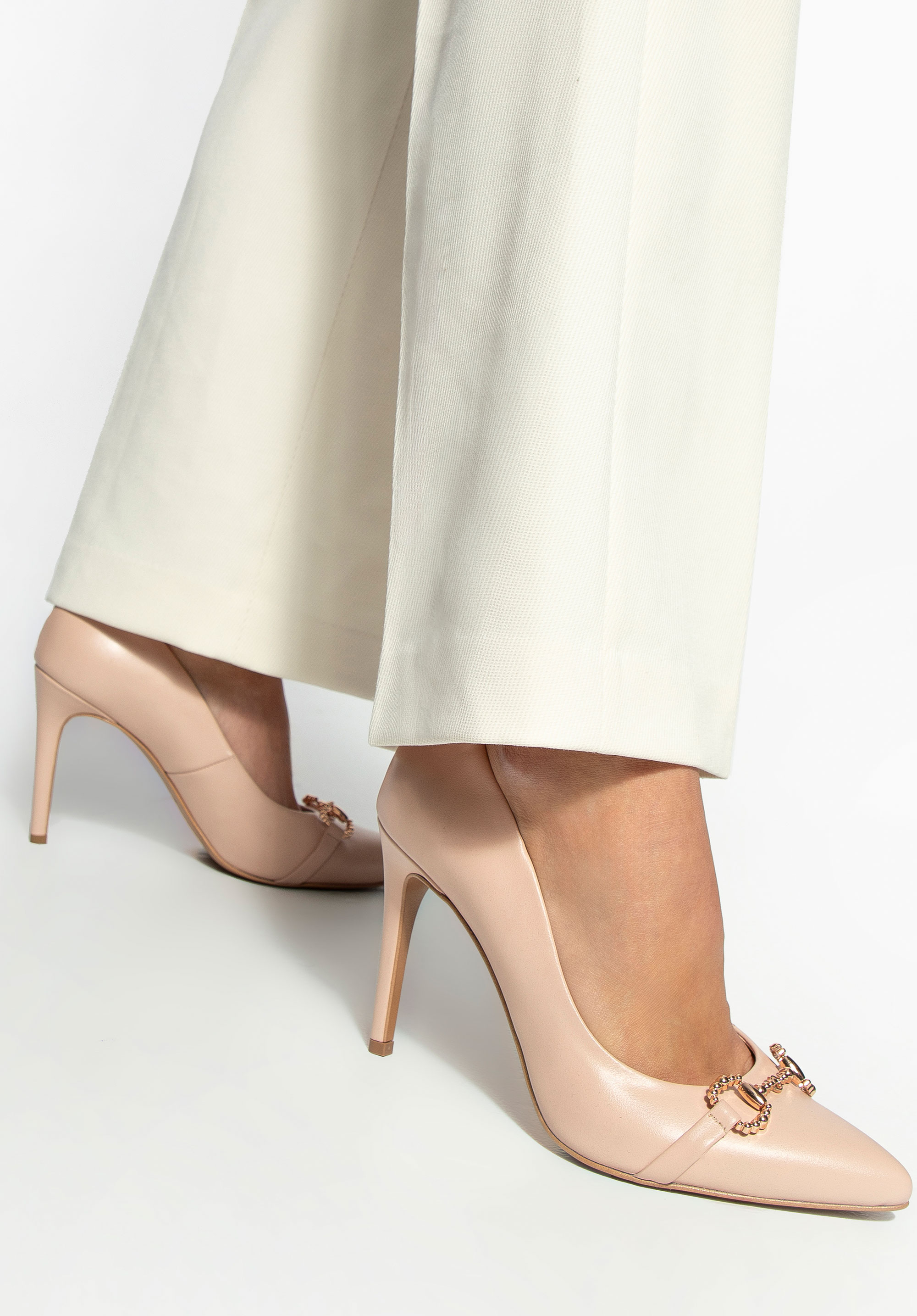 Fedezze fel a stílus és a kényelem tökéletes keverékét a prémium minőségű természetes bőrből készült női bőrsarkúinkkal . Ezek az elegáns, Lengyelországban készült cipők kiváló minőségű kivitelezésükkel tűnnek ki, és finom , fényes láncrészlettel rendelkeznek a varázslatért. A klasszikus hegyes orr vizuálisan megnyújtja a lábakat, míg a felsőrész egyedi kivágása modern hatást kölcsönöz.