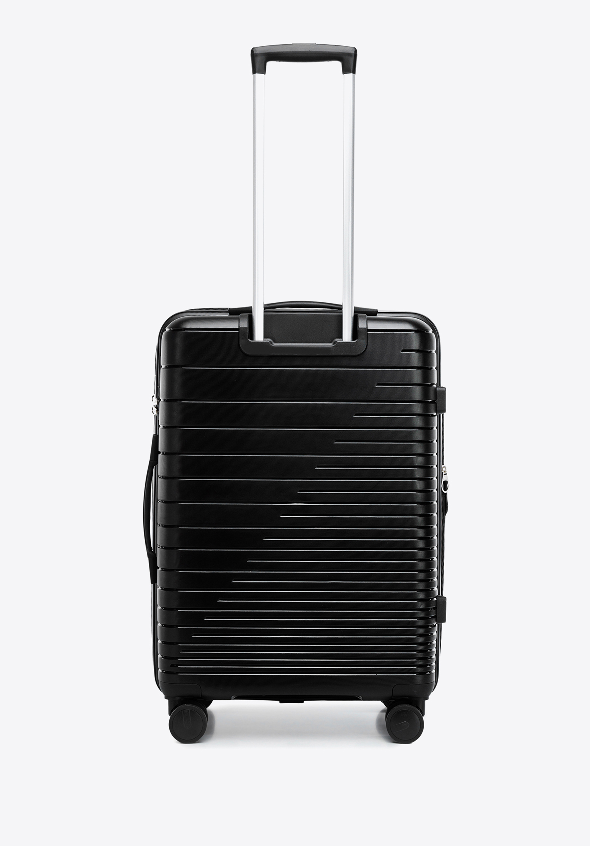 Ez a közepes méretű bőrönd tökéletesen kiegészíti minden utazását. Praktikus, stílusos és TSA zárral van felszerelve , amely biztosítja a tartalom biztonságát. Kiváló minőségű polipropilénből készült , így könnyű és nagyon rugalmas modell . A matt felületet fényes vízszintes csíkok domborítják, amelyek modern jelleget kölcsönöznek az egésznek. Belsejében két rekesz található , ahova könnyedén pakolhatsz. A négy dupla keréknek és a teleszkópos fogantyúnak köszönhetően kényelmes lesz a mozgatása. Ez a közepes méretű , fényes csíkokkal ellátott polipropilén bőrönd minden utazásrajongó számára remek választás.