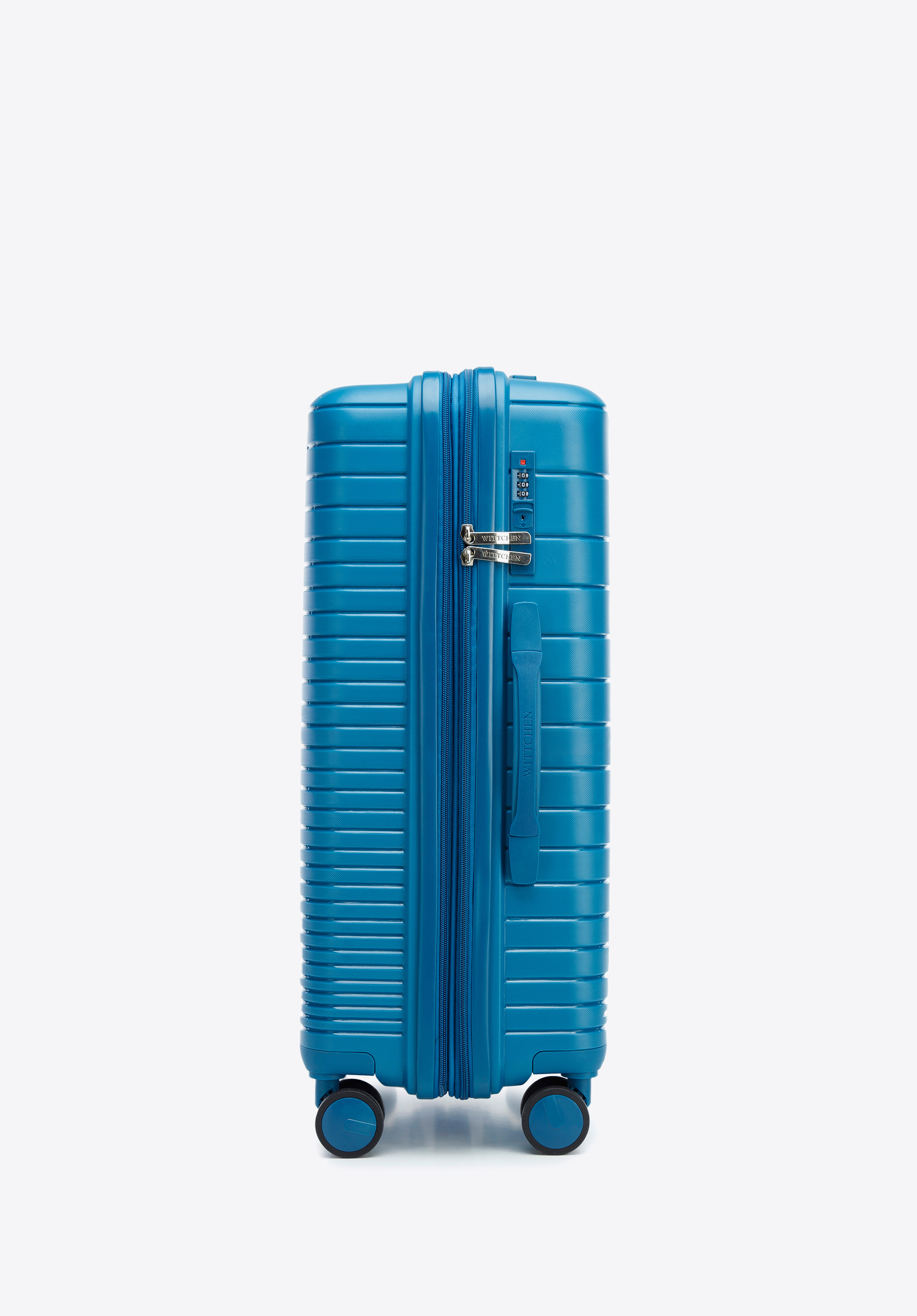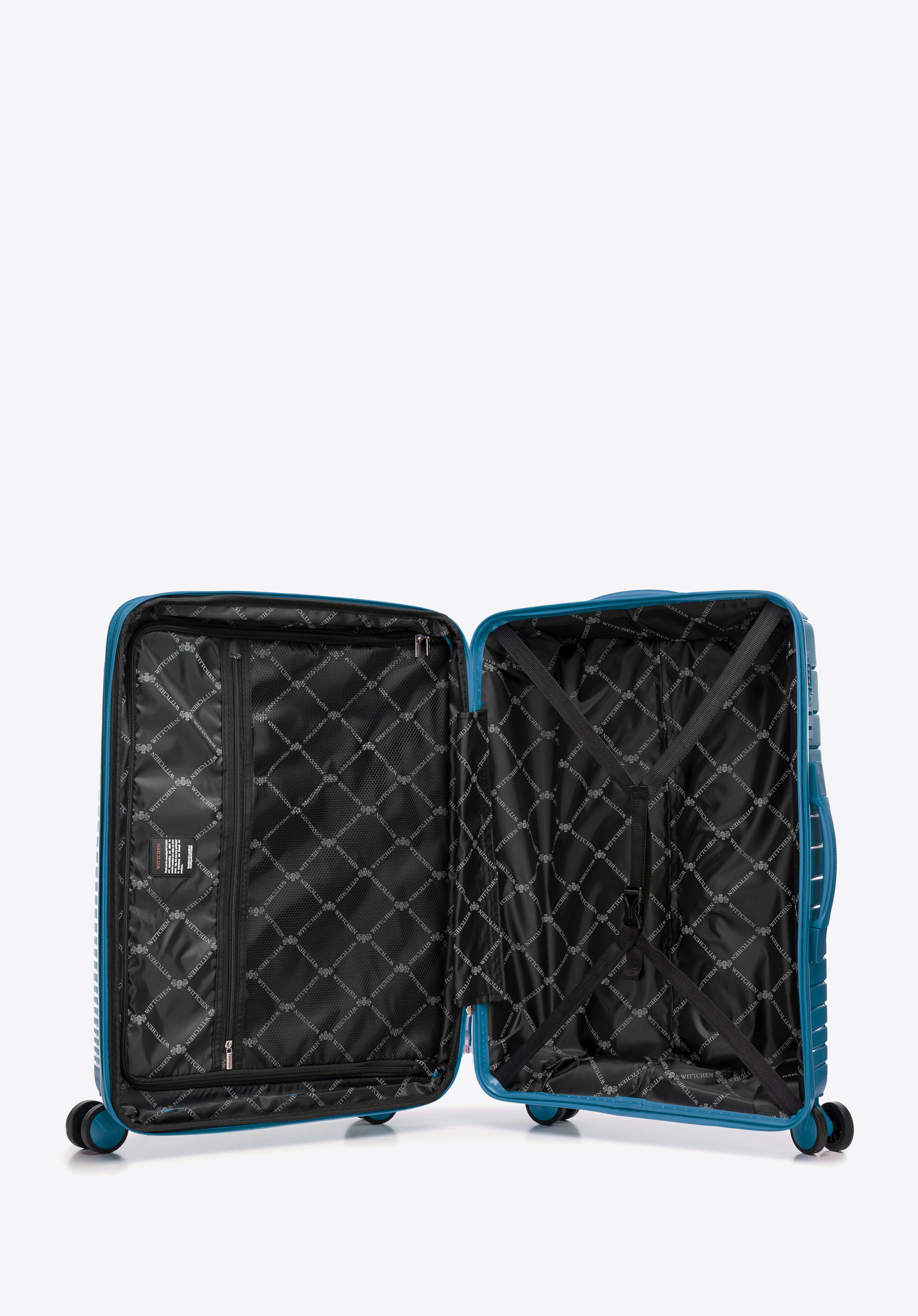 Ez a közepes méretű bőrönd tökéletesen kiegészíti minden utazását. Praktikus, stílusos és TSA zárral van felszerelve , amely biztosítja a tartalom biztonságát. Kiváló minőségű polipropilénből készült , így könnyű és nagyon rugalmas modell . A matt felületet fényes vízszintes csíkok domborítják, amelyek modern jelleget kölcsönöznek az egésznek. Belsejében két rekesz található , ahova könnyedén pakolhatsz. A négy dupla keréknek és a teleszkópos fogantyúnak köszönhetően kényelmes lesz a mozgatása. Ez a közepes méretű , fényes csíkokkal ellátott polipropilén bőrönd minden utazásrajongó számára remek választás.