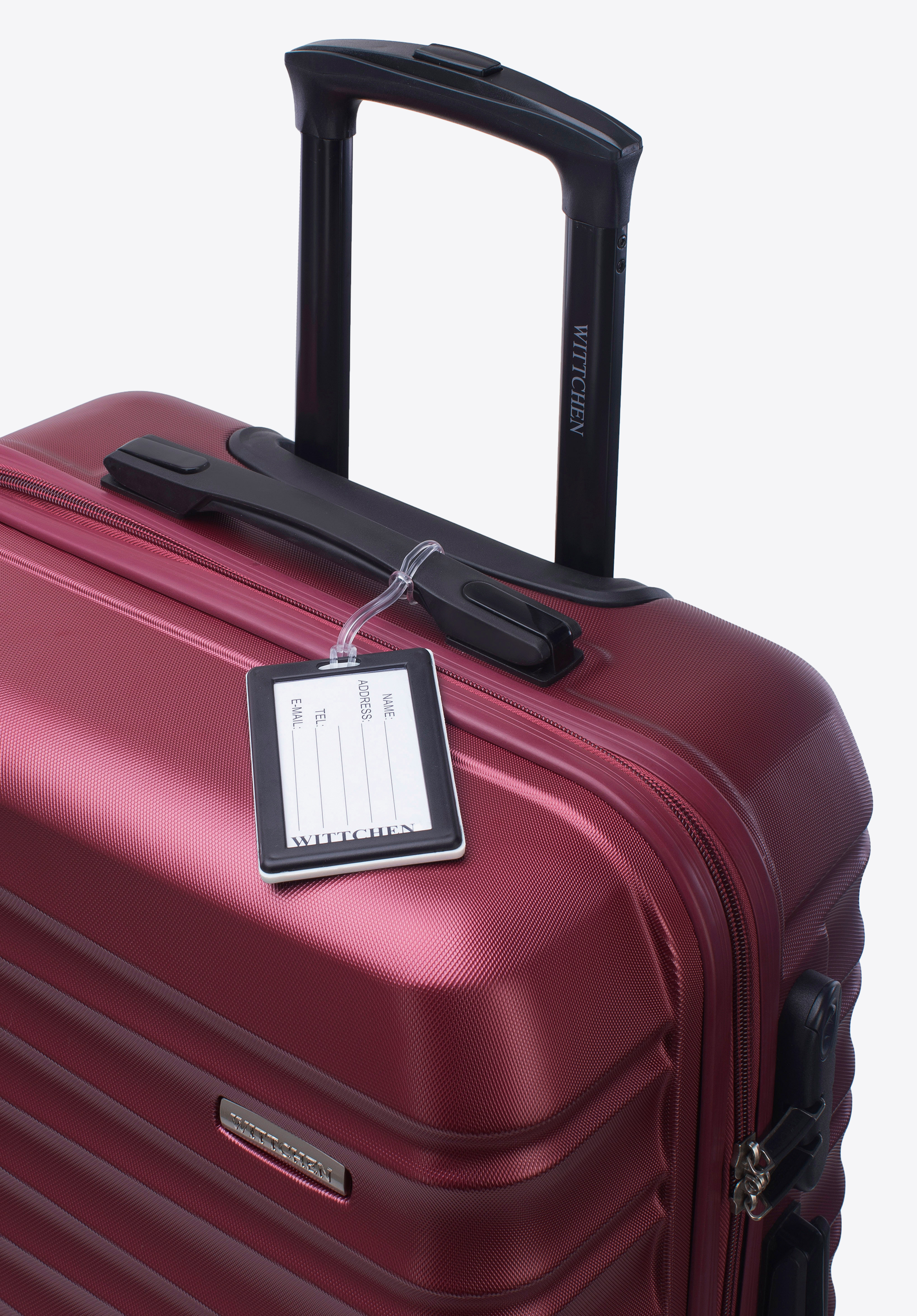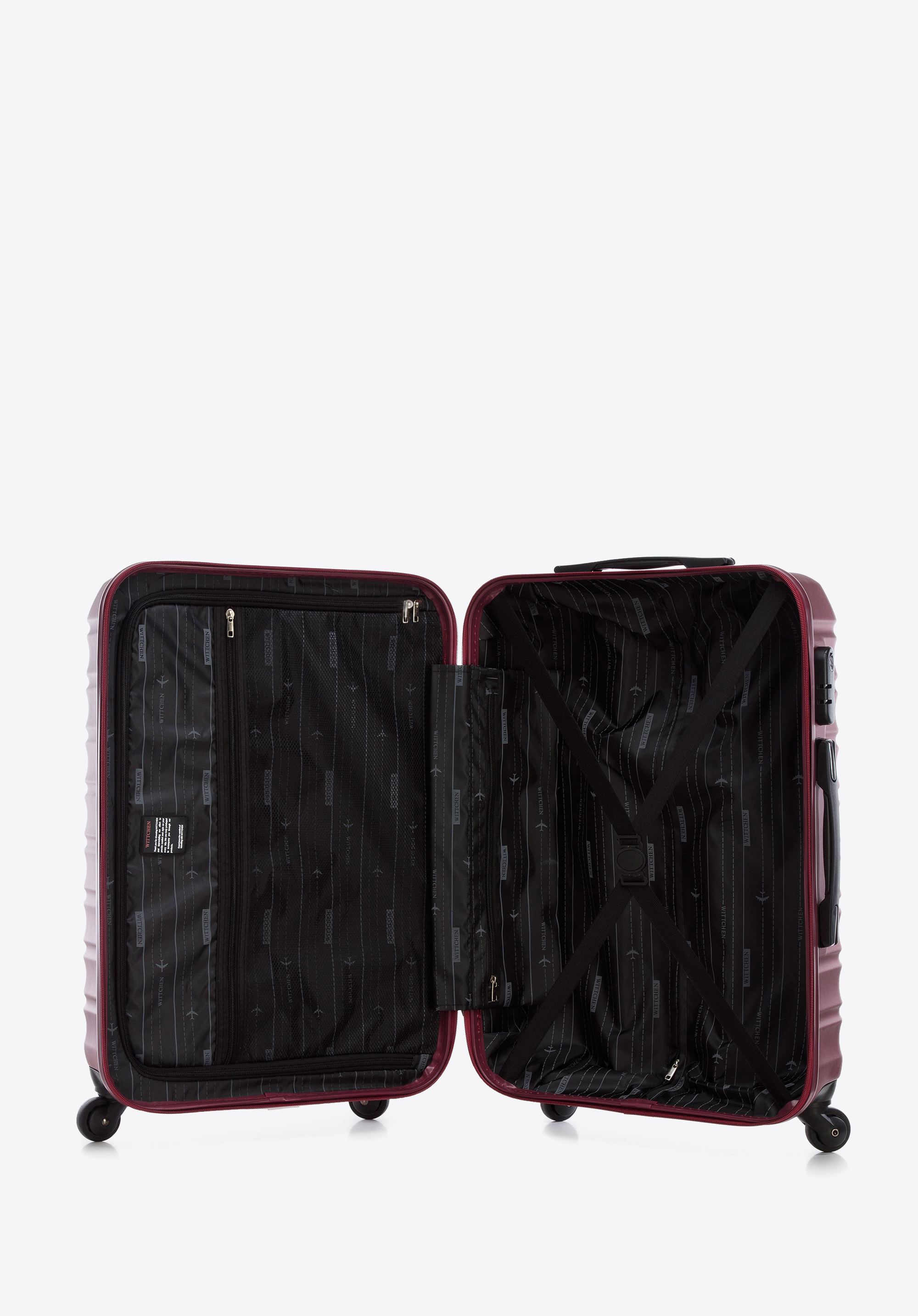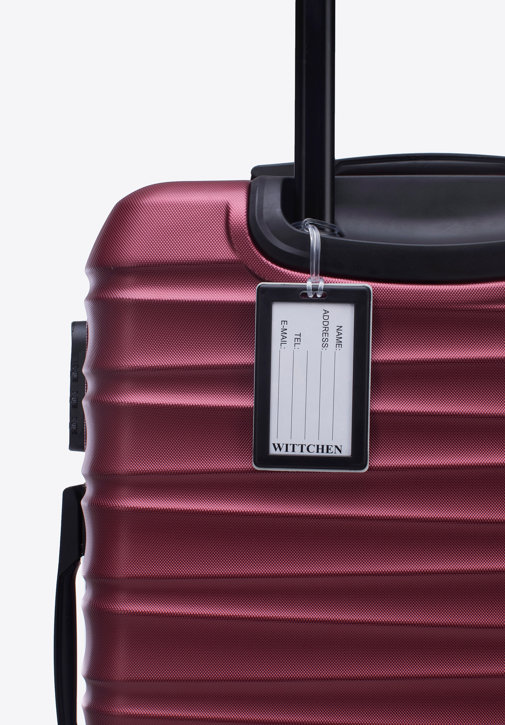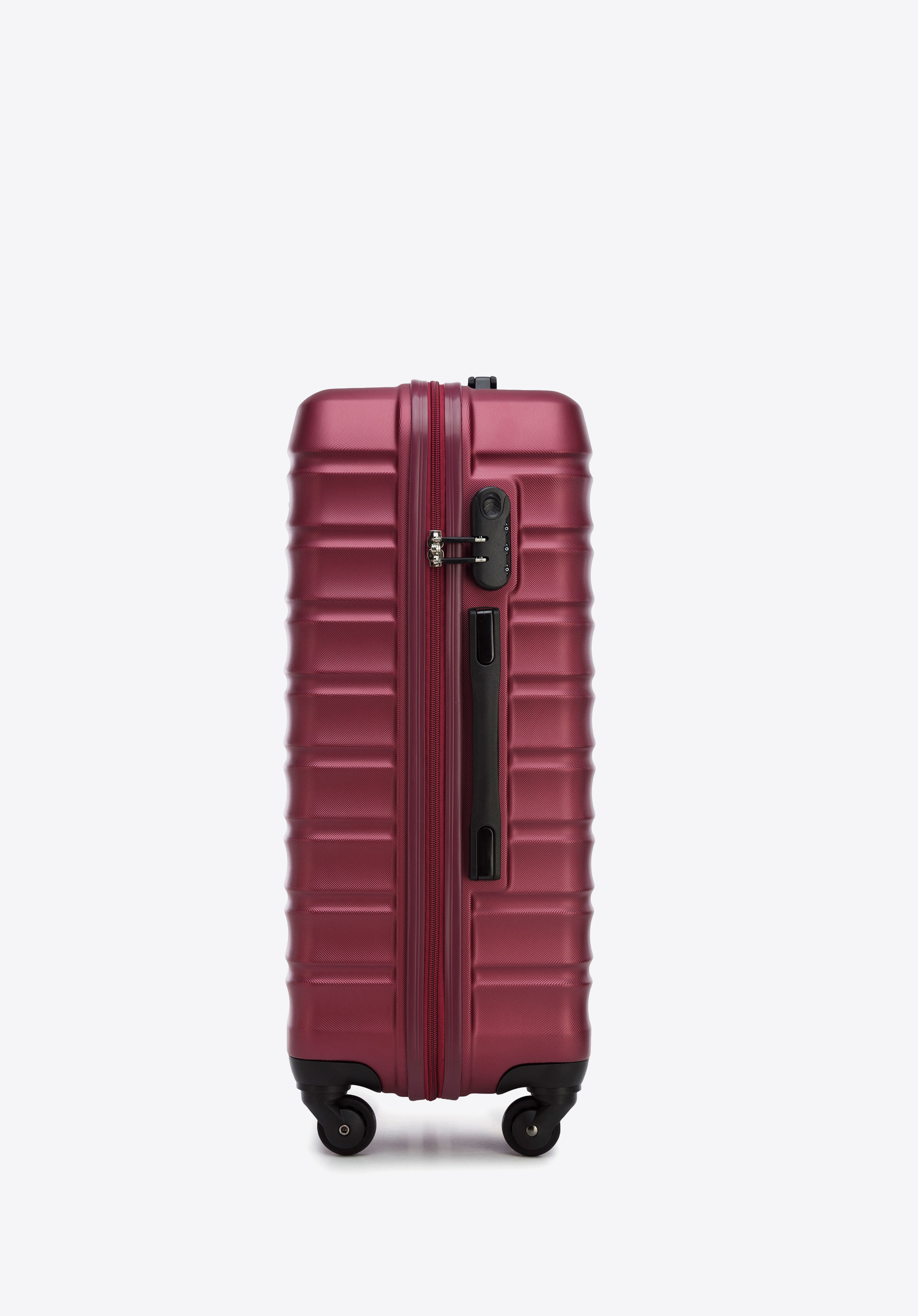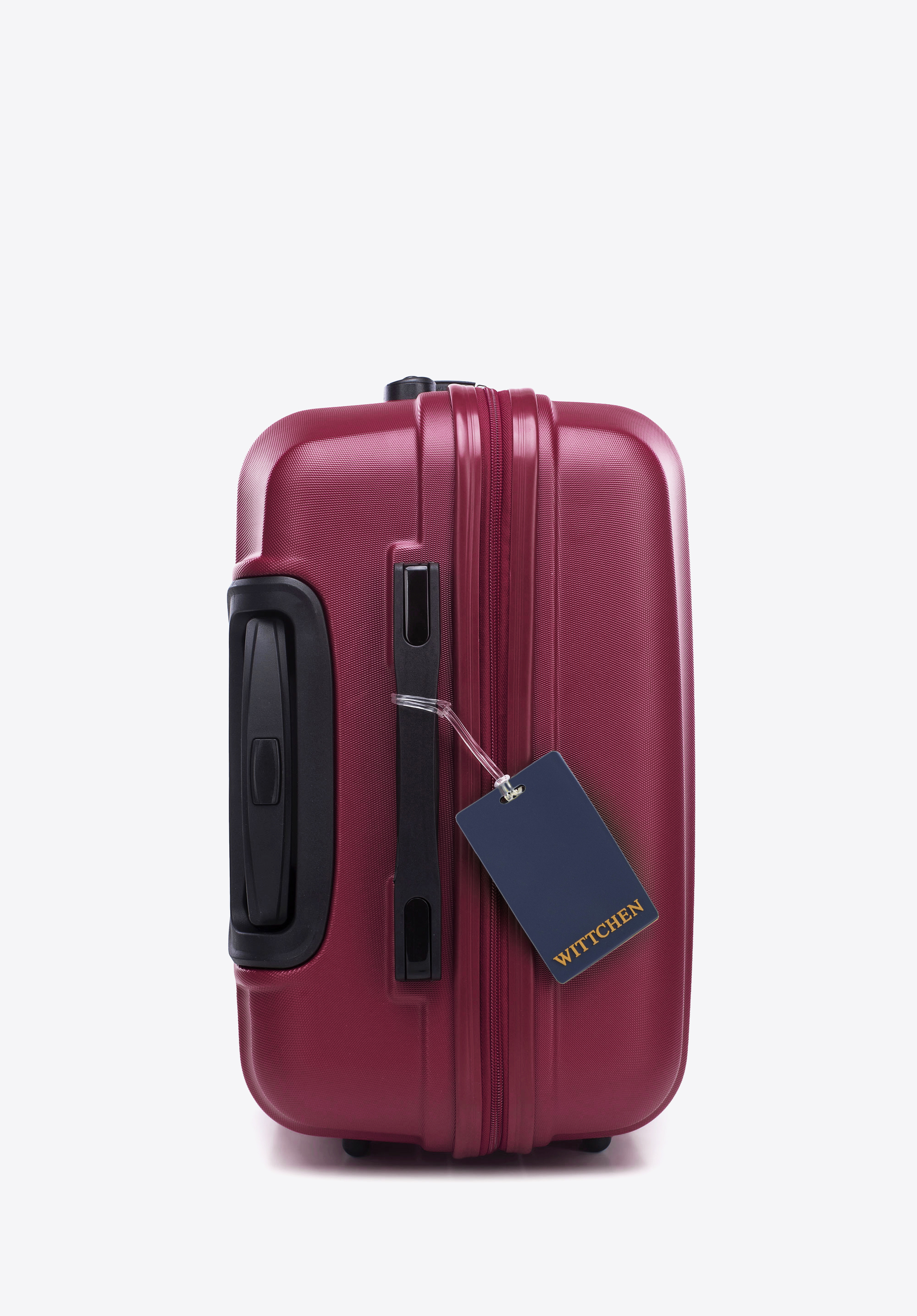 Közepes méretű ABS bőrönd logós azonosítóval, bordó