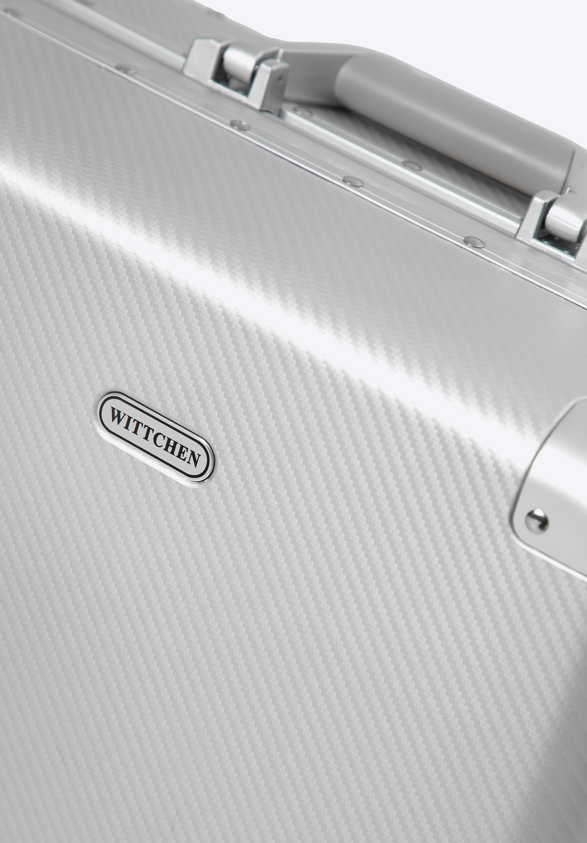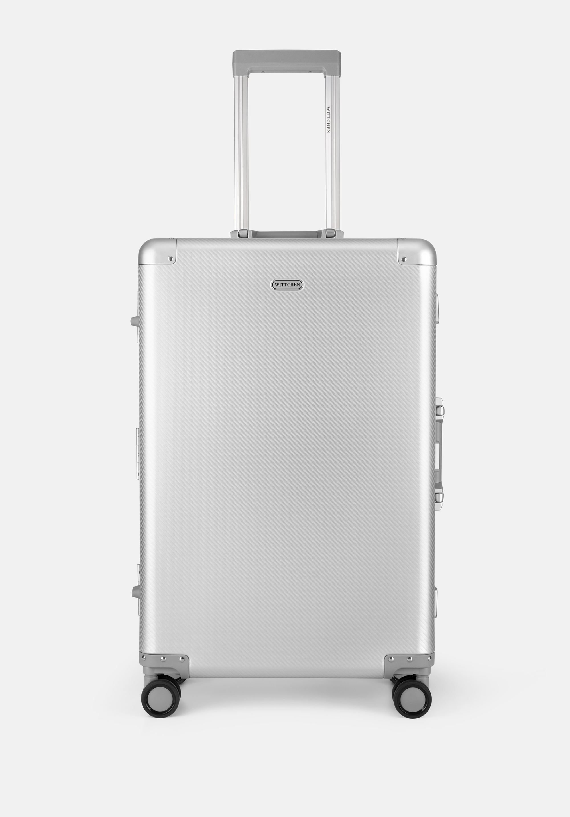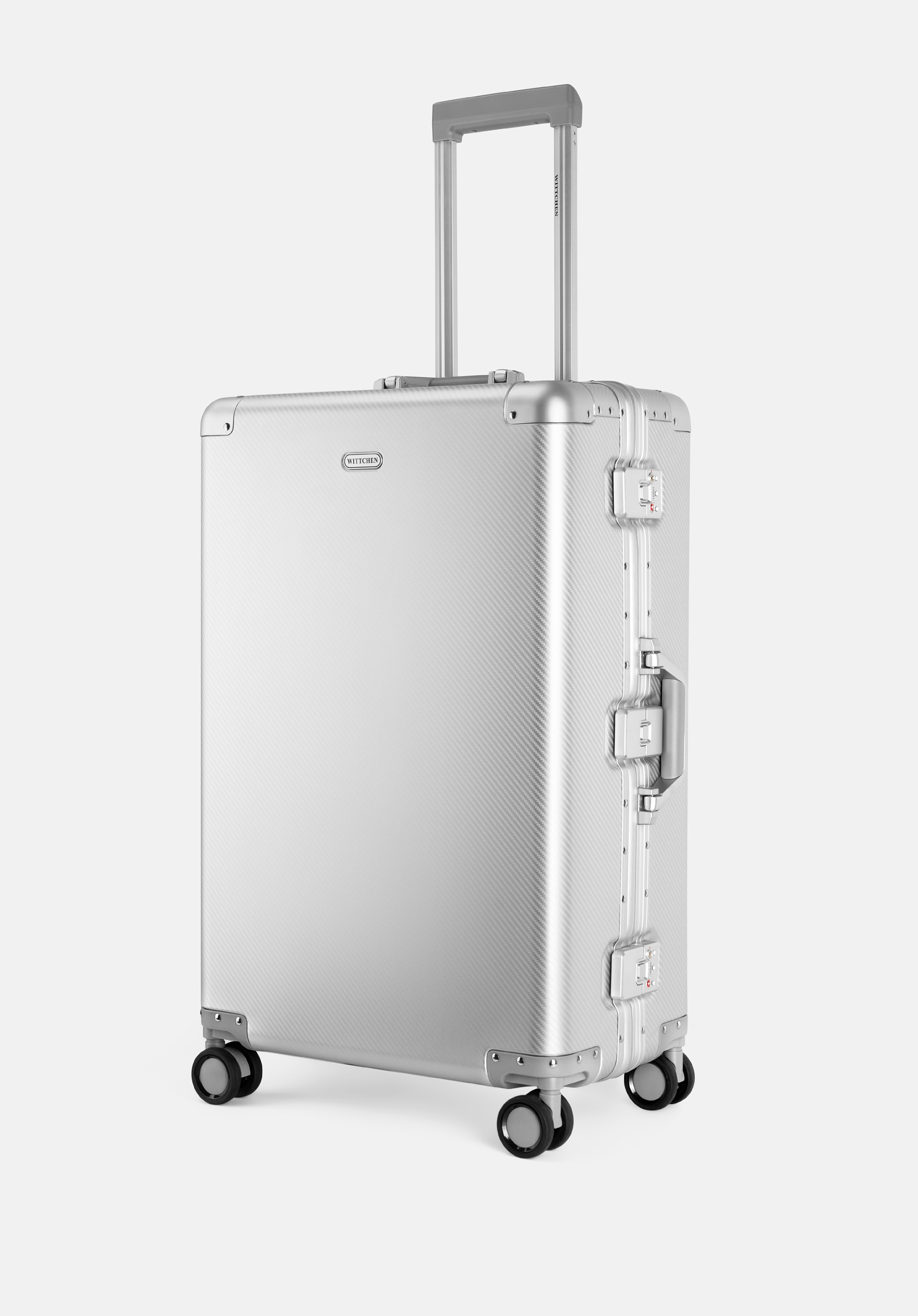 Fedezze fel az exkluzív, közepes méretű WITTCHEN bőröndöt, amely 100%-ban alumíniumból készült. A megerősített, szegecselt borítások és a precízen kidolgozott részletek különleges dizájnt biztosítanak, míg a masszív szerkezet megvédi a holmidat az utazás során. A négy dupla kerék és a teleszkópos fogantyú kényelmes mozgást tesz lehetővé, a további TSA zárak pedig garantálják a poggyász biztonságát.